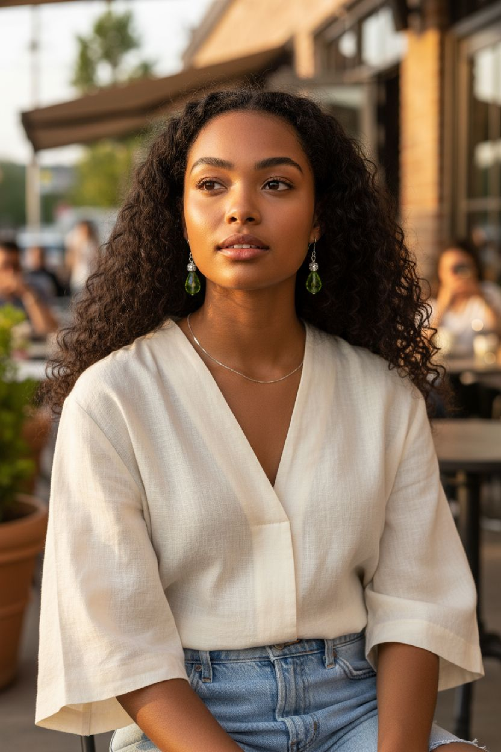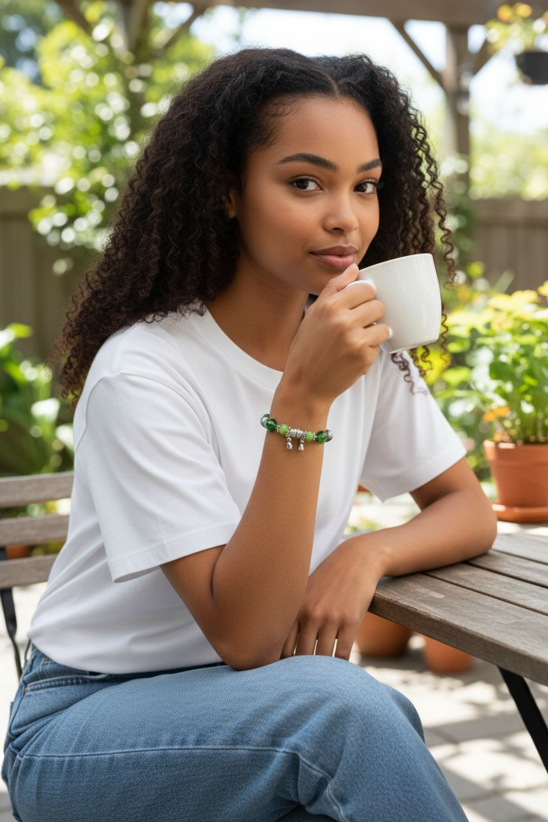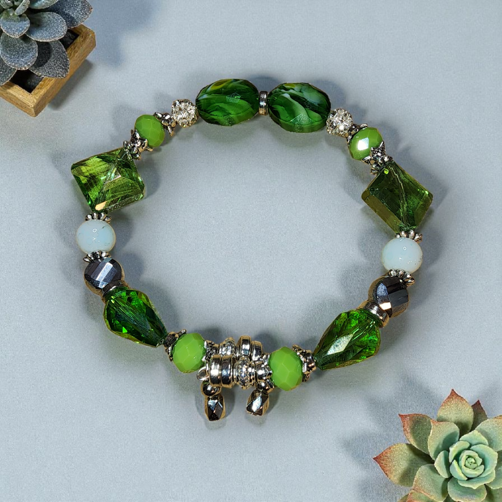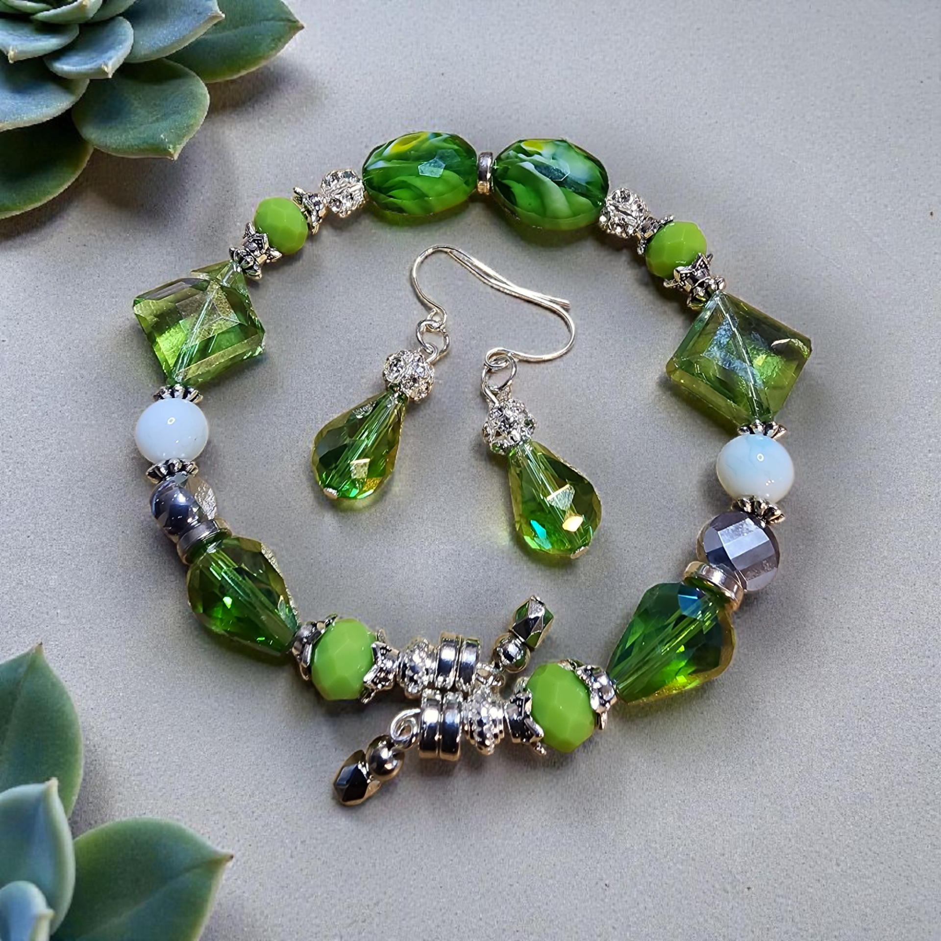 This elegant, handmade green glass jewelry set features a matching bracelet and earrings, creating a beautiful accessory perfect for someone special. The bohemian style design showcases stunning memory wire with silver-plated components, making this set both a practical and stylish addition to any jewelry collection. Stunning Green Glass Jewelry Set for Everyday Elegance • Handcrafted memory wire bracelet (7-7.5 inches) featuring various green glass beads and white opal-like stones • Matching drop earrings (1/2 inch length) with coordinating green glass beads on silver plated ear wires • Bohemian-inspired design perfect for casual outfits or adding a touch of color to formal attire • Silver plated components provide an elegant finish while complementing the vibrant green glass beads • Versatile gift idea for birthdays, anniversaries, or as a thoughtful present for someone who appreciates handmade jewelry