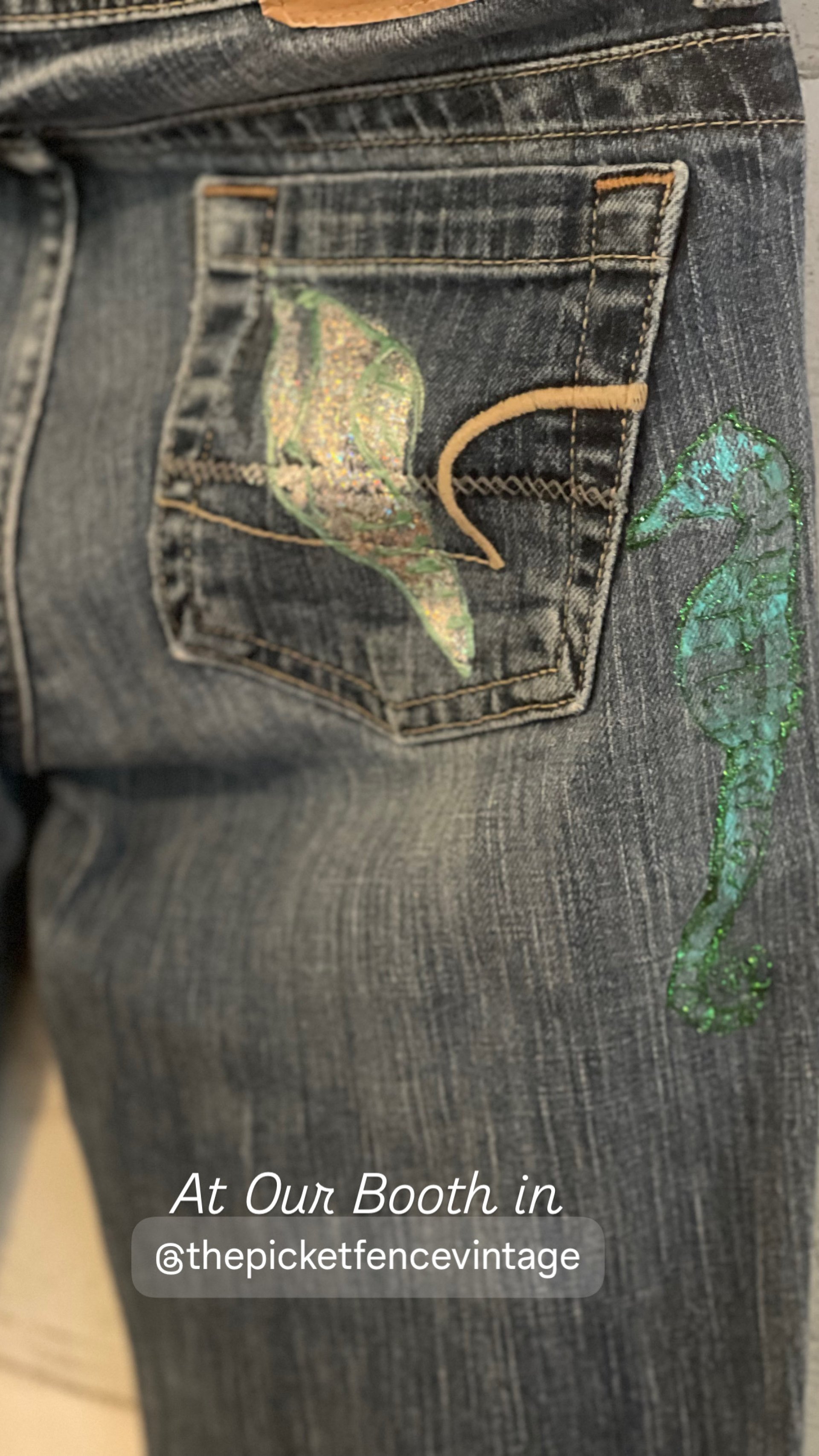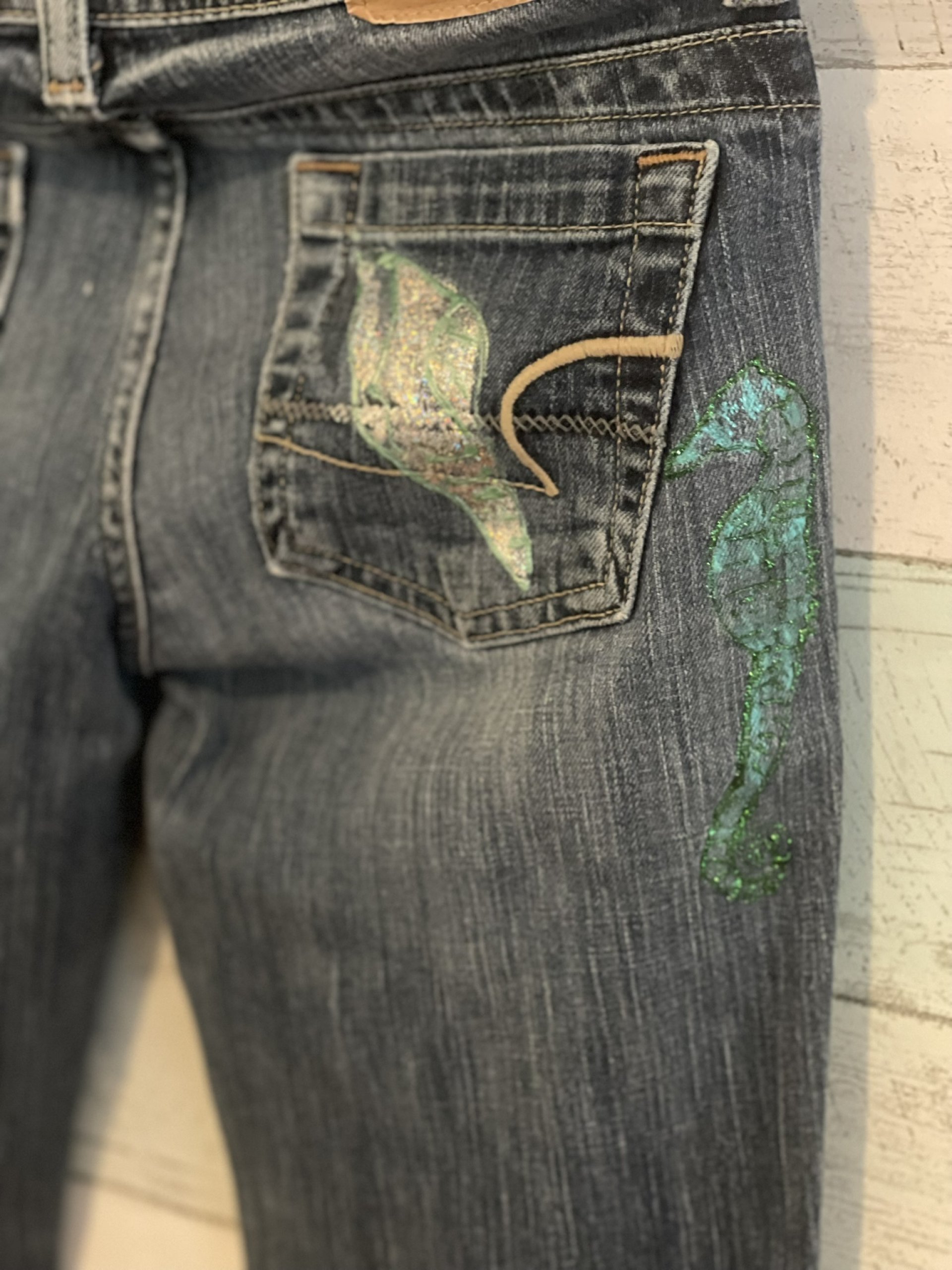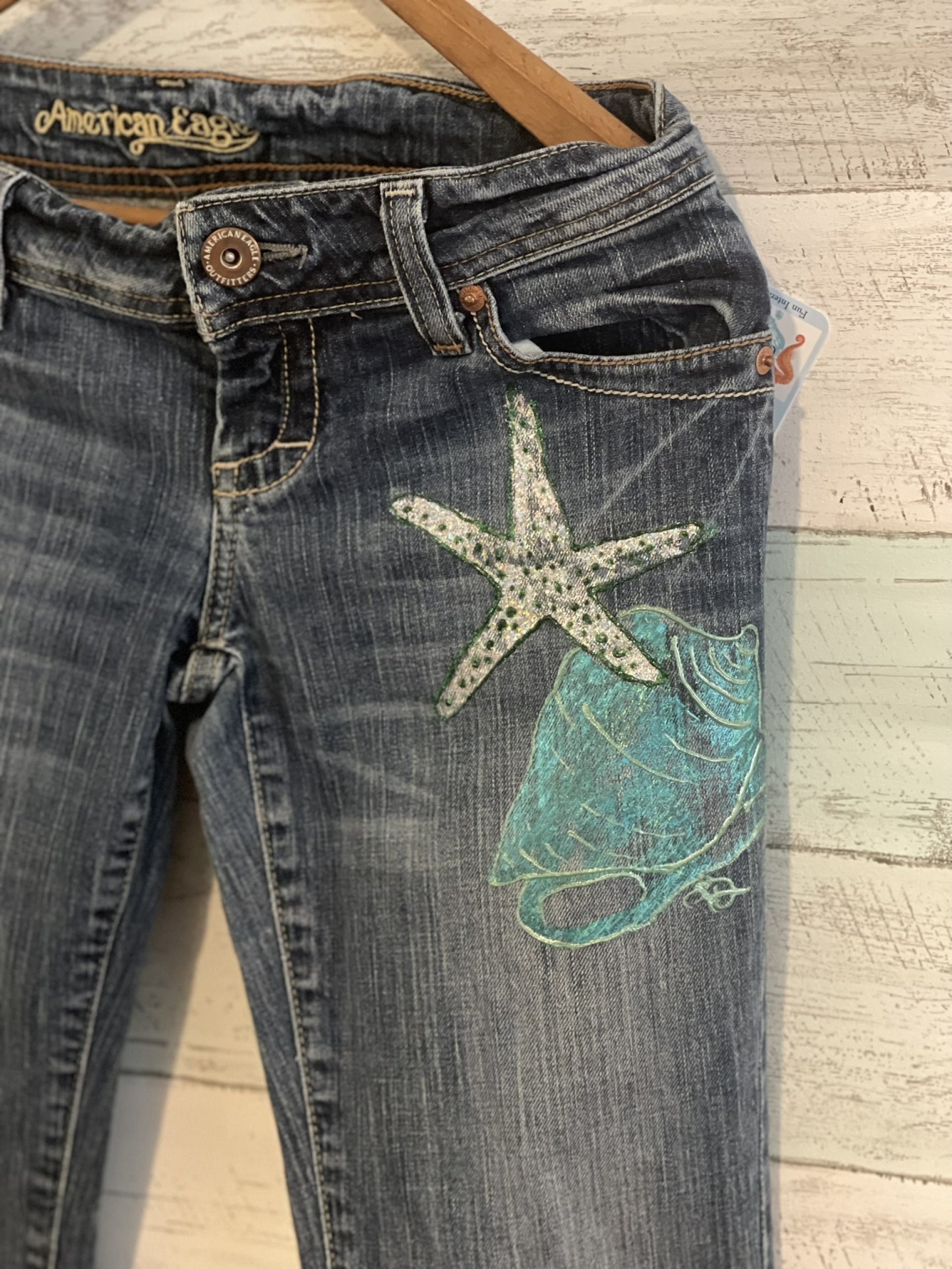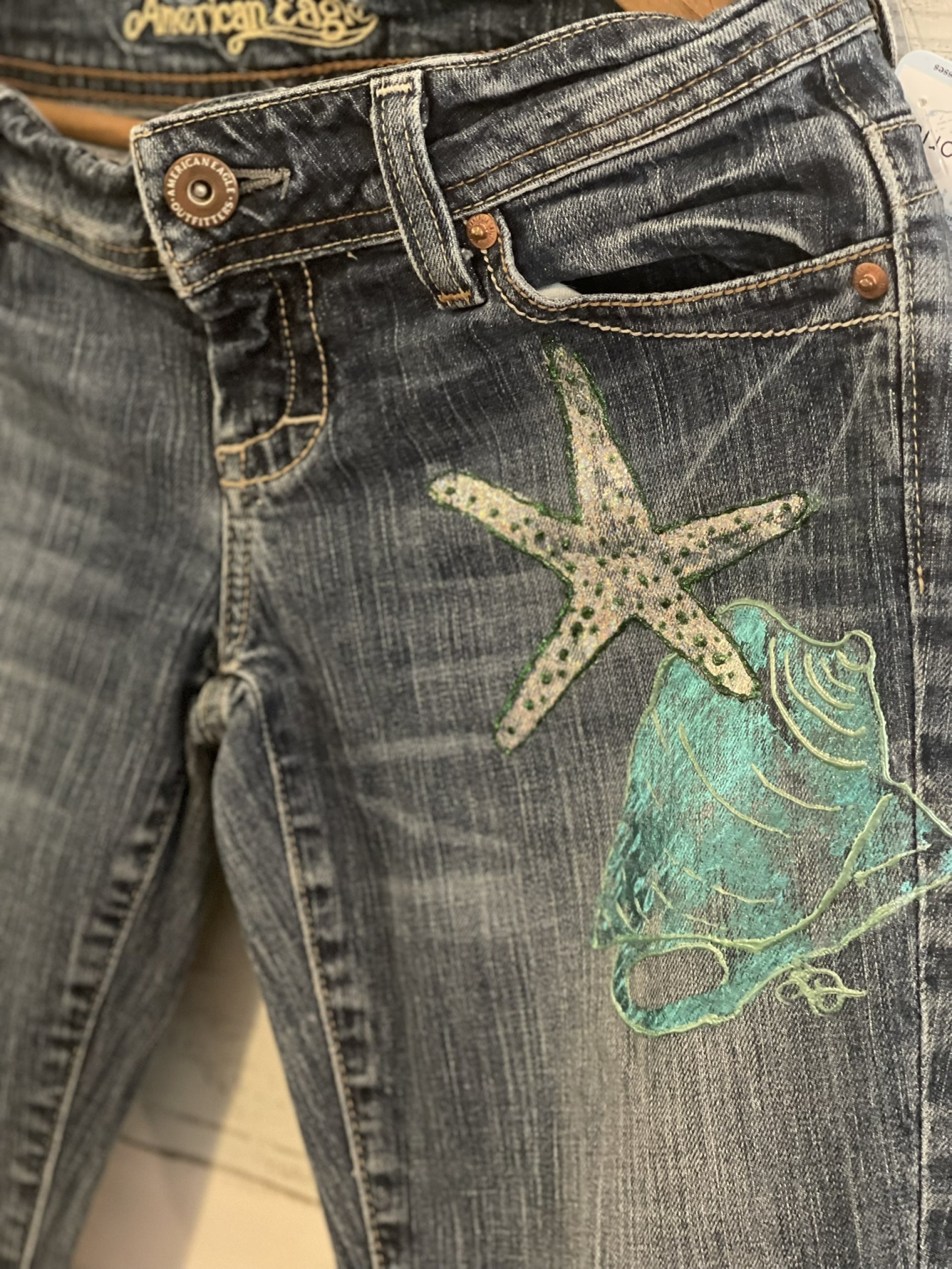 Hand painted and foiled ladies jeans. I thrifted these size 4 American Eagle low waist boyfriend jeans, washed and hand stamped, foiled, painted... with various nautical designs like starfish, seahorse, shells...