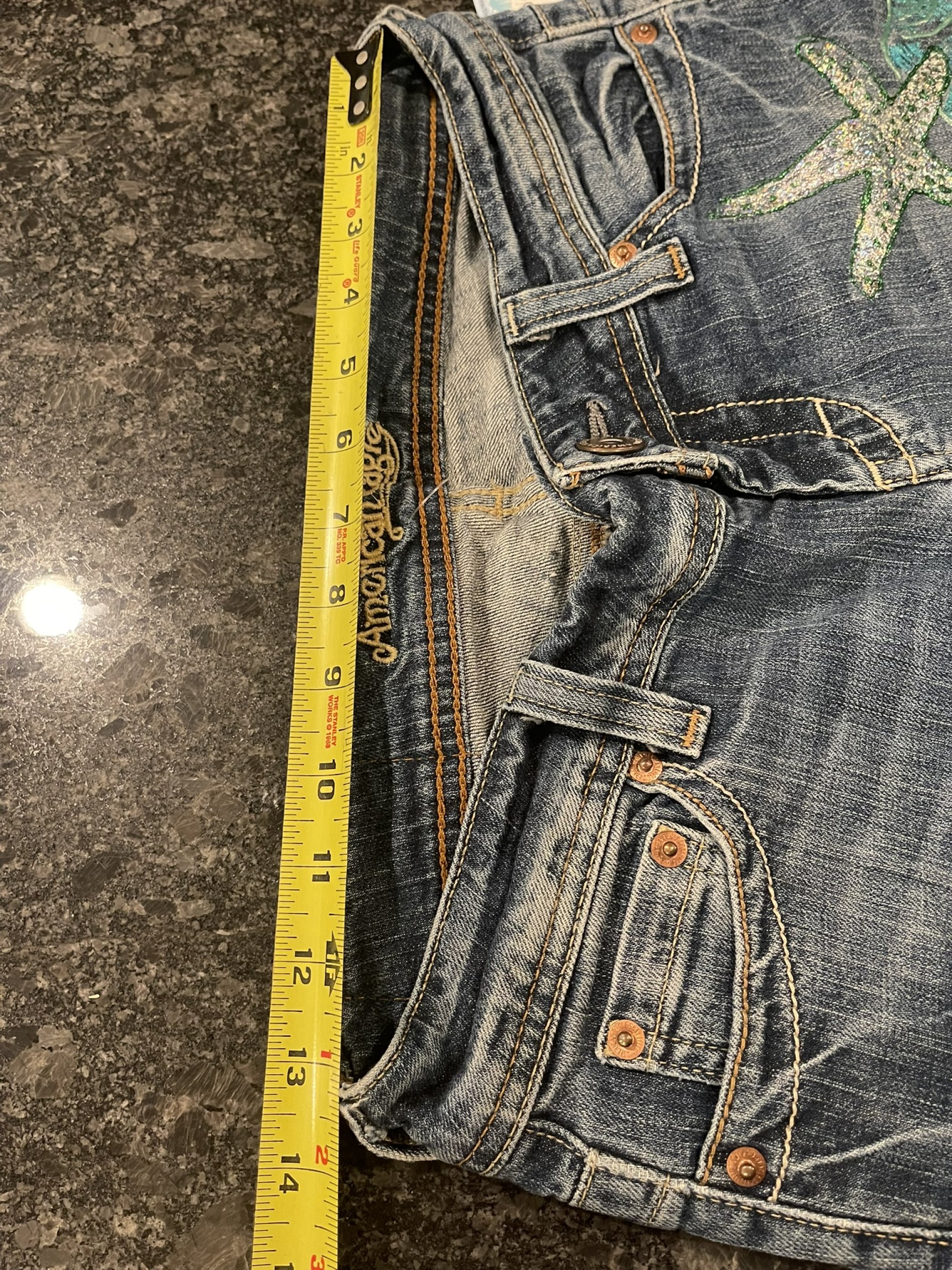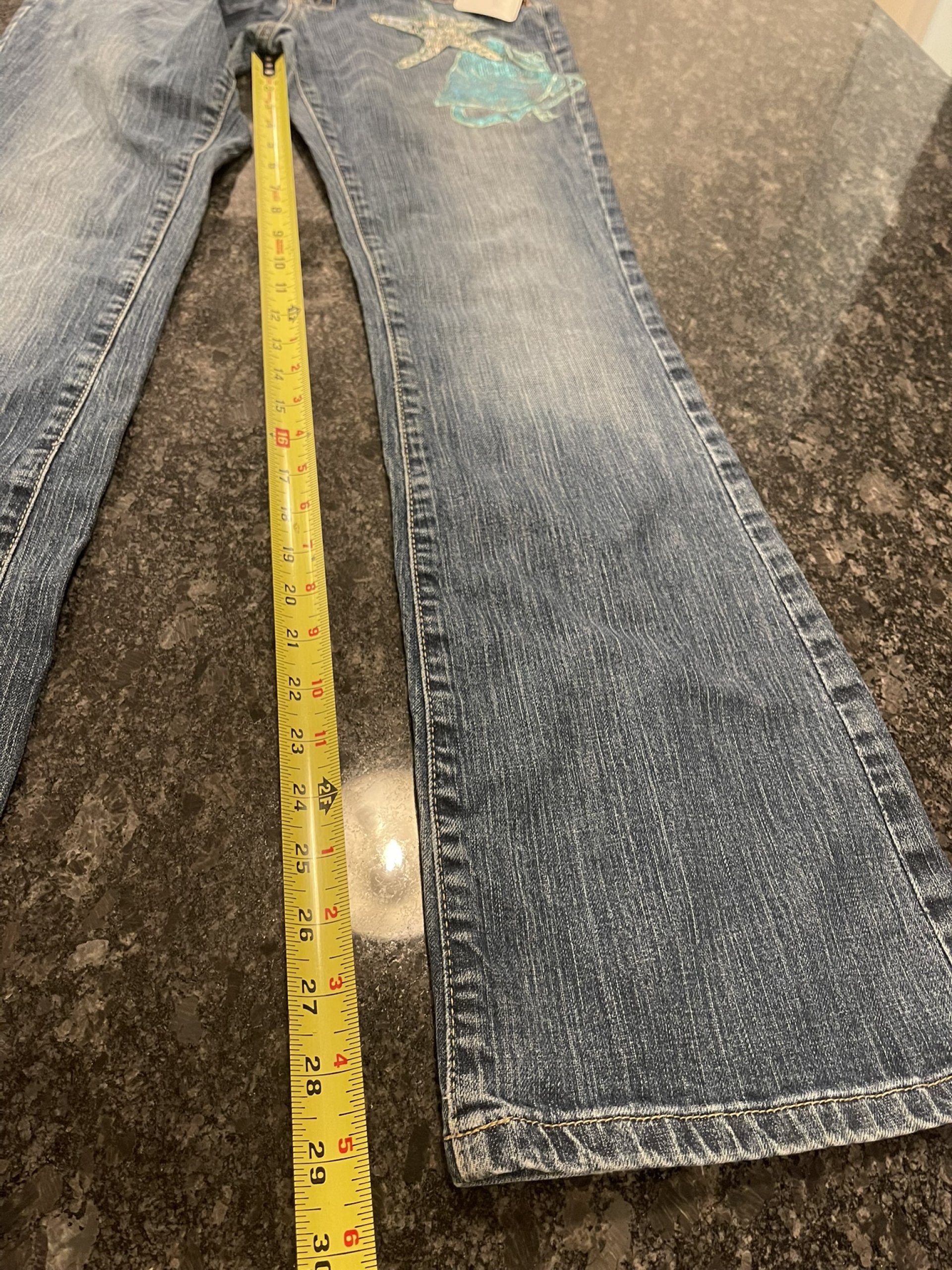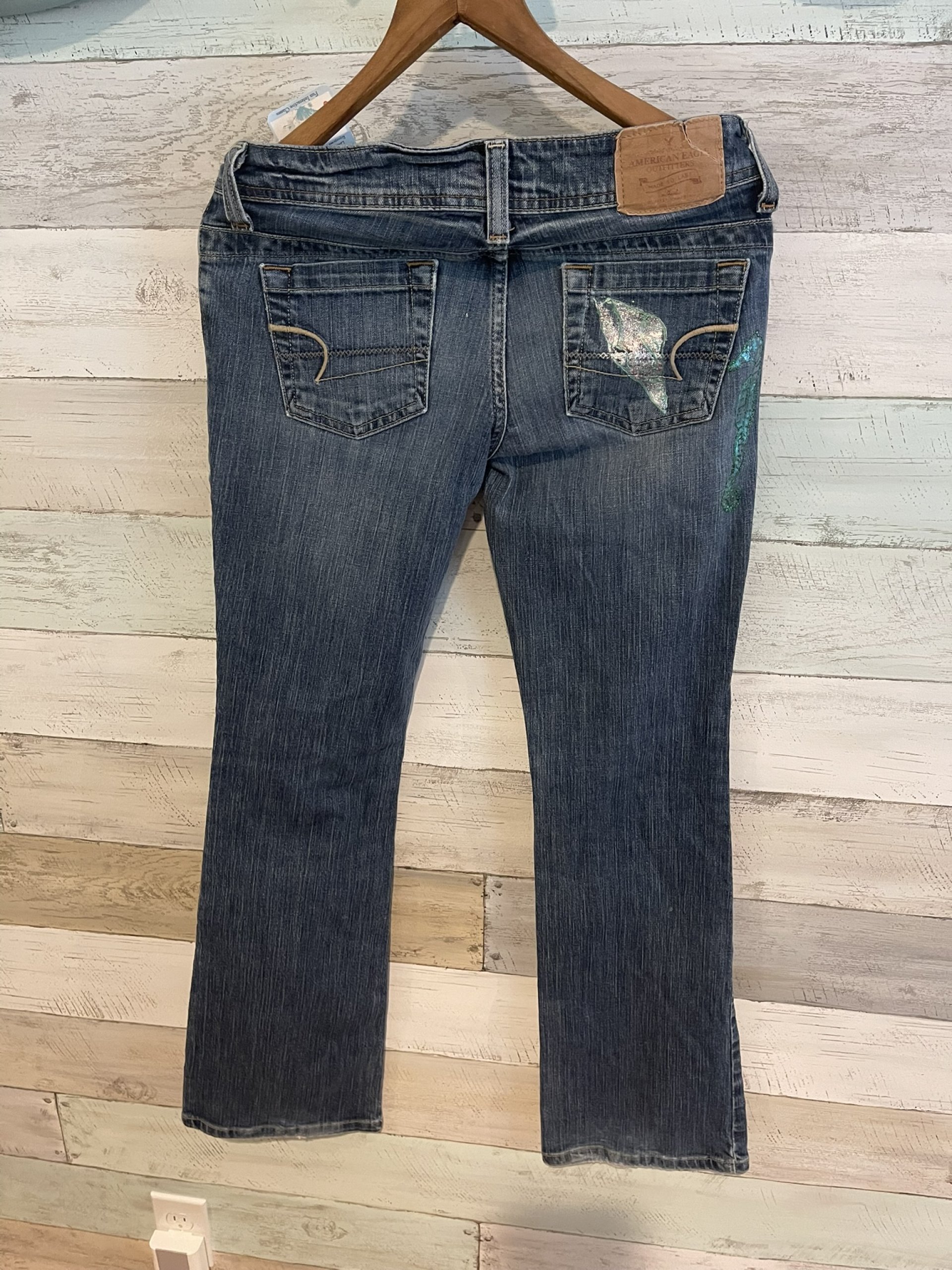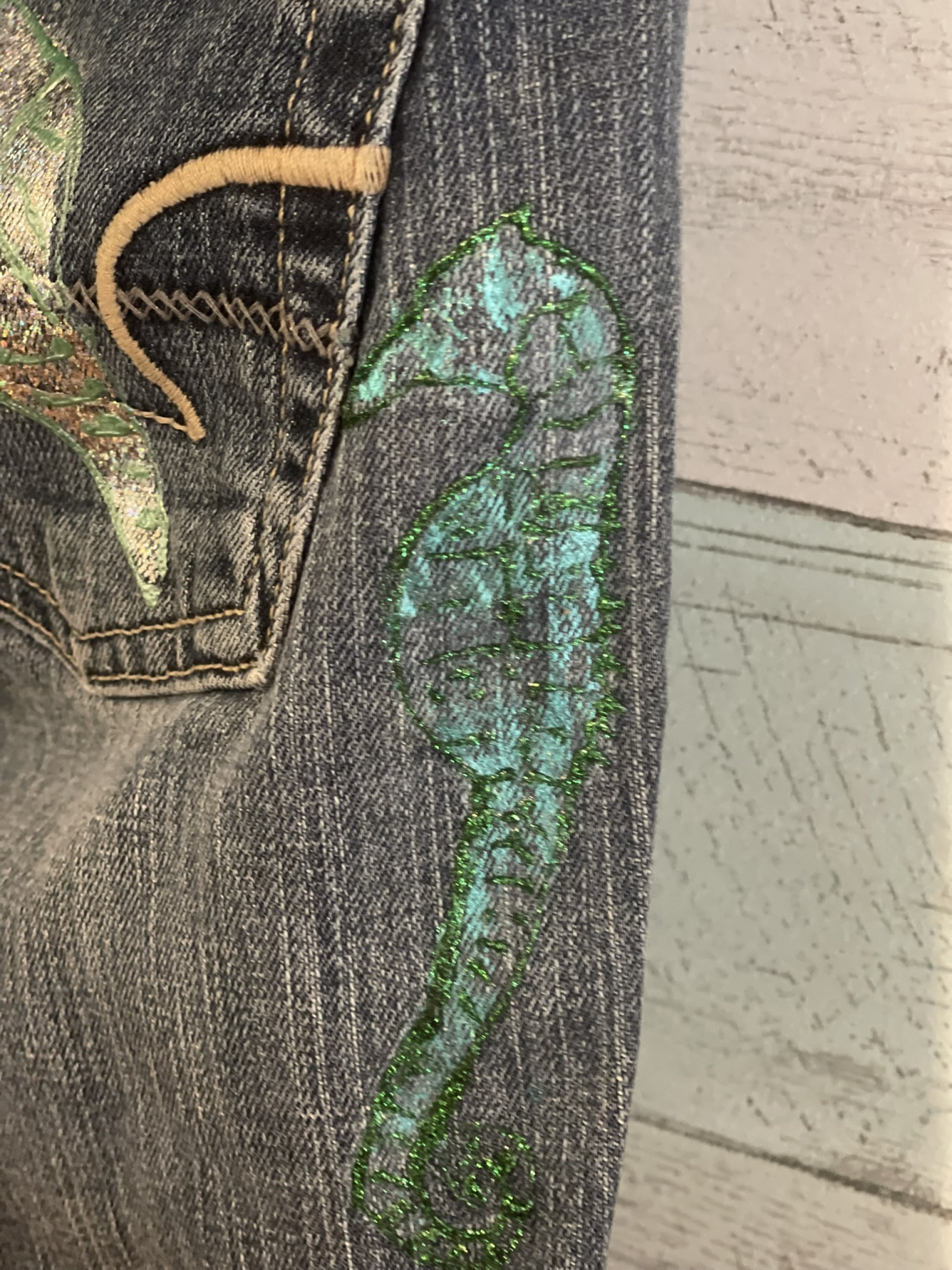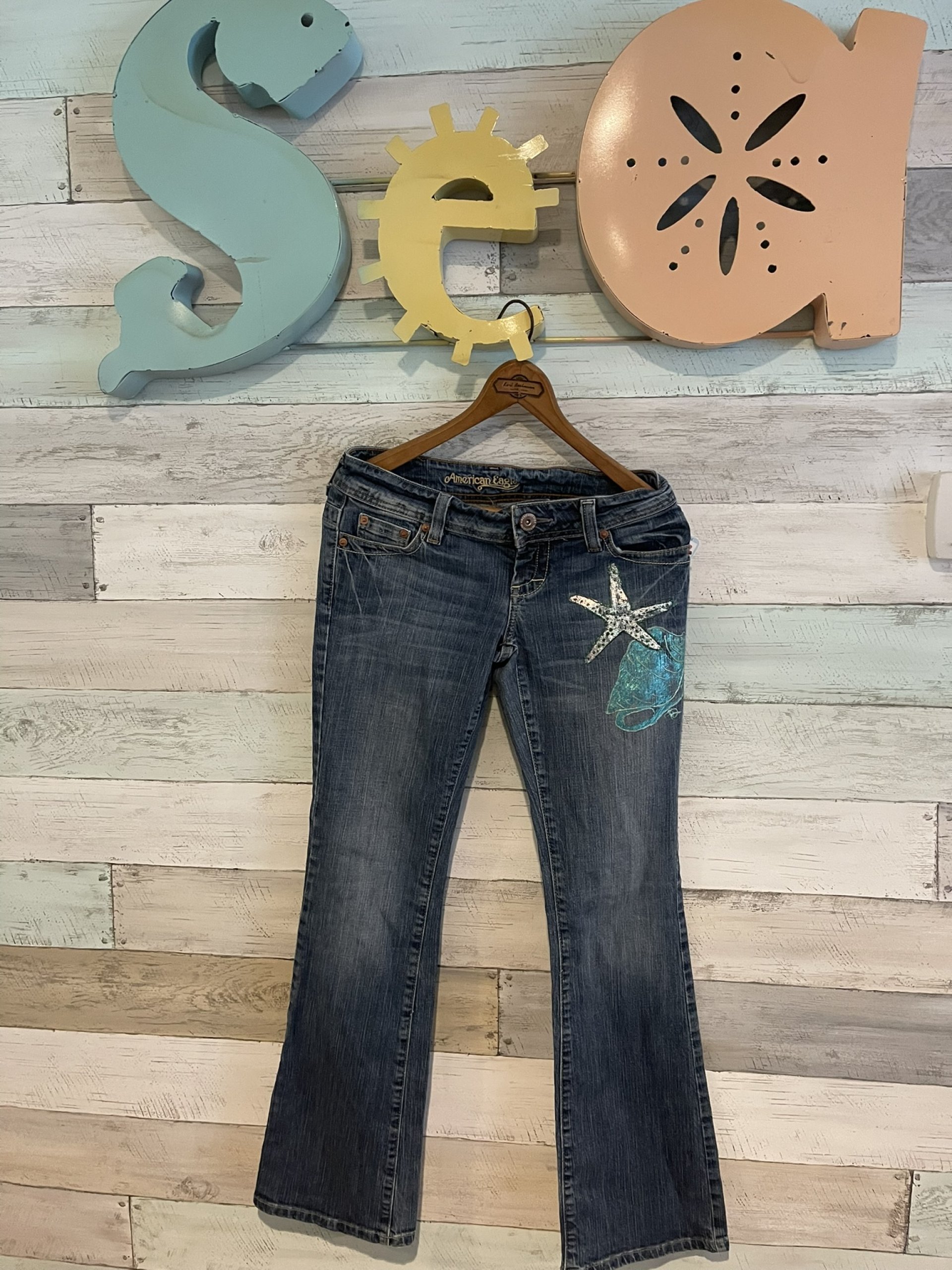 Hand painted and foiled ladies jeans. I thrifted these size 4 American Eagle low waist boyfriend jeans, washed and hand stamped, foiled, painted... with various nautical designs like starfish, seahorse, shells...