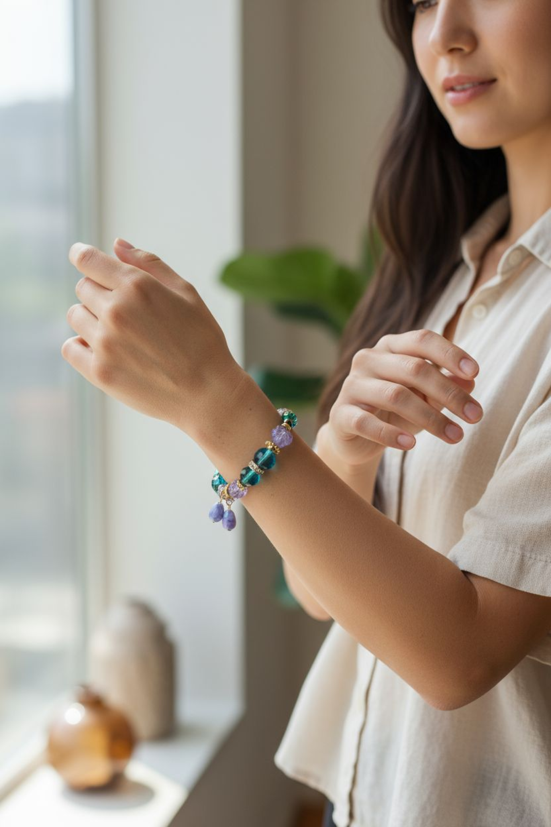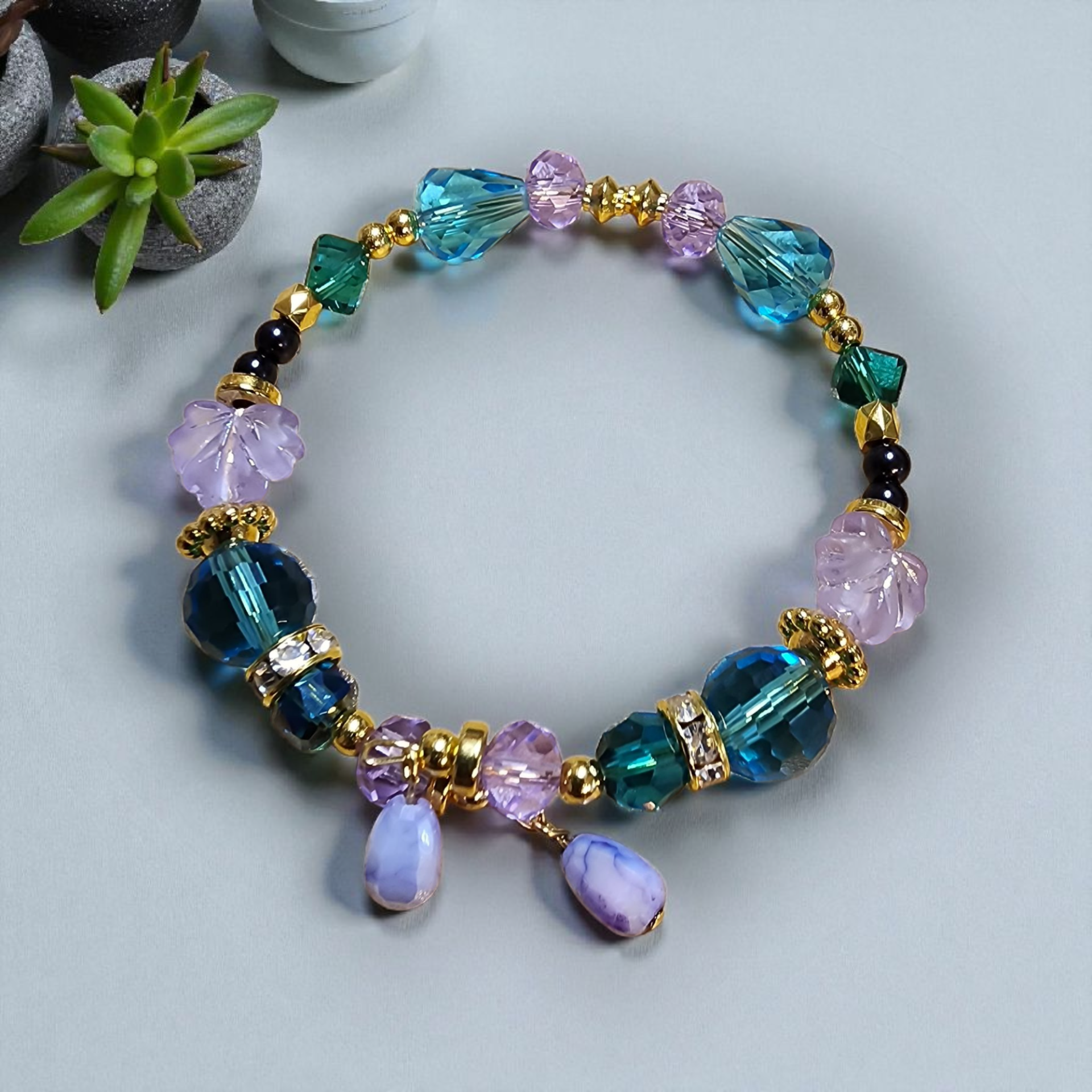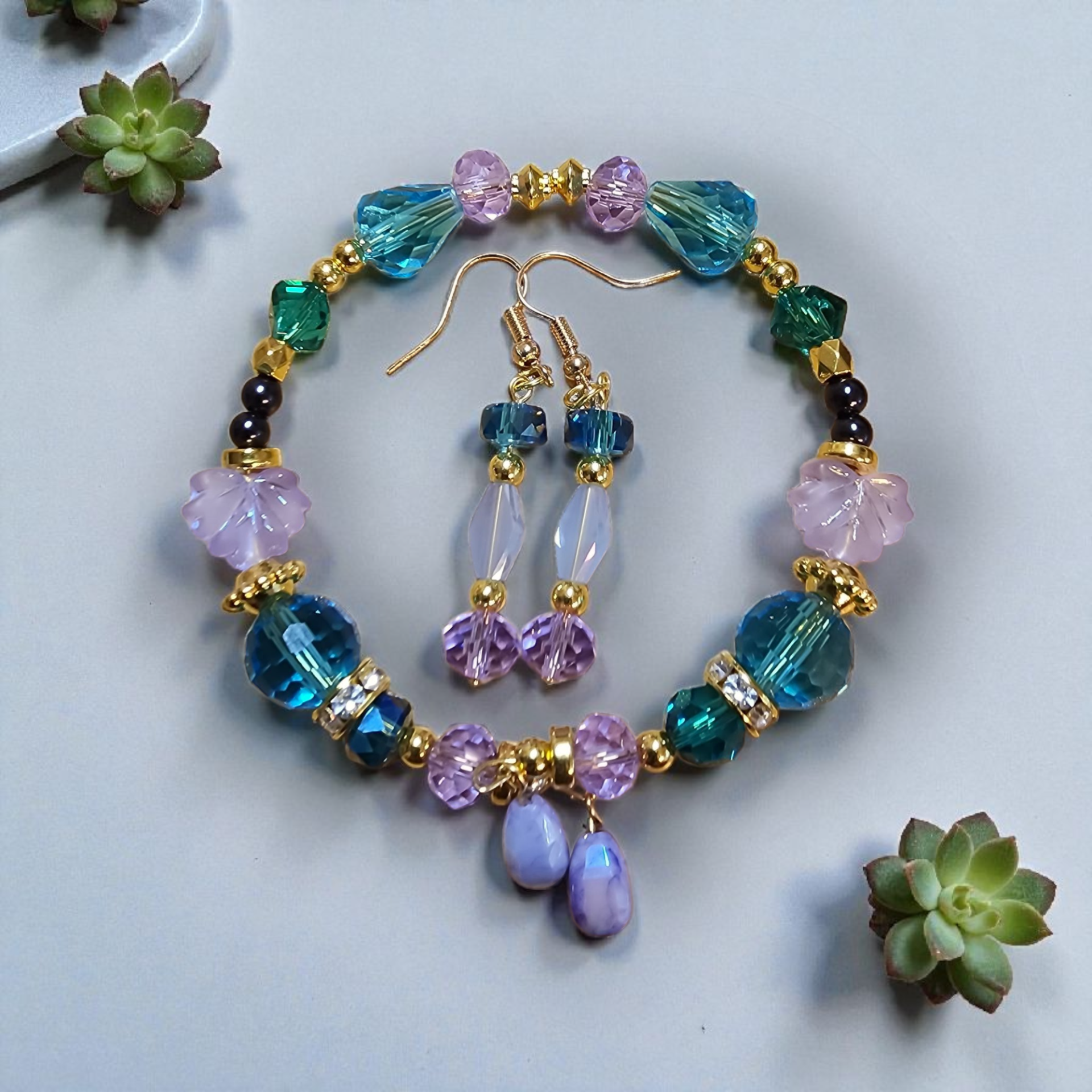 This handmade jewelry set features matching earrings and bracelet combination crafted with stunning blue and purple glass beads complemented by elegant gold-plated findings and beautiful floral details. The unique design showcases opalescent teardrop accents alongside teal and lavender glass beads, creating a one-of-a-kind accessory with a bohemian style that's both colorful and sophisticated. Exquisite Handcrafted Jewelry Set for the Discerning Collector • Meticulously handcrafted set featuring a memory wire bracelet and matching dangle earrings • Stunning color palette of blue, teal, purple, and lavender glass beads that catch and reflect light beautifully • Premium gold plated components including memory wire, findings, and comfortable ear wires • Unique carved lavender flower beads and shimmering opalescent teardrop charms create visual interest • Versatile bohemian-inspired design perfect for both casual everyday wear and special occasions