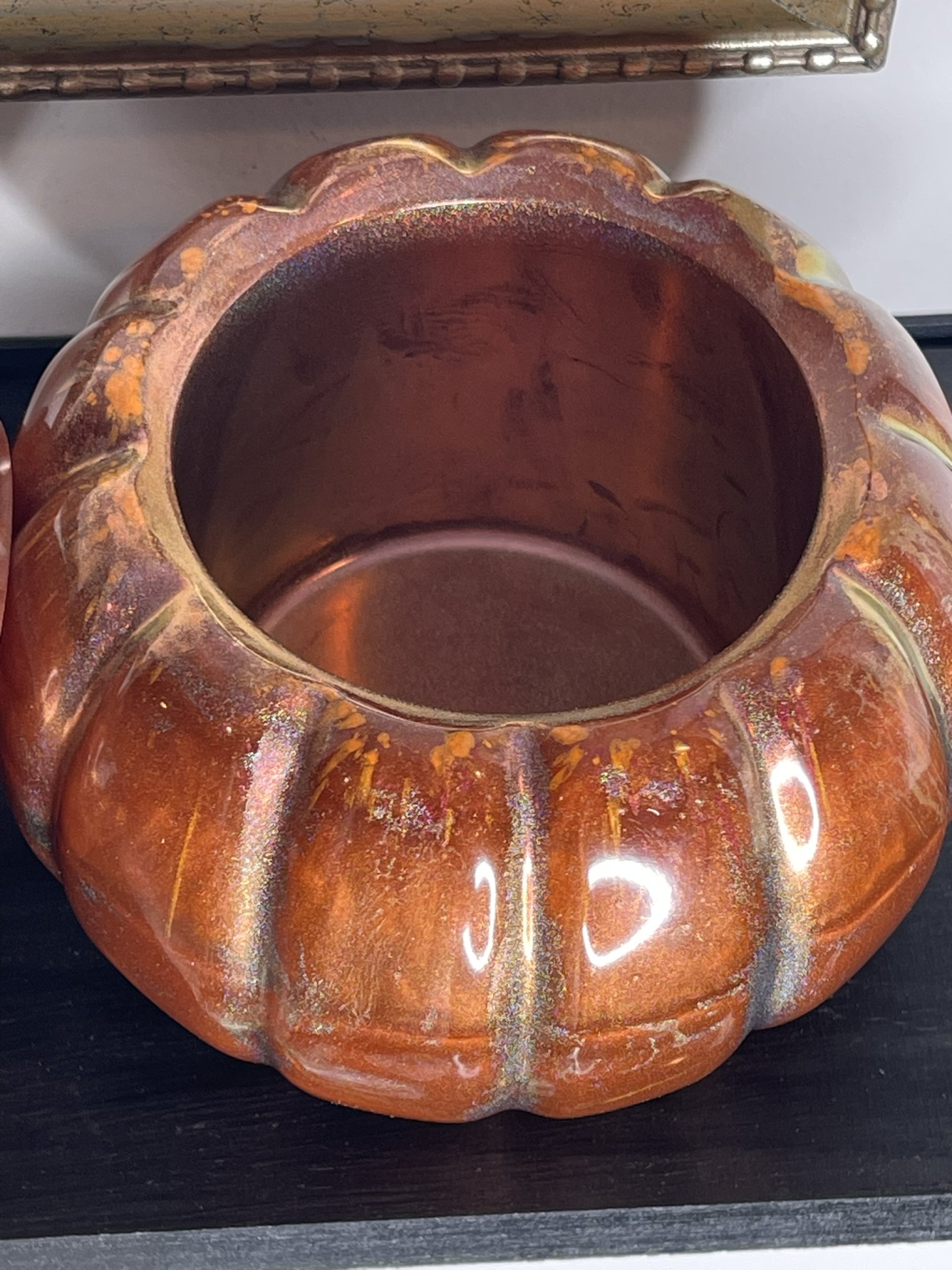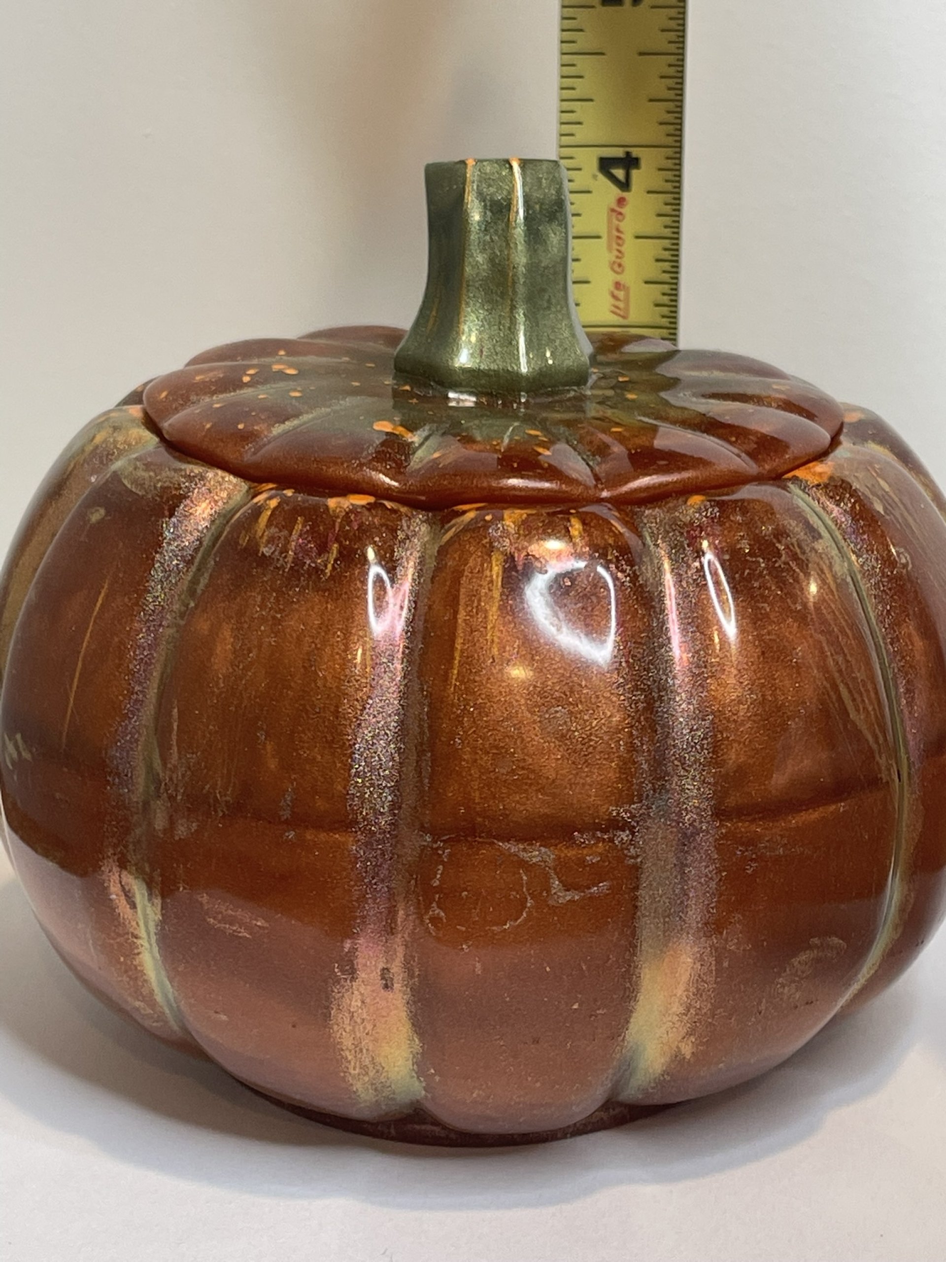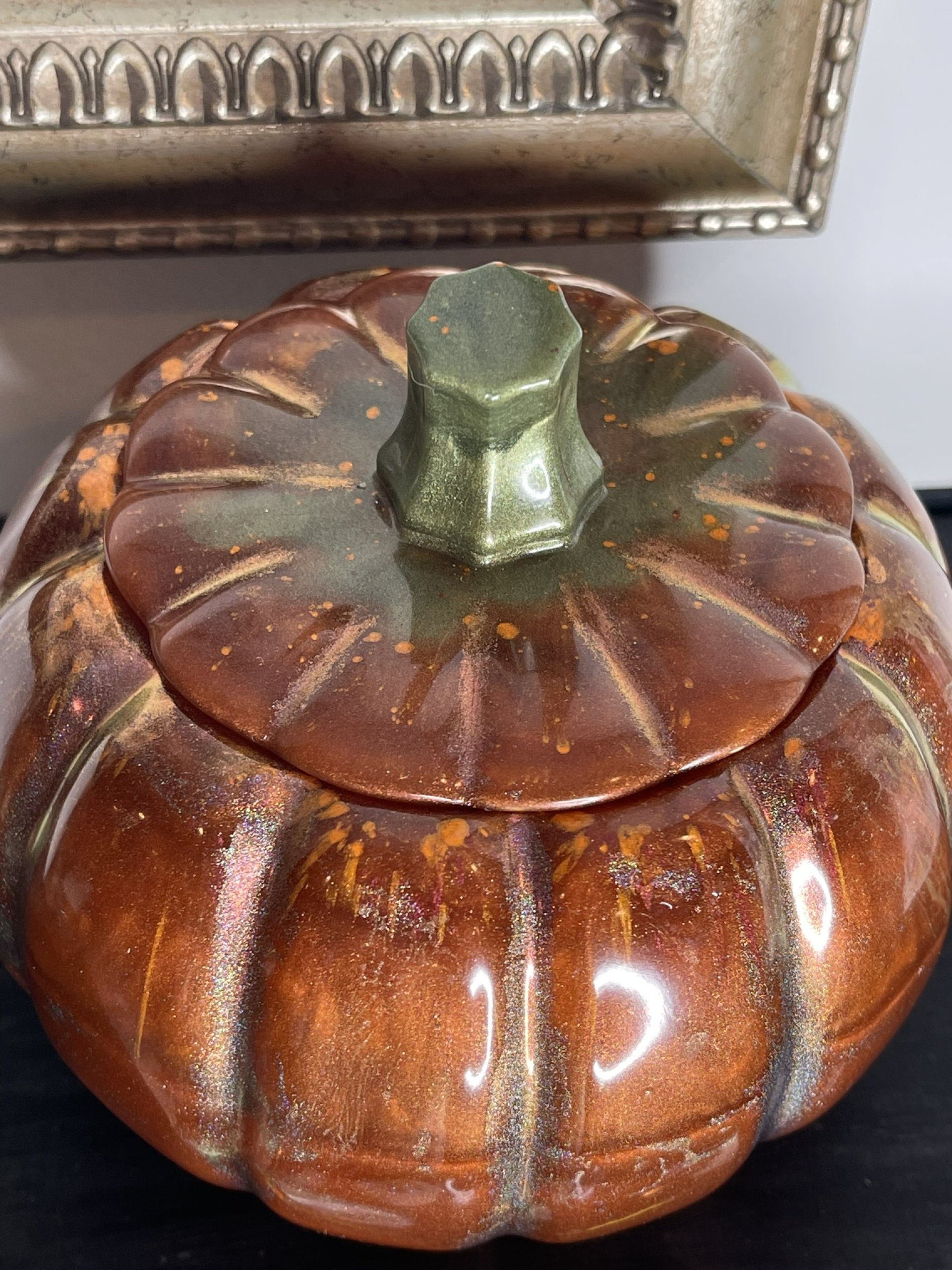 Handmade, signed pumpkin 2 piece jar with lid. This jar is a lovely example of resin art. It has a Green Mica Stem with Orange Mica/Pigments for the rest. It has a beautiful pearl/metallic lustre to it. As you see in photos, it is a good size to store goodies in.