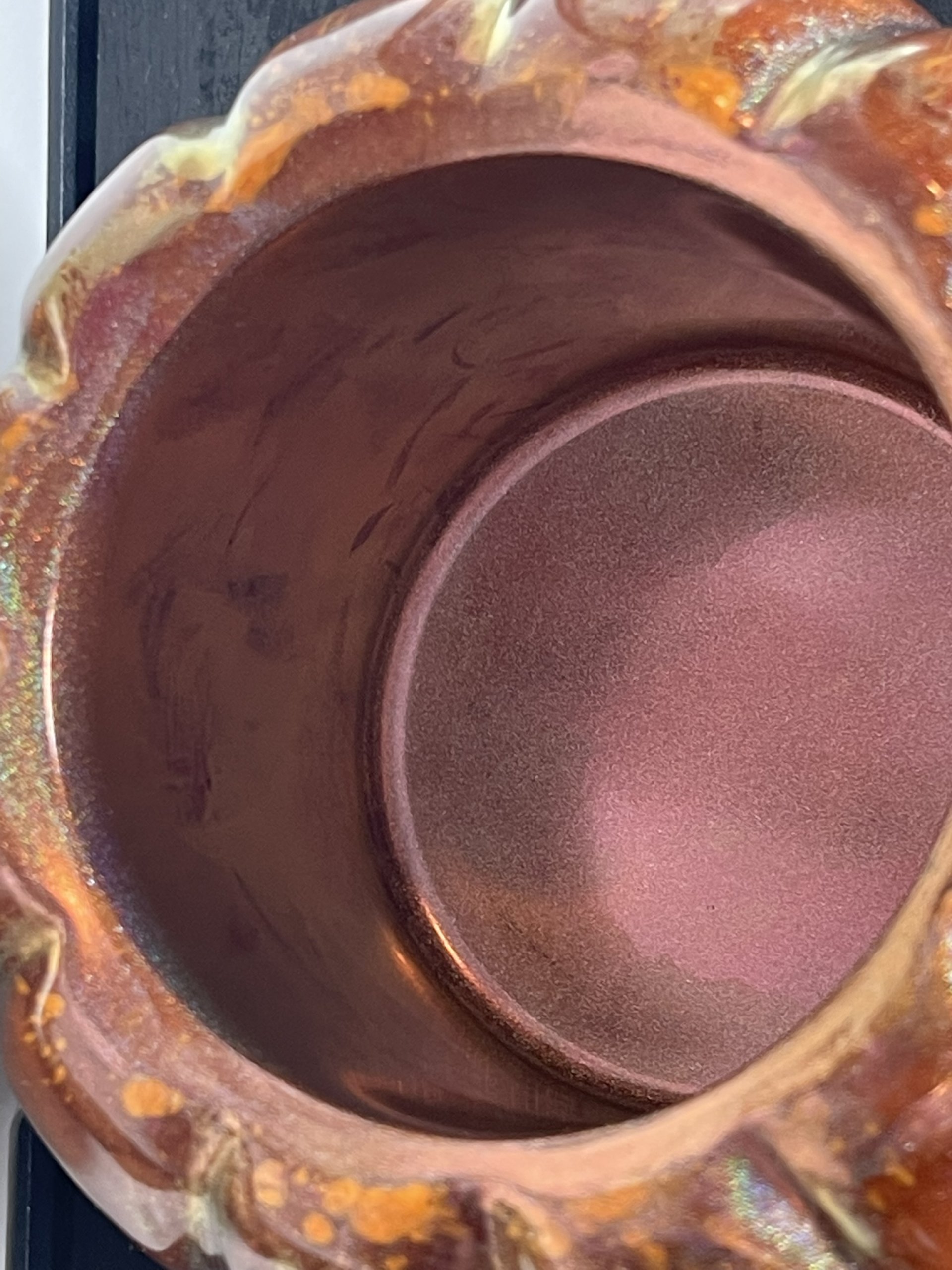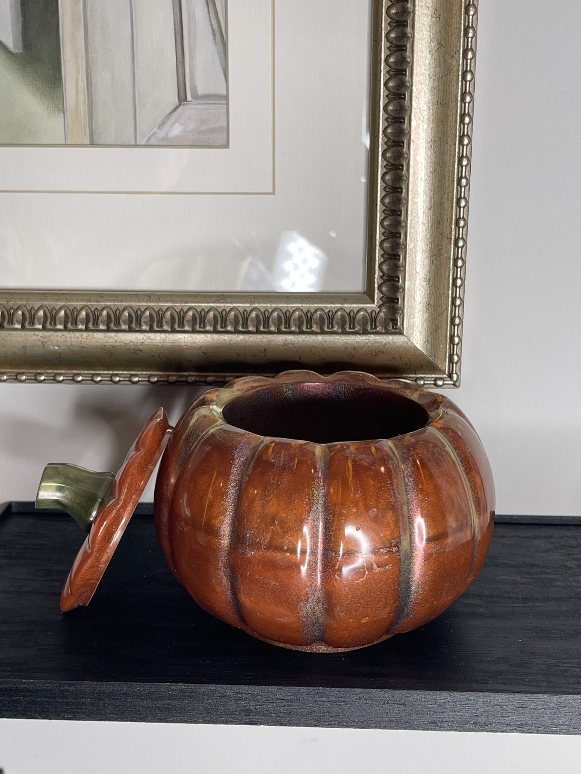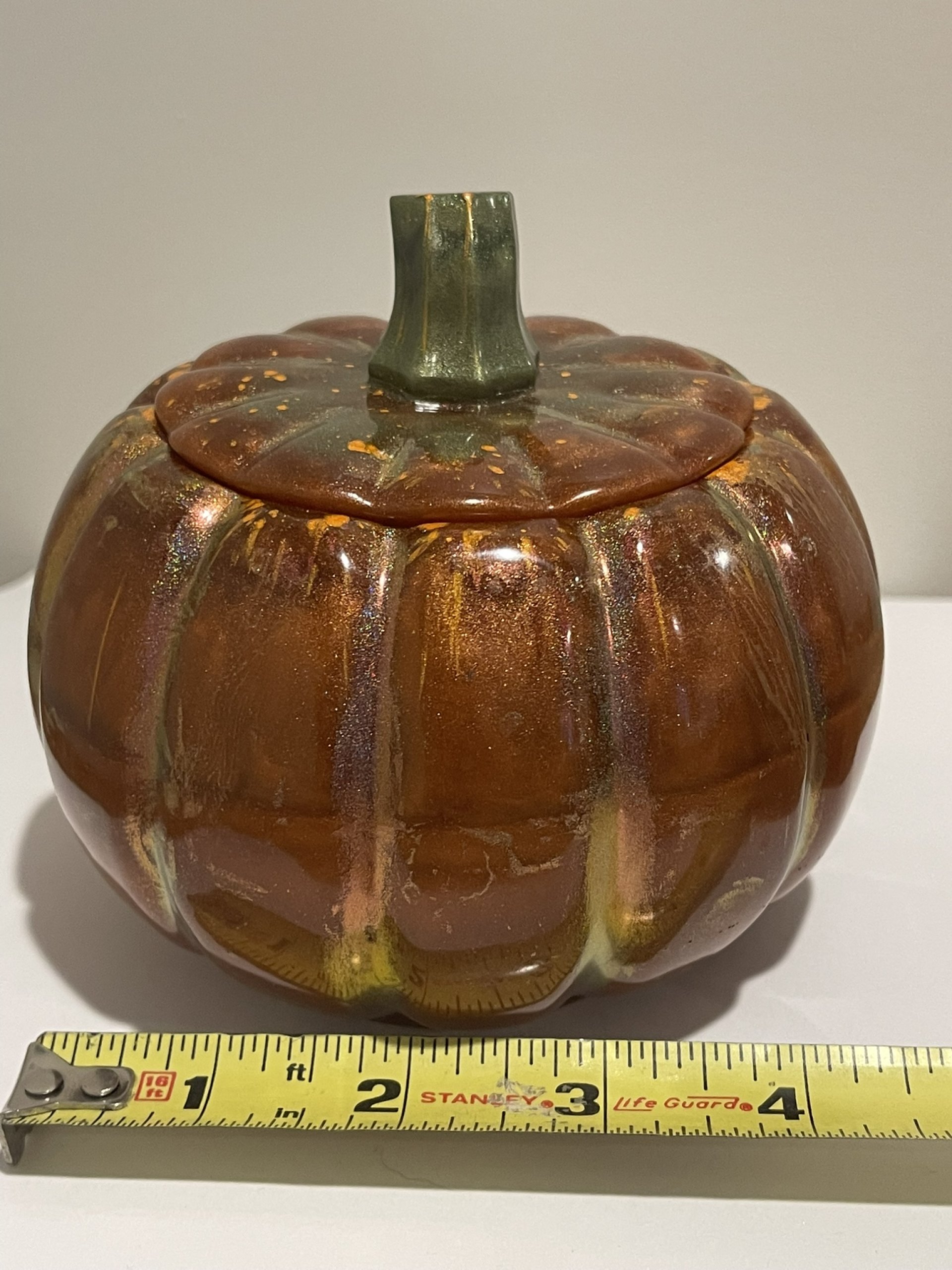 Handmade, signed pumpkin 2 piece jar with lid. This jar is a lovely example of resin art. It has a Green Mica Stem with Orange Mica/Pigments for the rest. It has a beautiful pearl/metallic lustre to it. As you see in photos, it is a good size to store goodies in.