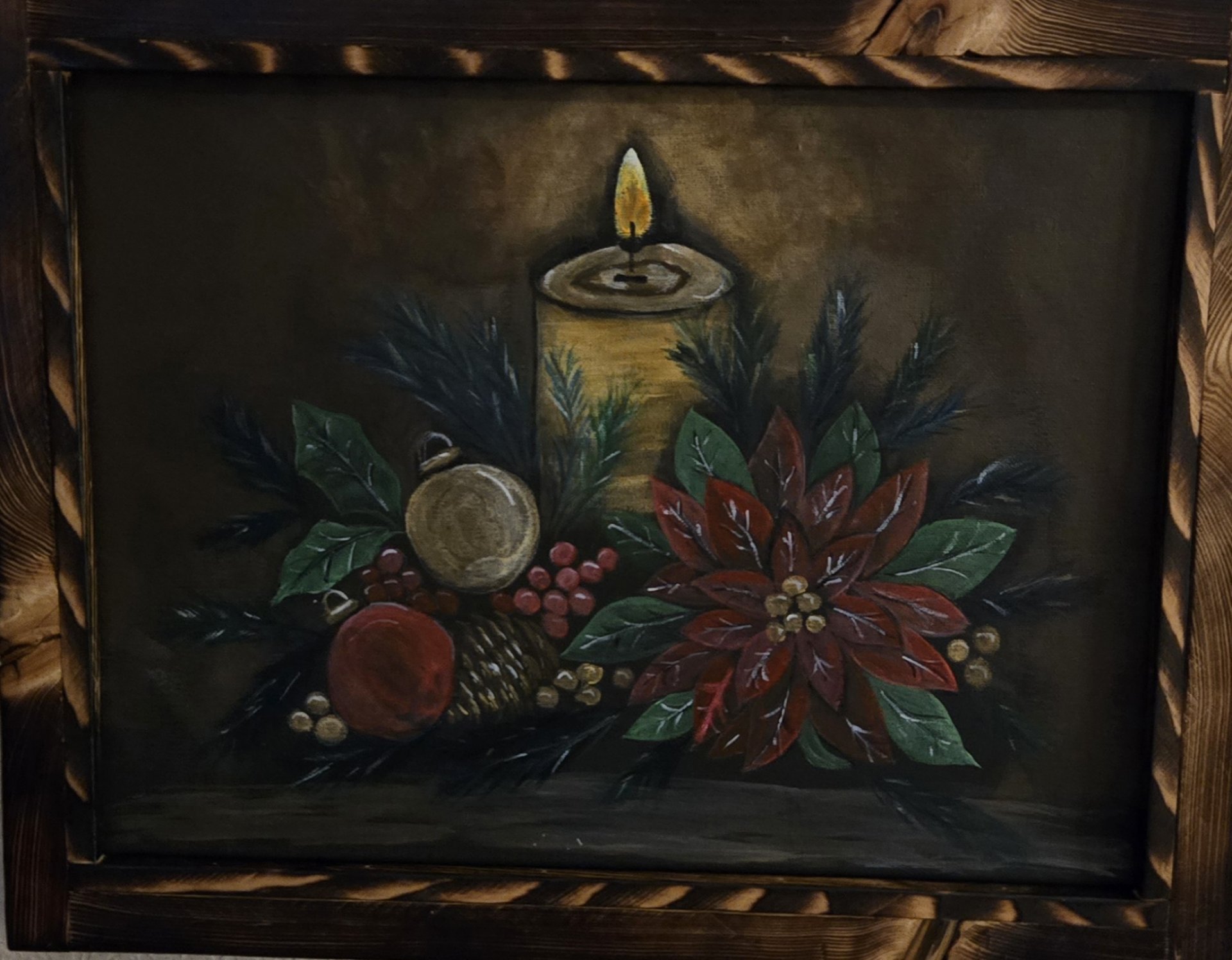 This festive 12x16 black canvas features a handpainted Christmas candle surrounded by vibrant poinsettias, fresh Christmas greens, festive bulbs, and a rustic pinecone.