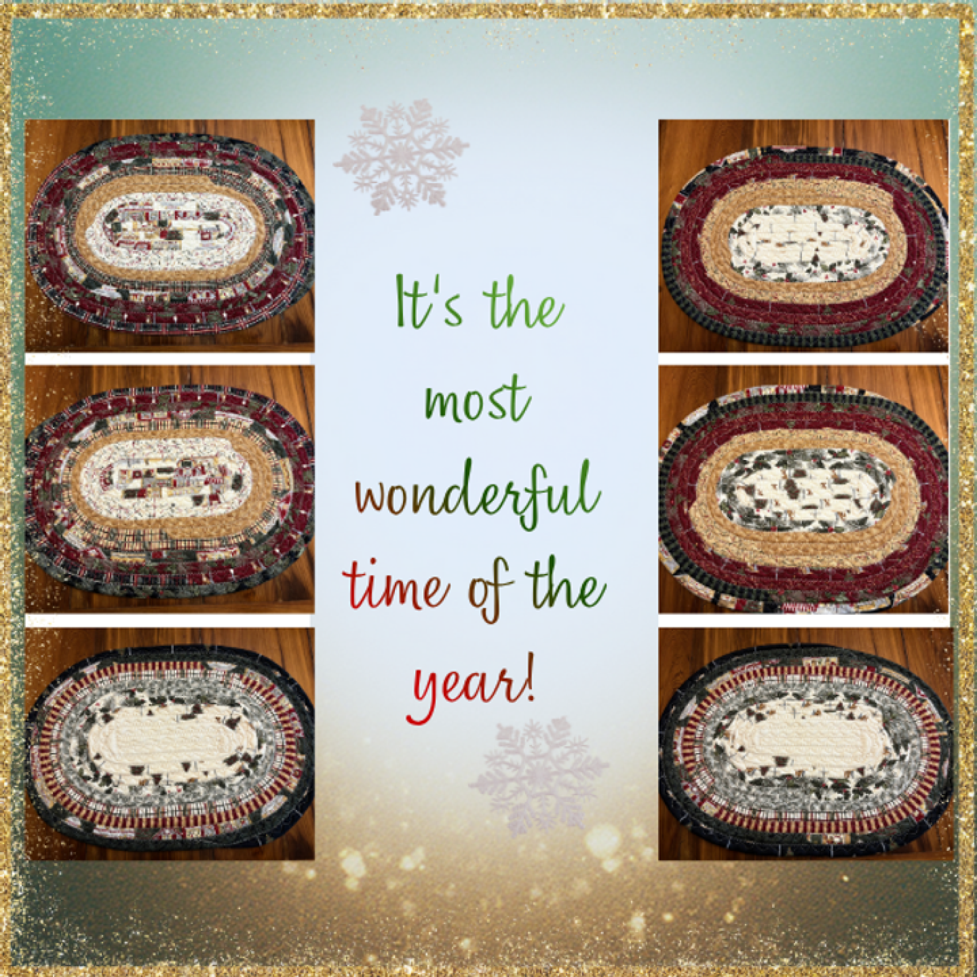 This charming collection of oval quilted placemats feature a nostalgic Christmas village theme, each one displaying a different festive scene. Rich holiday colors—deep reds, forest greens, warm golds, and soft creams—combined in intricate layers that frame the detailed center panels. Snowy cottages, pine trees, and cozy winter village motifs give each placemat a unique personality while still coordinating beautifully as a set. The mats radiate warmth and traditional holiday charm. Their handcrafted look and vintage-inspired designs evoke the feeling of a classic Christmas—perfect for creating a welcoming, festive table setting all season long. These placemats also coordinate with the Holiday Village Table Runner!