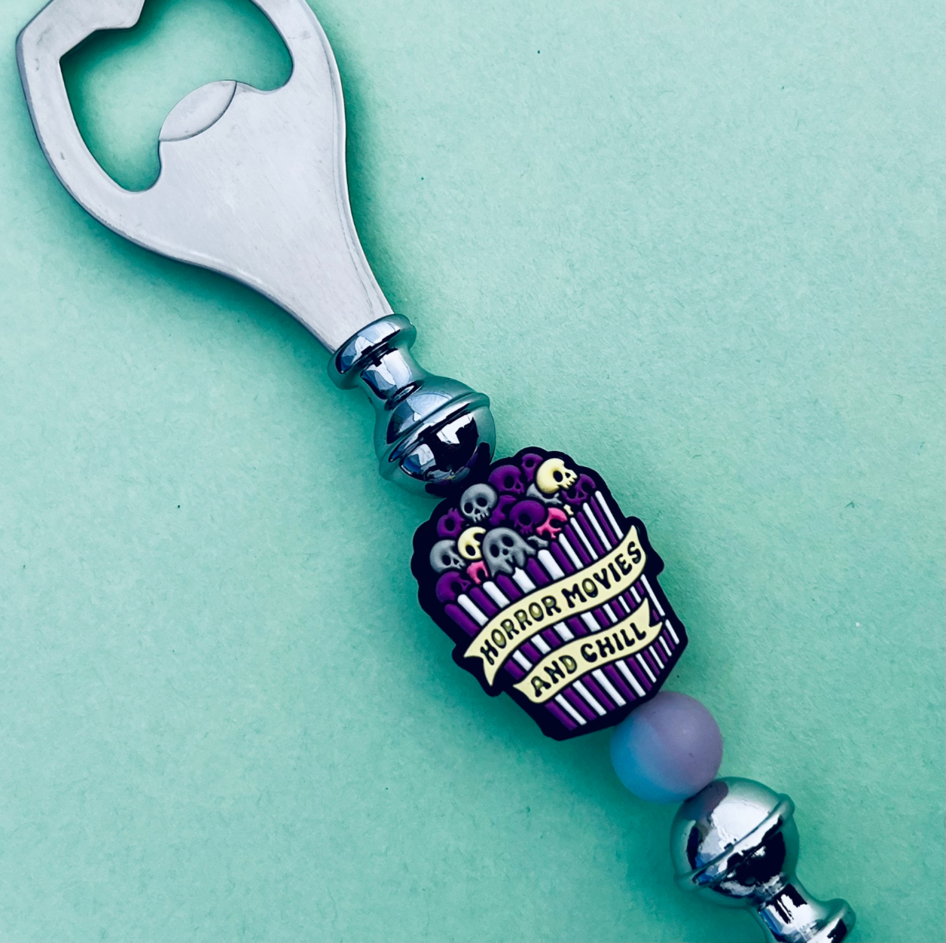 Horror Movies and Chill Bottle Opener. Glow in the Dark bead.