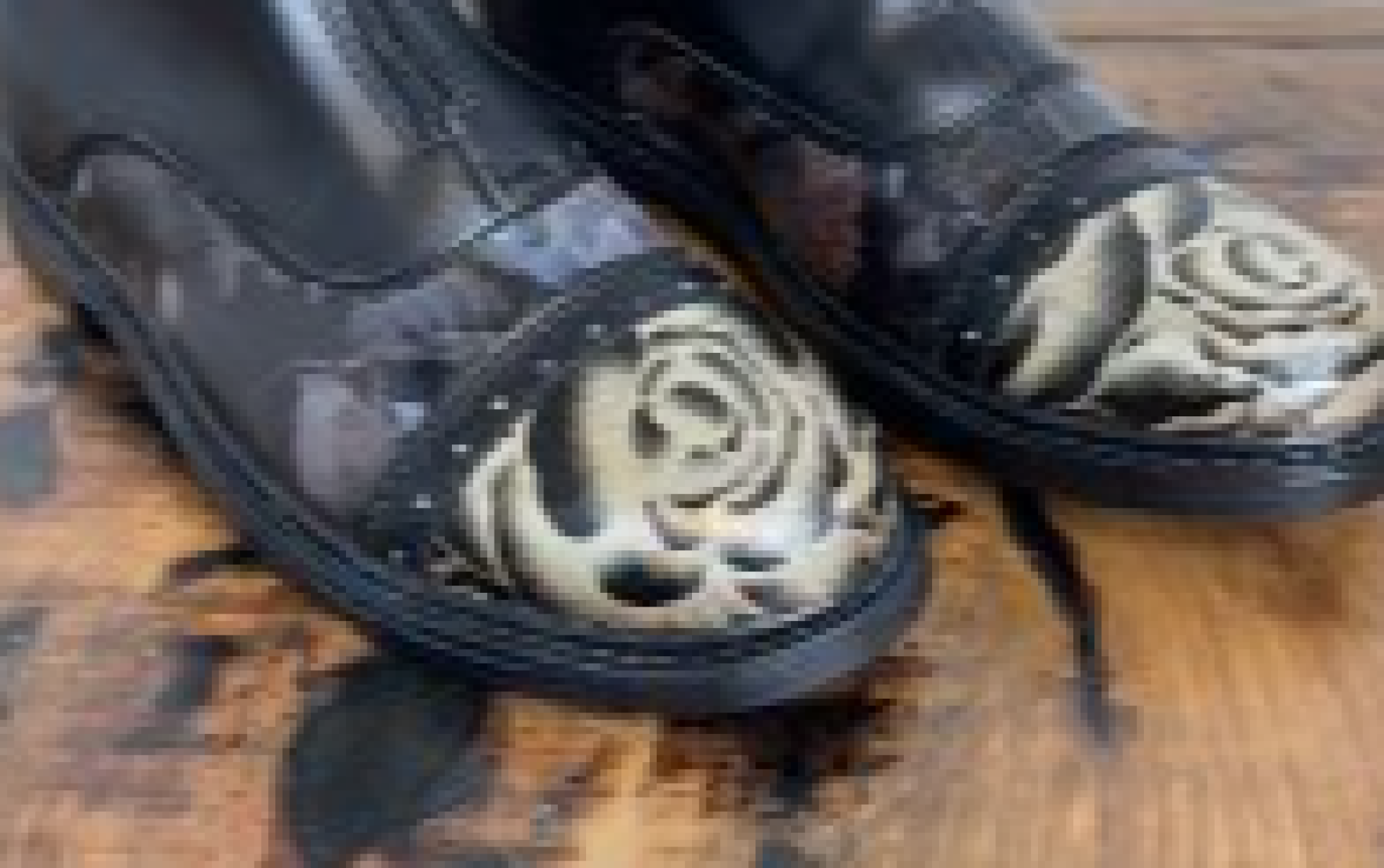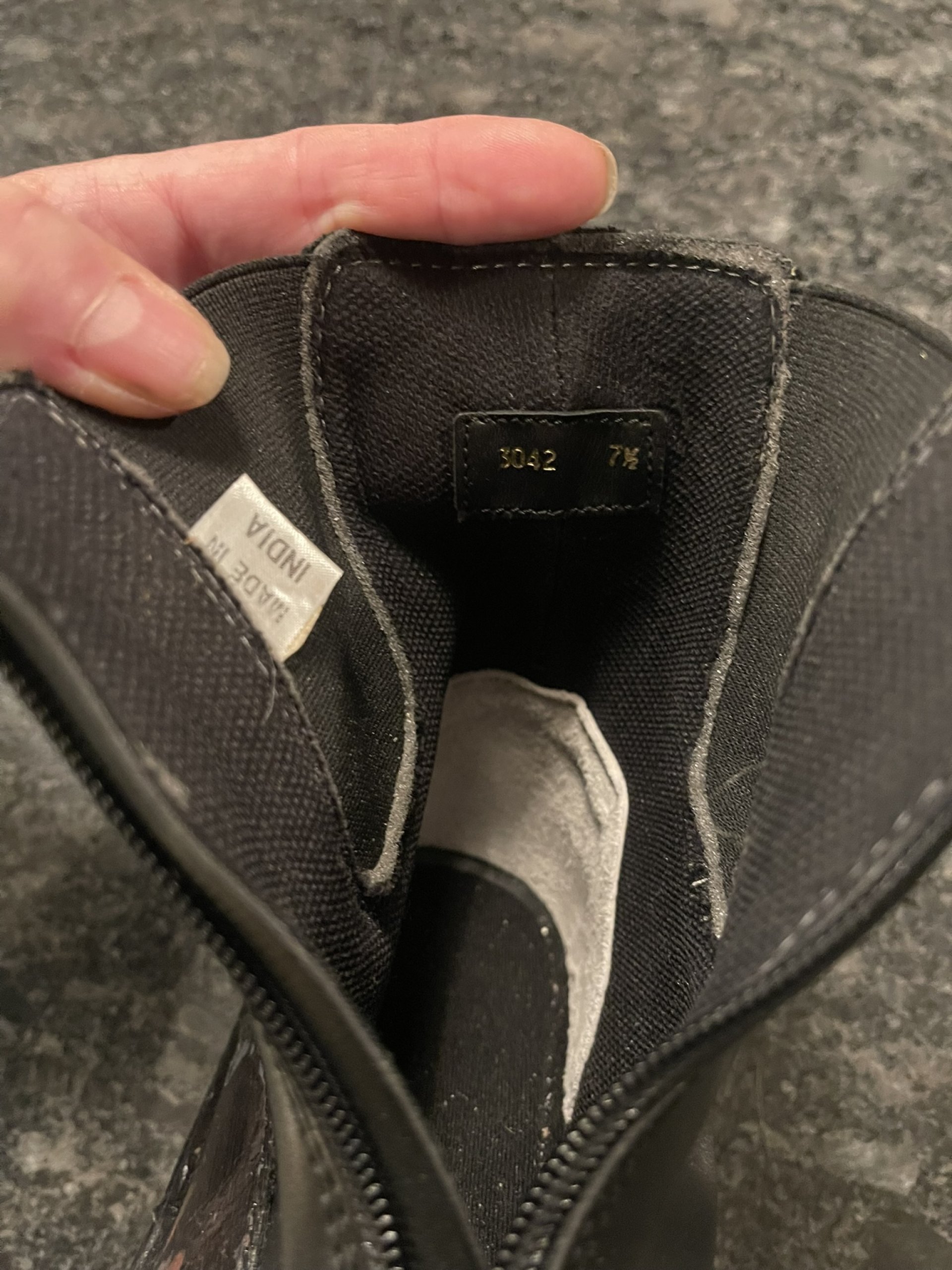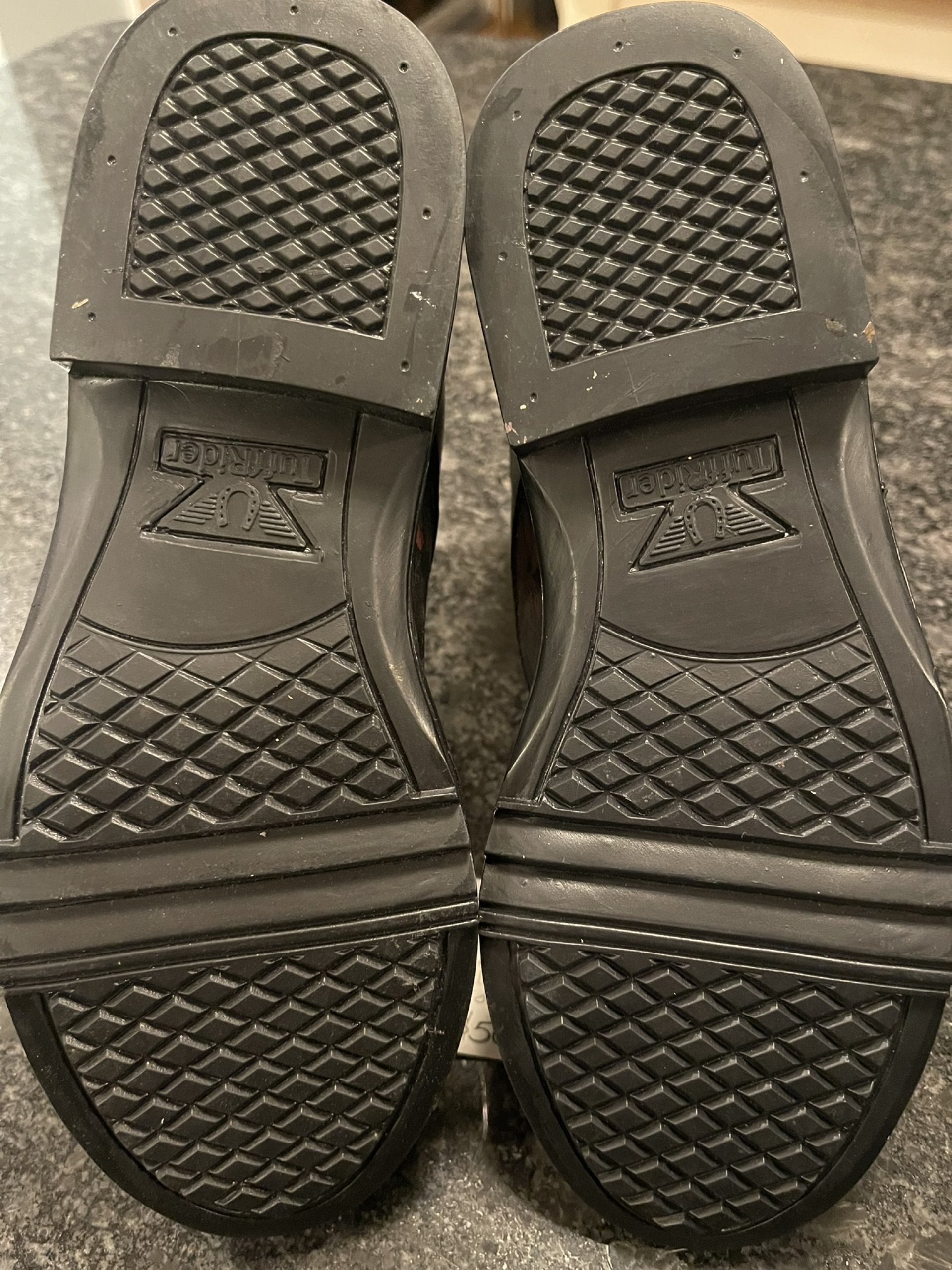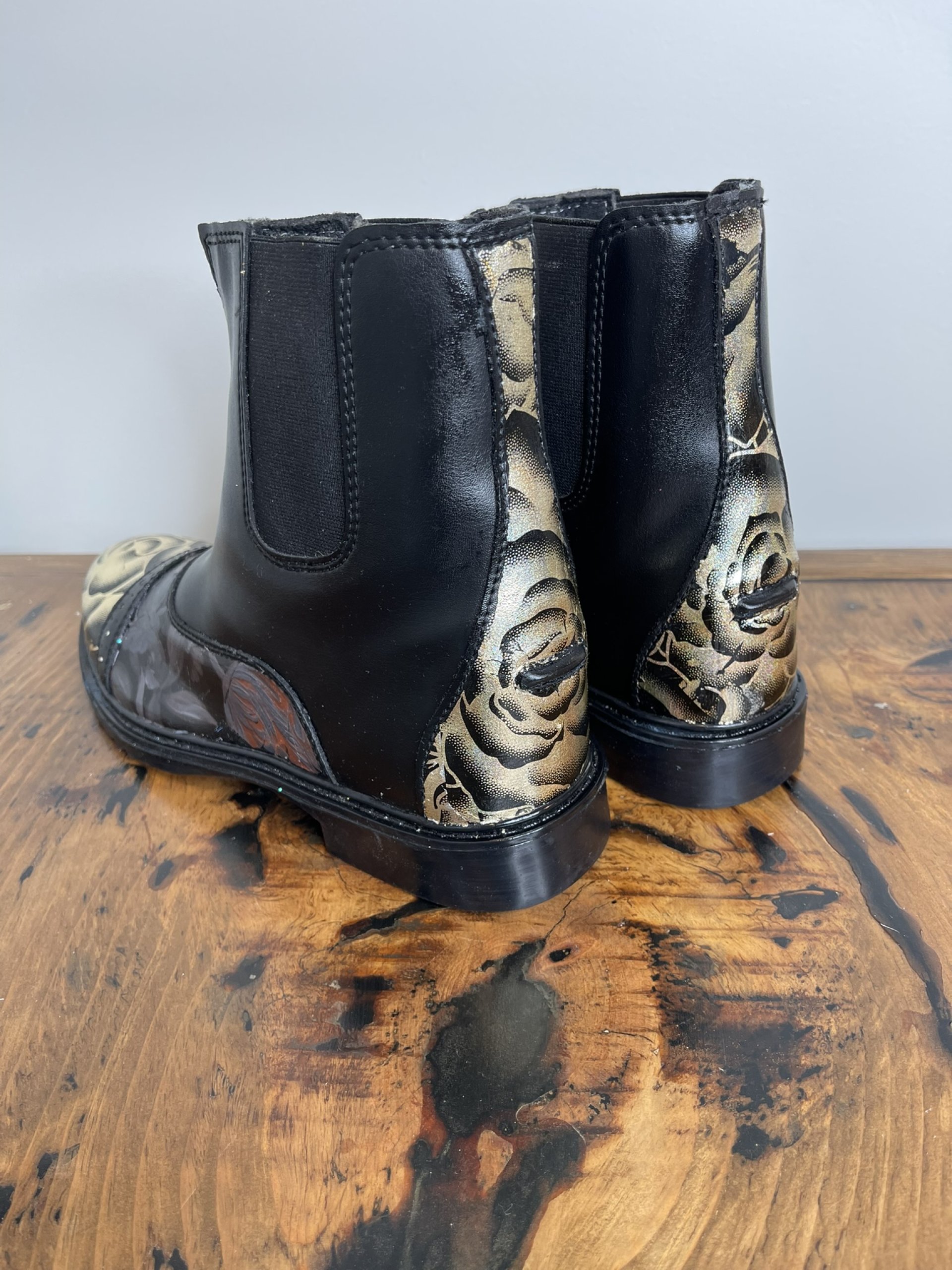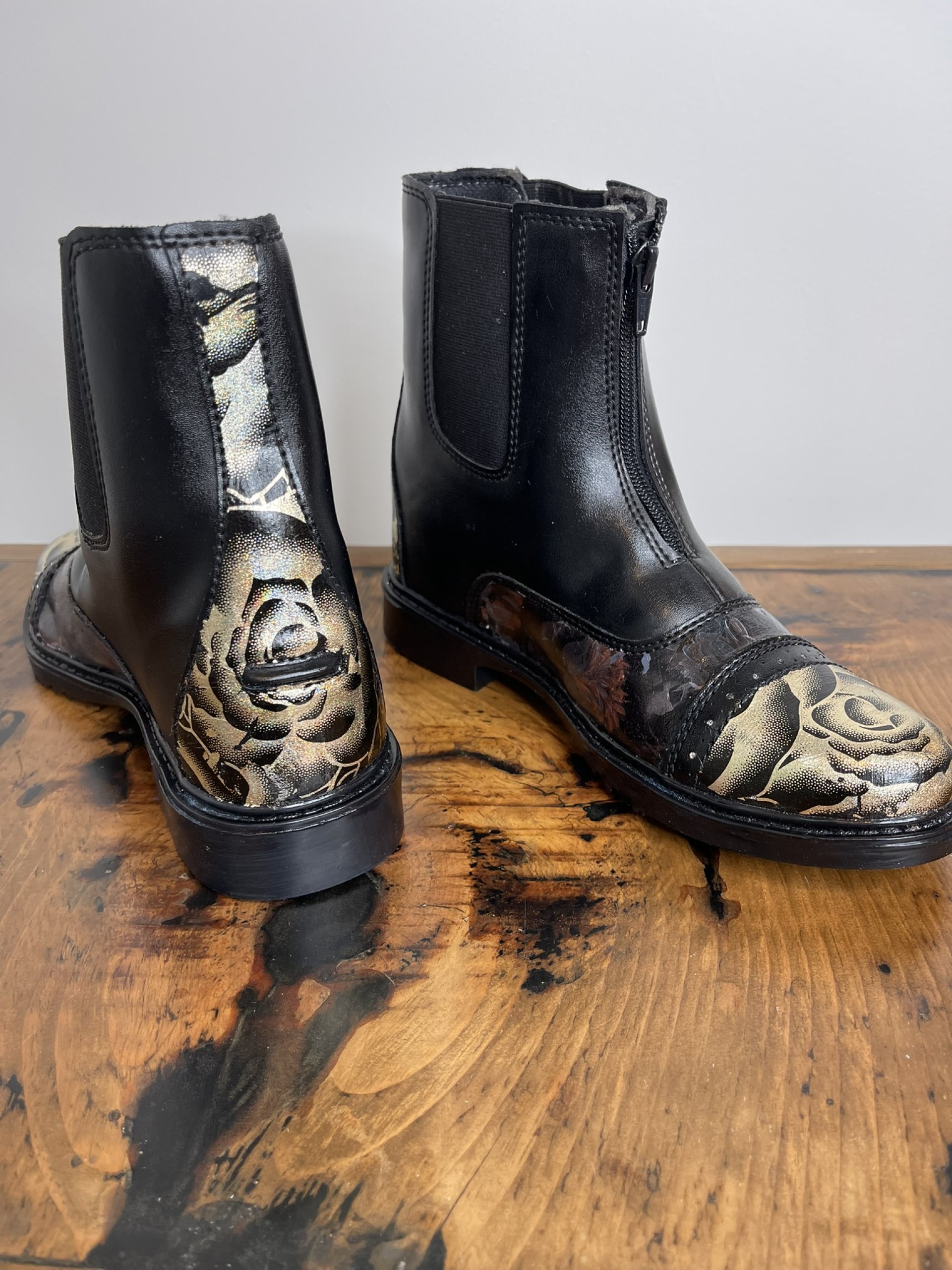 Ladies Tuff Rider Paddock ankle boots in Black with front zipper. Size 7 1/2. Faux leather and rubber soles makes for easy cleaning. I added a couple different foils and added small rhinestones to detailed areas of the boots. Never worn. These are easy care boots, great for messy days.