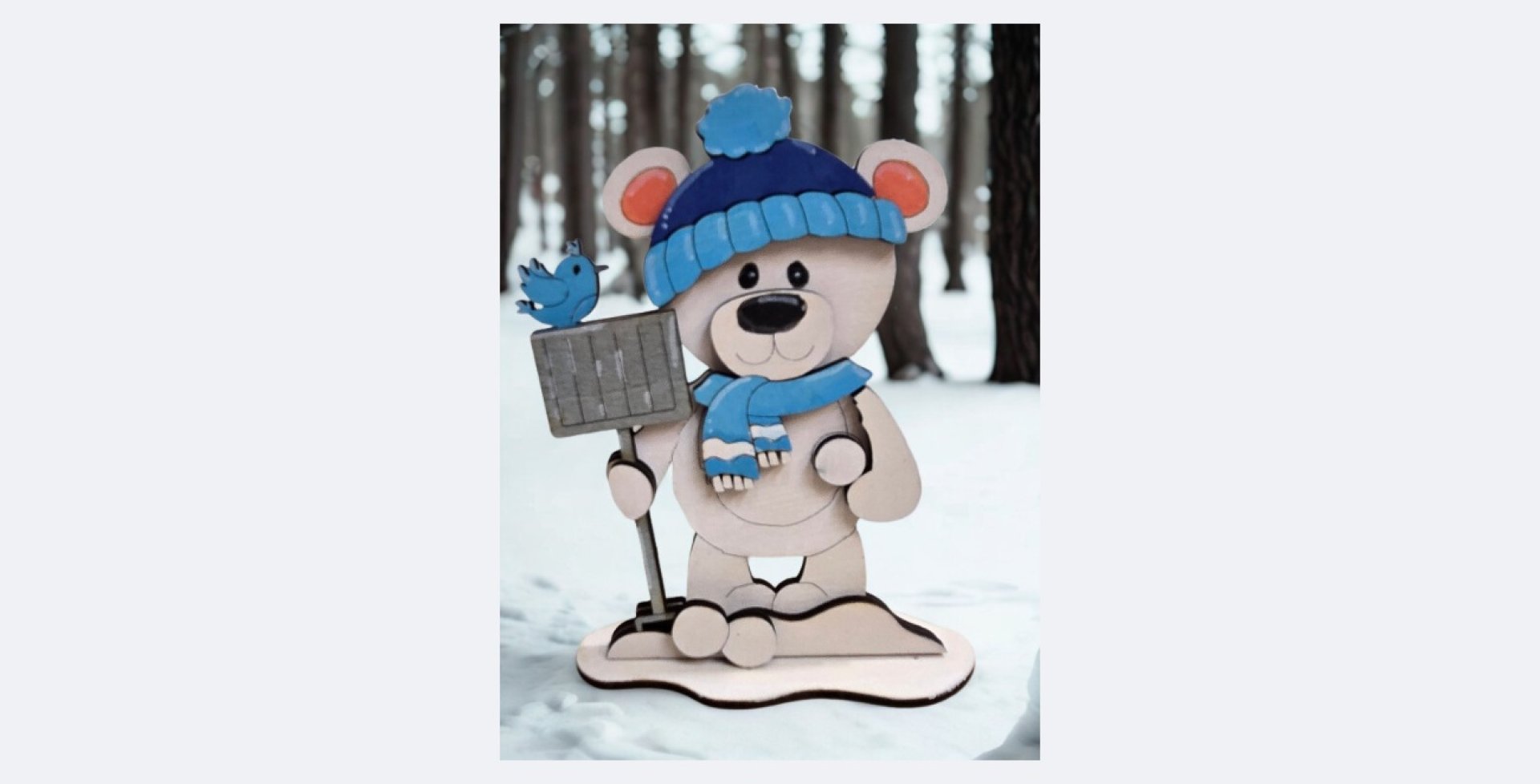 Add a touch of winter charm to your home with this rustic laser cut wooden winter bear decor, featuring an adorable bear bundled in a blue hat and scarf while holding a shovel. A cheerful blue bird sits atop the shovel, bringing playful personality to the scene.