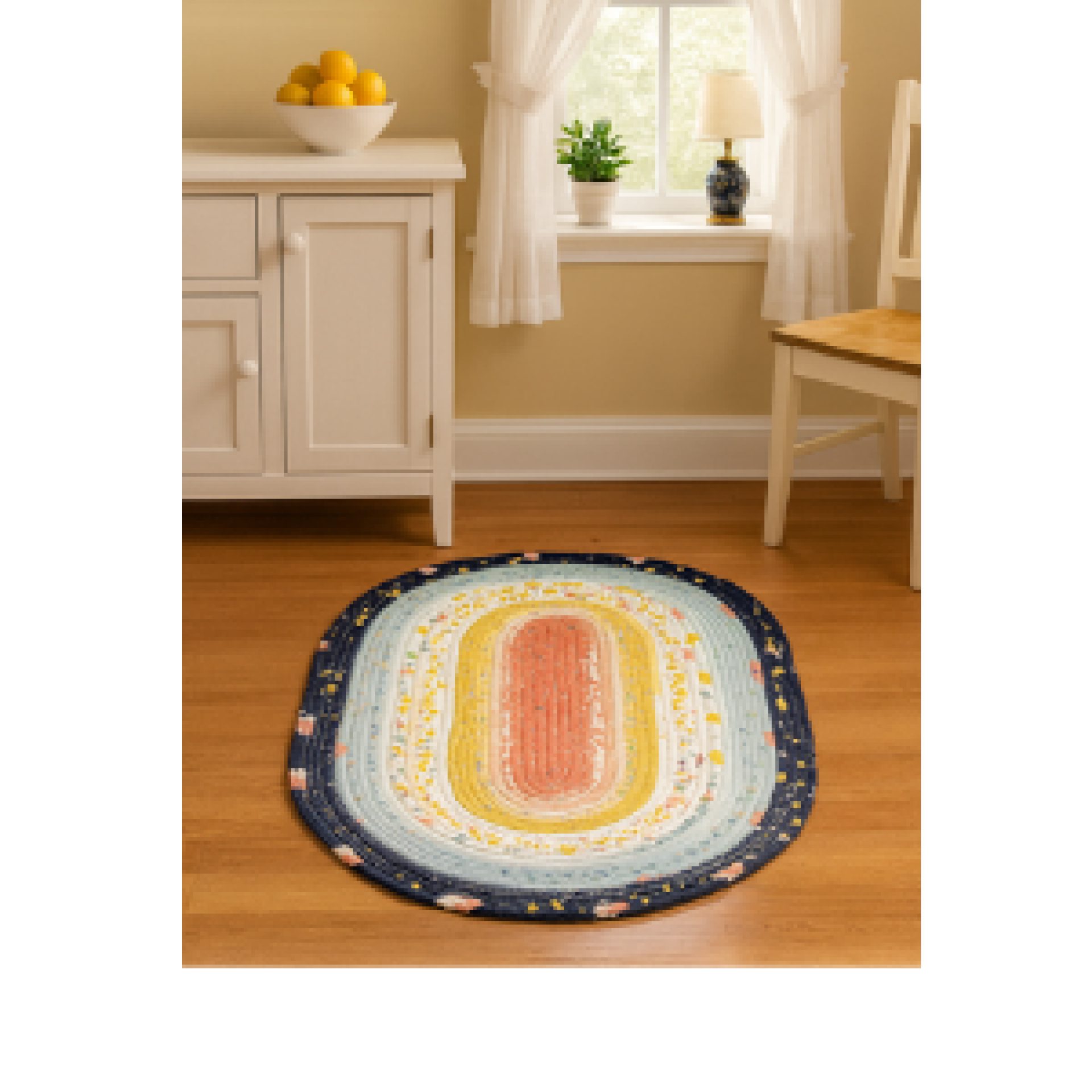 Add a touch of sunshine to your space with Lemon Grove, a handcrafted cotton rug that brings the beauty of a blooming garden indoors. Measuring 38" x 26", this vibrant oval rug features a delightful mix of lemons, florals, butterflies, and bumblebees—sewn together in soft peach, sunny yellow, and rich navy tones. Each fabric strip is carefully stitched to create a charming quilted effect that’s both cozy and eye-catching. Whether placed in the kitchen, entryway, or sunroom, this rug adds warmth, character, and a breath of springtime air all year round.