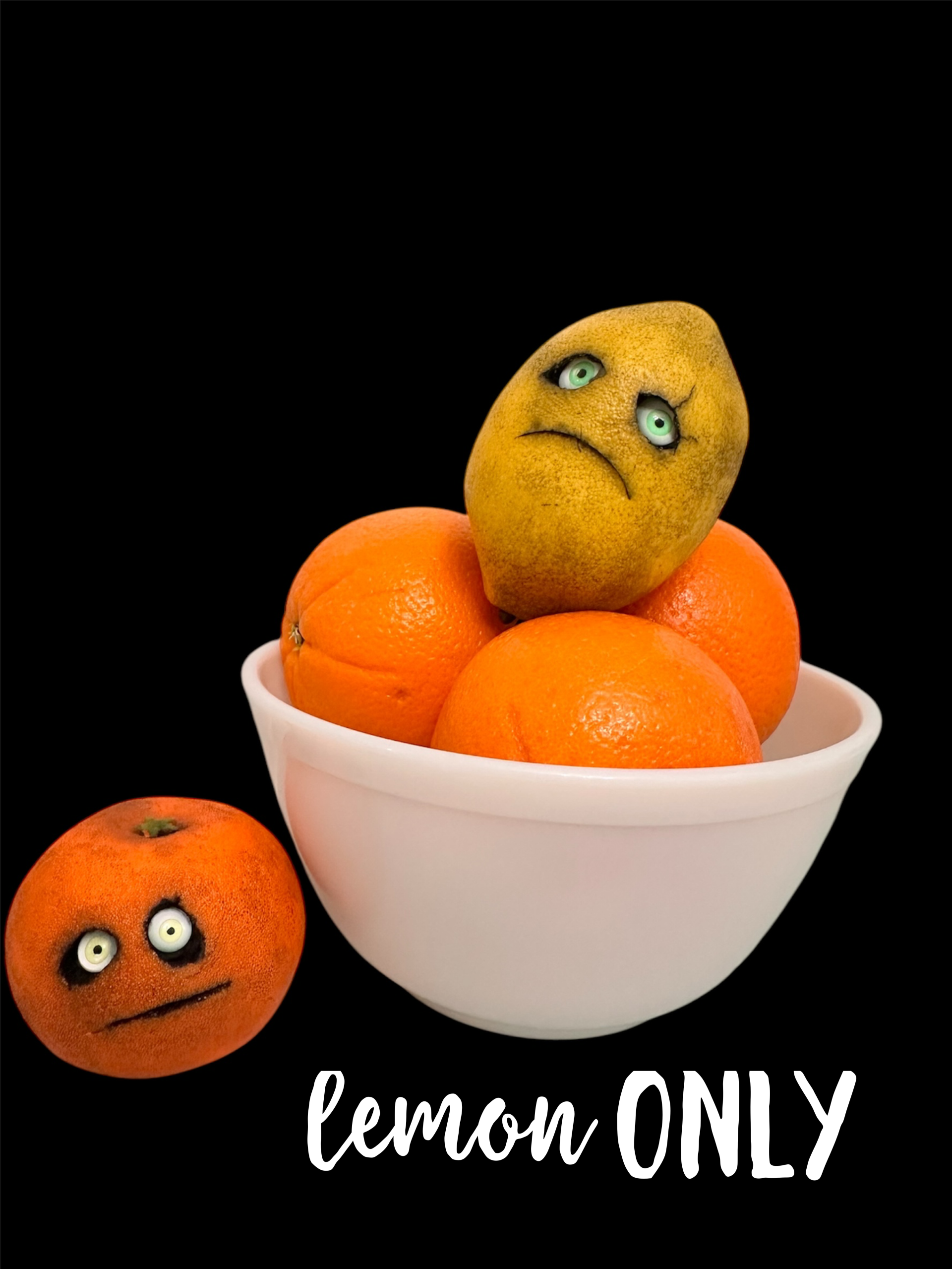 One sad, sour-faced lemon for sale. He wants to come live at your house. (please) Although totally fake, this lemon is extremely realistic looking with the texture of the real deal. He comes with a little acrylic stand, but looks great mixed in with a bowl of fresh lemons! 4" x 2½", and carved from foam and plastic composite. He's been intentionally bruised and then painted to look a little bit rotten. Bowl and prop oranges not included. Always one of a kind, never duplicated. Definitely not a toy