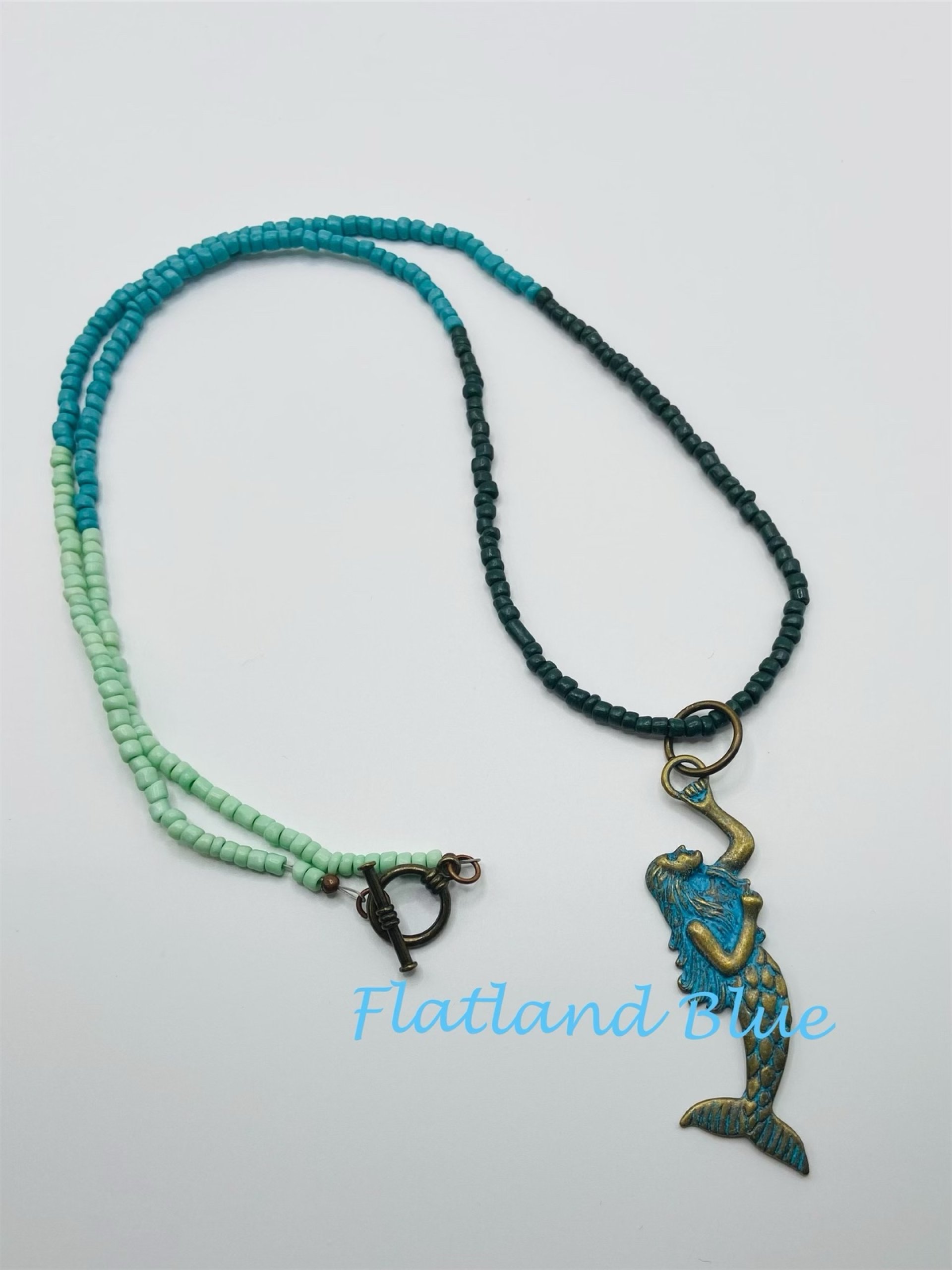 This necklace is a beautifully crafted piece that measures 29 inches in length. It is composed of glass beads that are elegantly arranged in various shades of blue, creating a visually striking effect reminiscent of ocean waves and the serene beauty of water. At the focal point of this necklace is a 3-inch verdigris mermaid pendant, which serves as a captivating centerpiece. The verdigris finish on the pendant gives it an antique look, enhancing its charm and appeal. This mermaid pendant not only symbolizes beauty and grace but also adds a whimsical touch to the overall design. The necklace features a toggle clasp, which is practical for securing the piece while also contributing to its aesthetic appeal. The toggle clasp is designed to be easy to use, allowing for quick fastening and unfastening while ensuring that the necklace remains securely in place when worn.