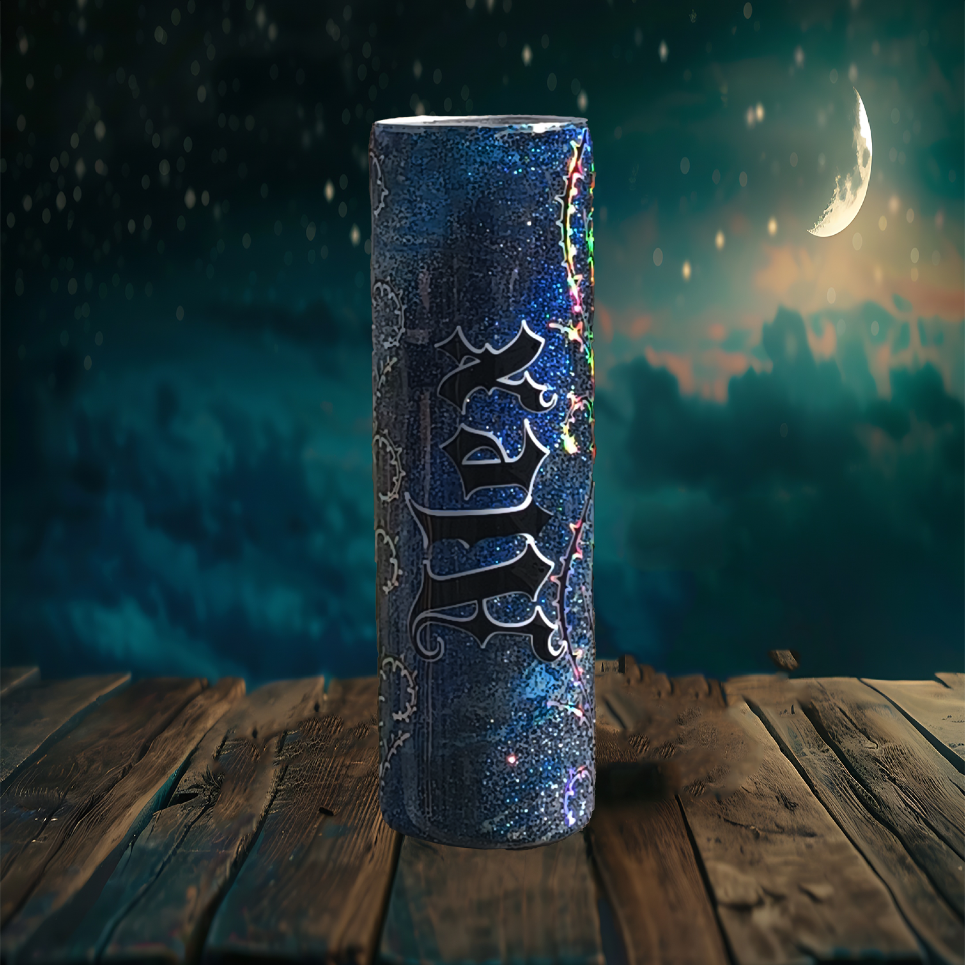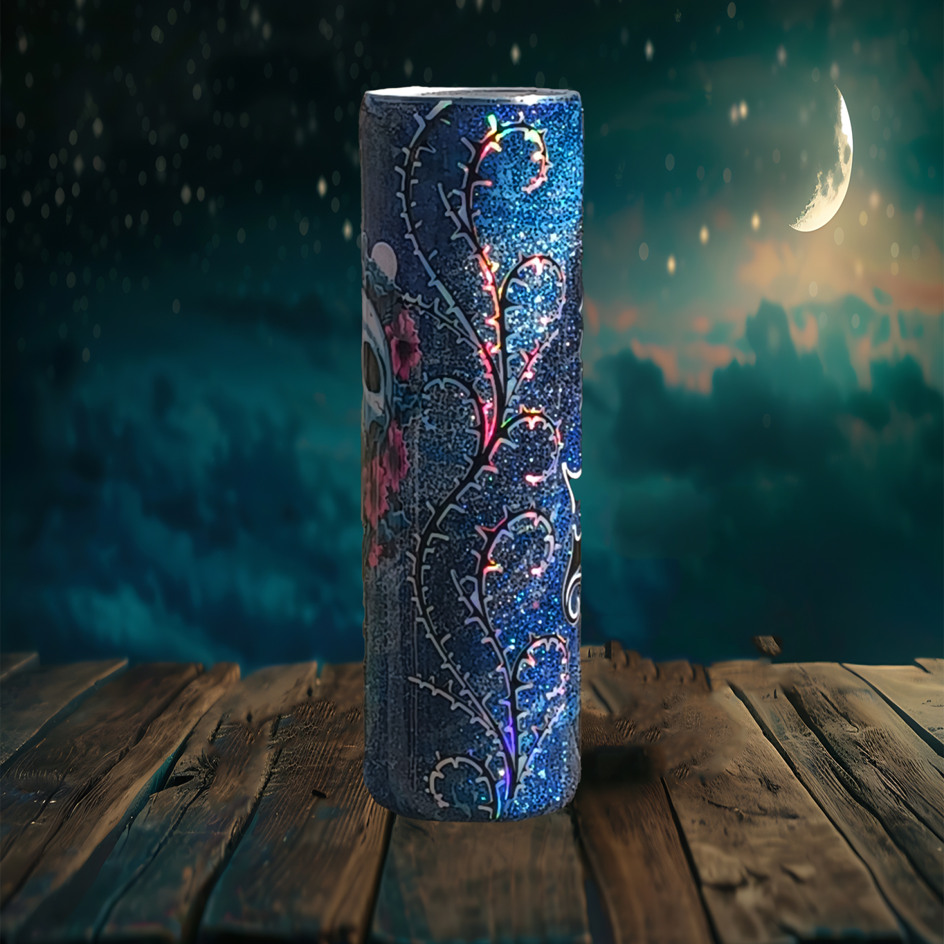 Dare to embrace the dark with the Midnight Howl tumbler – a stunning handcrafted cup drenched in midnight blue glitter and wrapped in a haunting skull design. Surrounded by blood-red roses and shadowy tones, the skull stares outward while a twisted trail of thorn-covered vines coils around the tumbler, like nature reclaiming something forgotten and fierce.