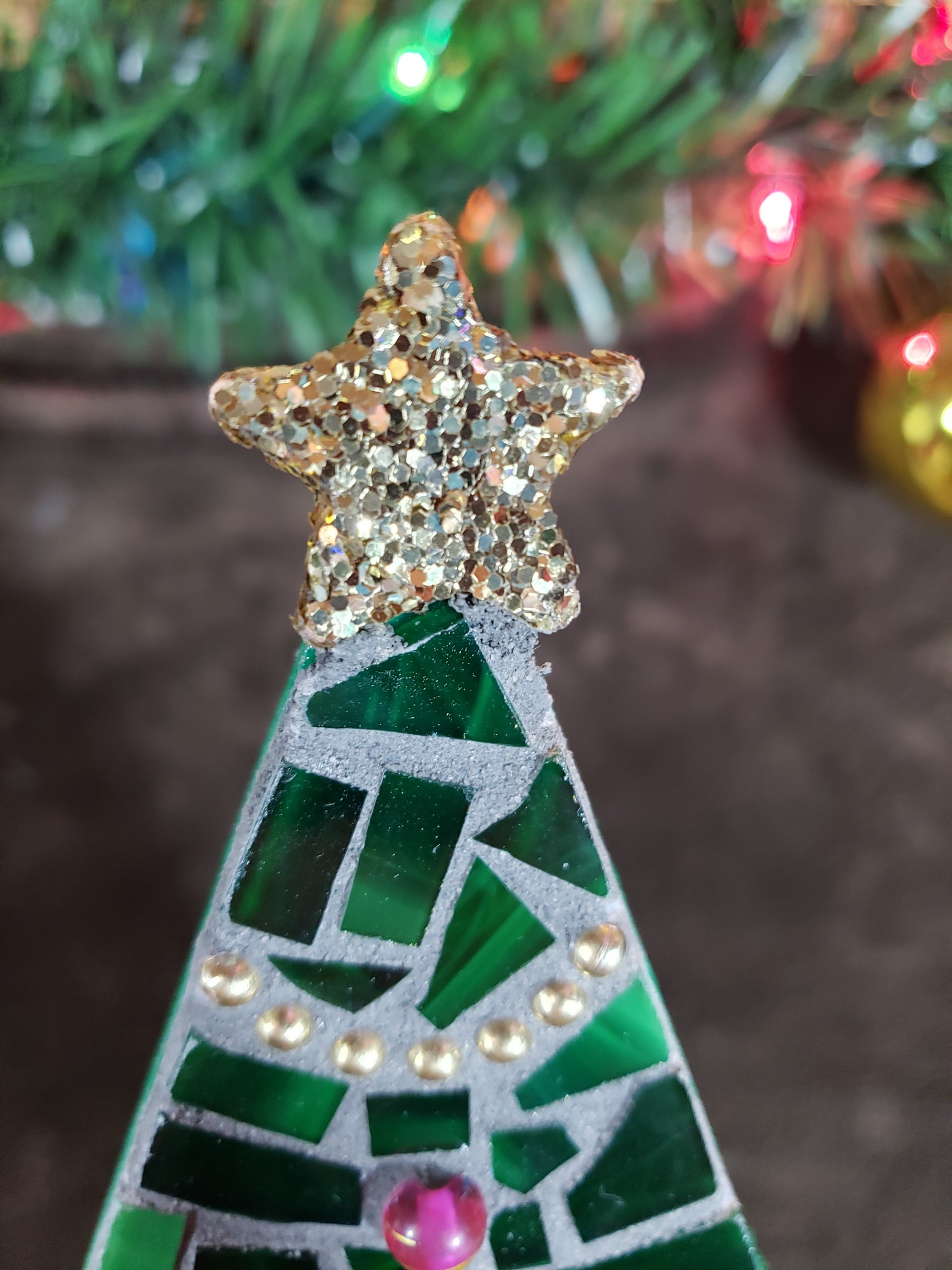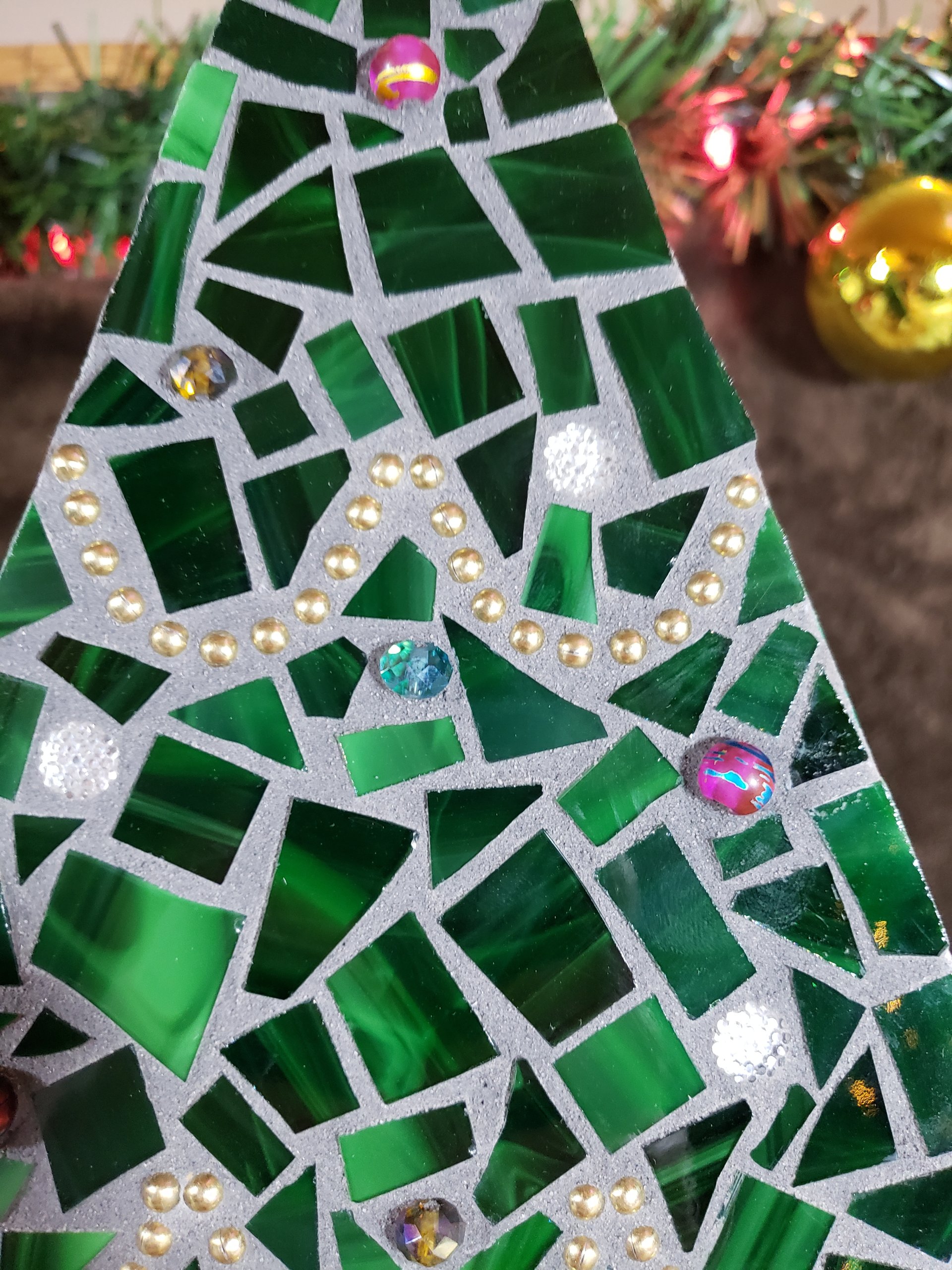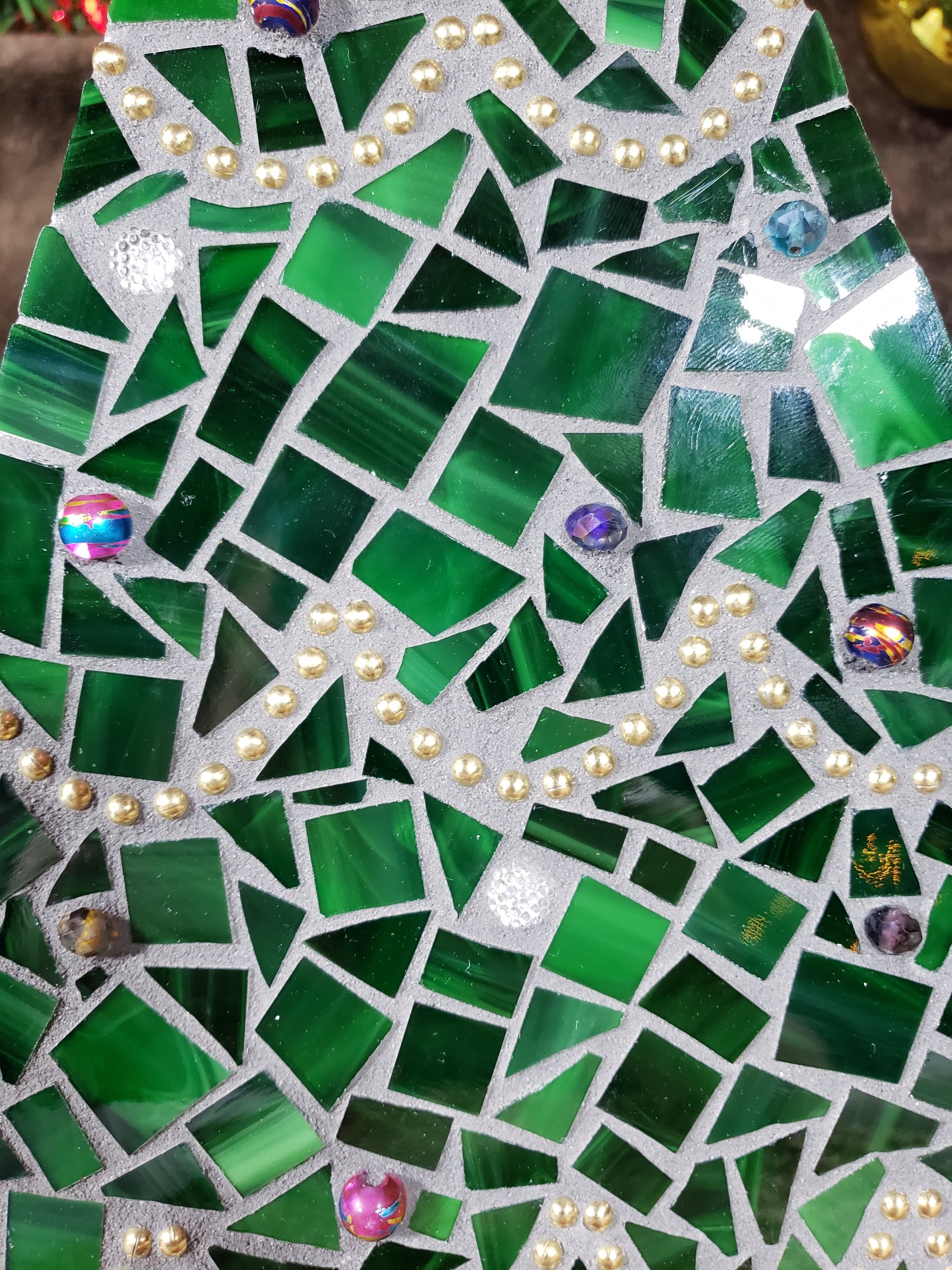 - Handcrafted mosaic trees with green glass tiles and bead details