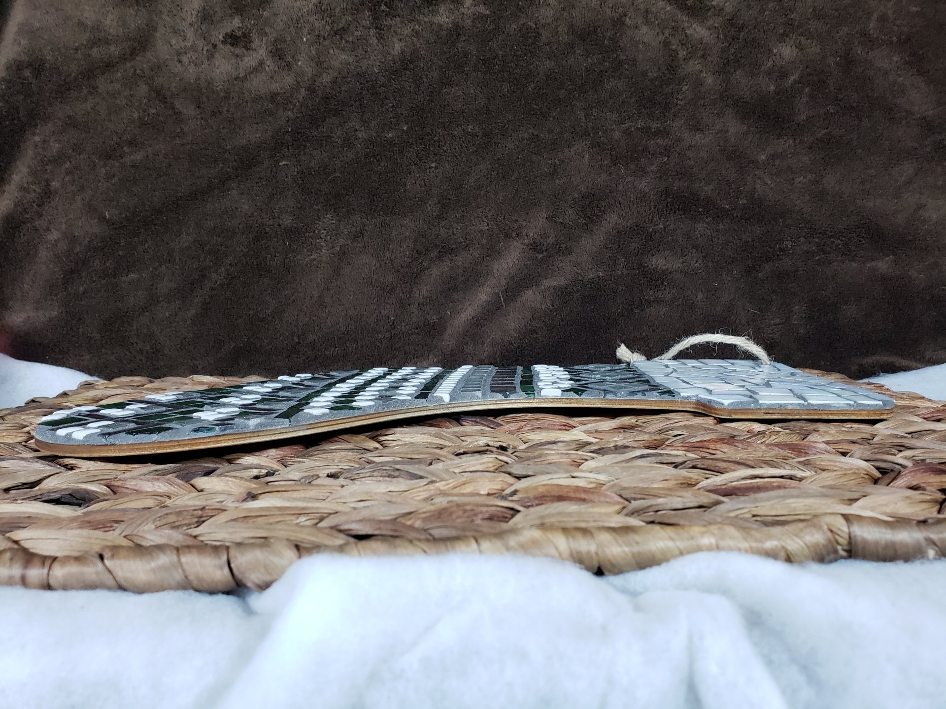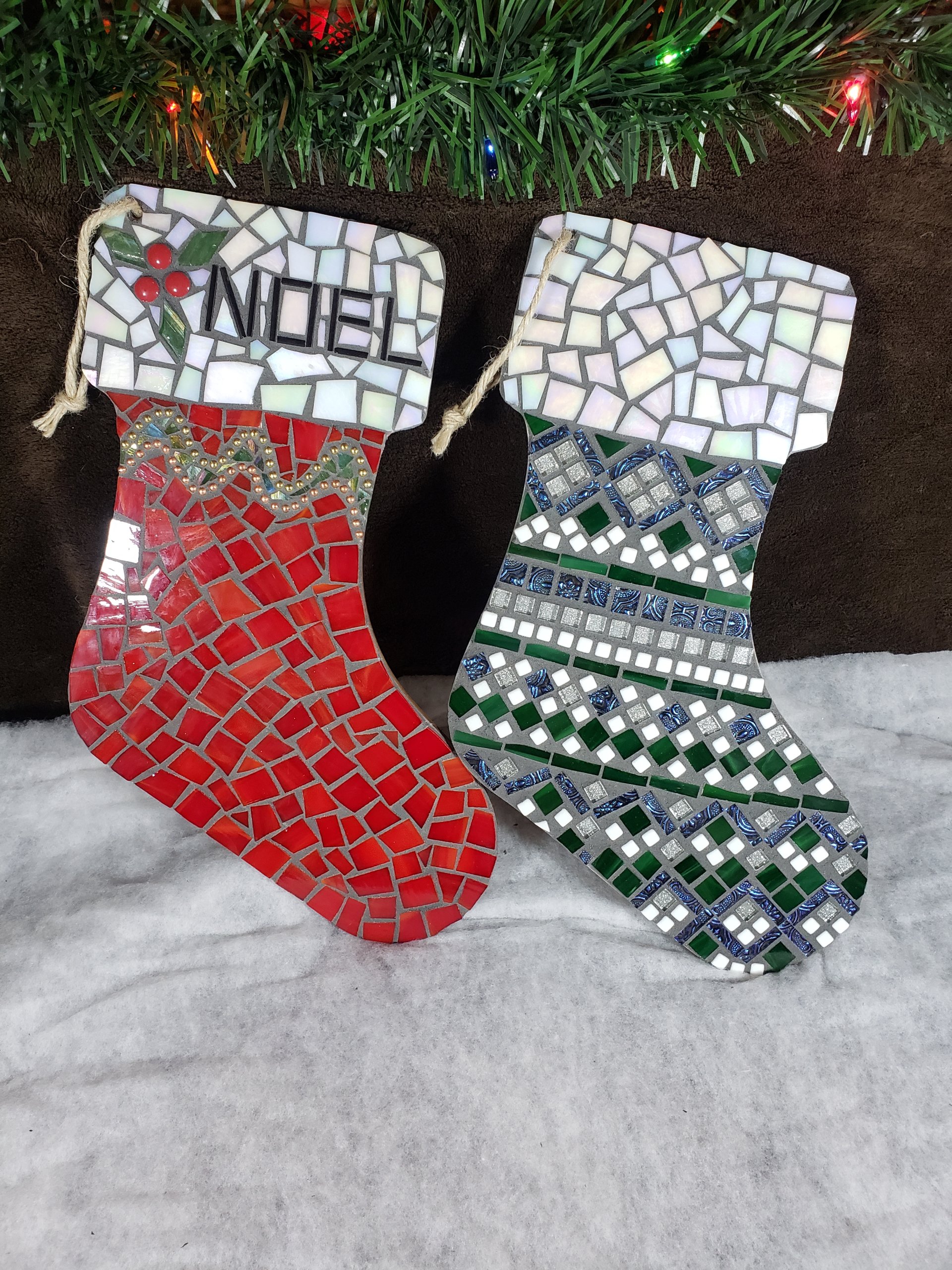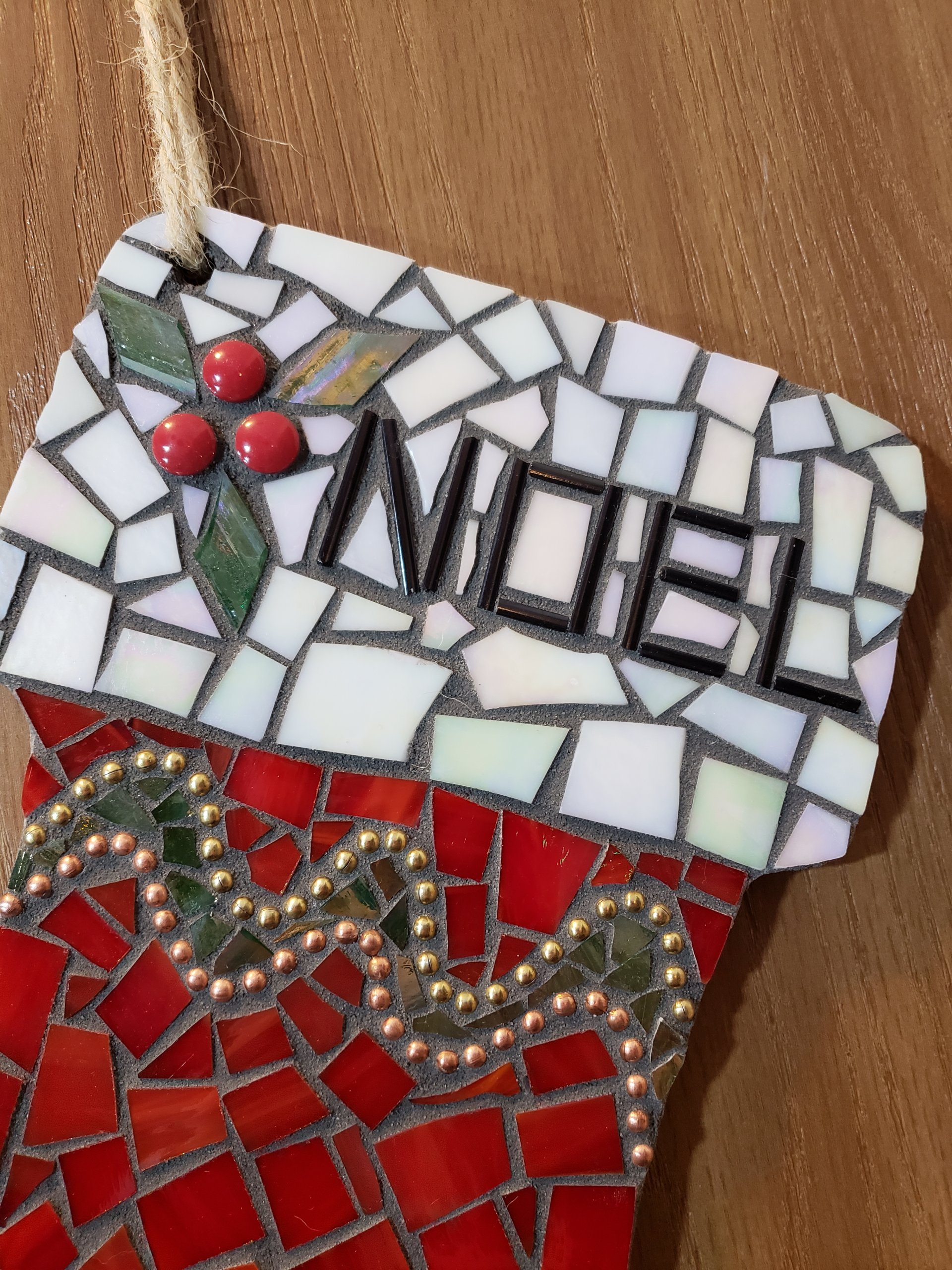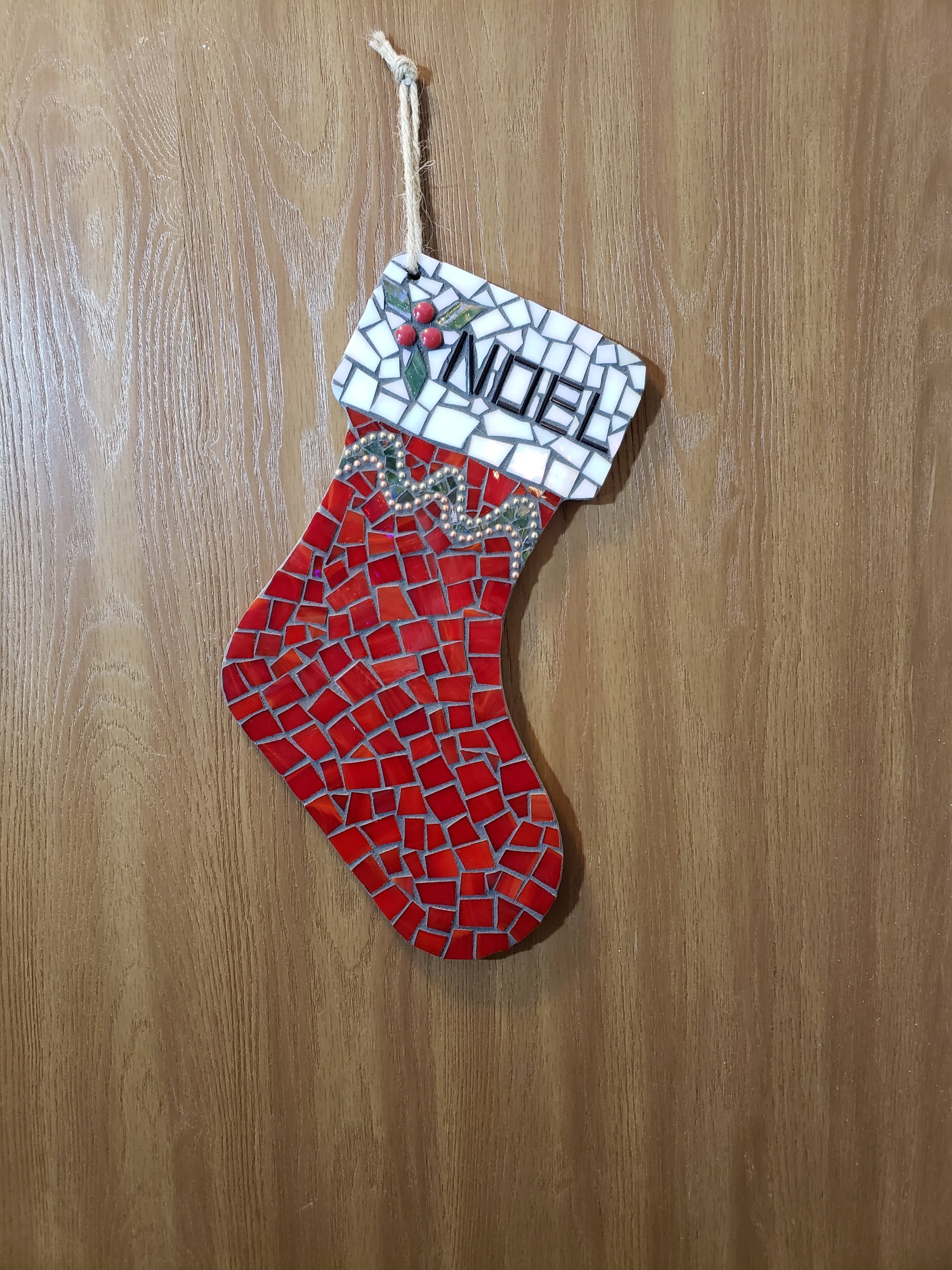 Add a touch of handmade holiday charm to your décor with this festive Christmas stocking mosaic wall hanging. Crafted on a sturdy wooden base, each stocking is beautifully adorned with sparkling glass mosaic tiles that catch the light for a cozy, festive glow. A natural jute cord makes it easy to hang on a wall, mantel, or door — perfect for bringing warmth and cheer to any space.