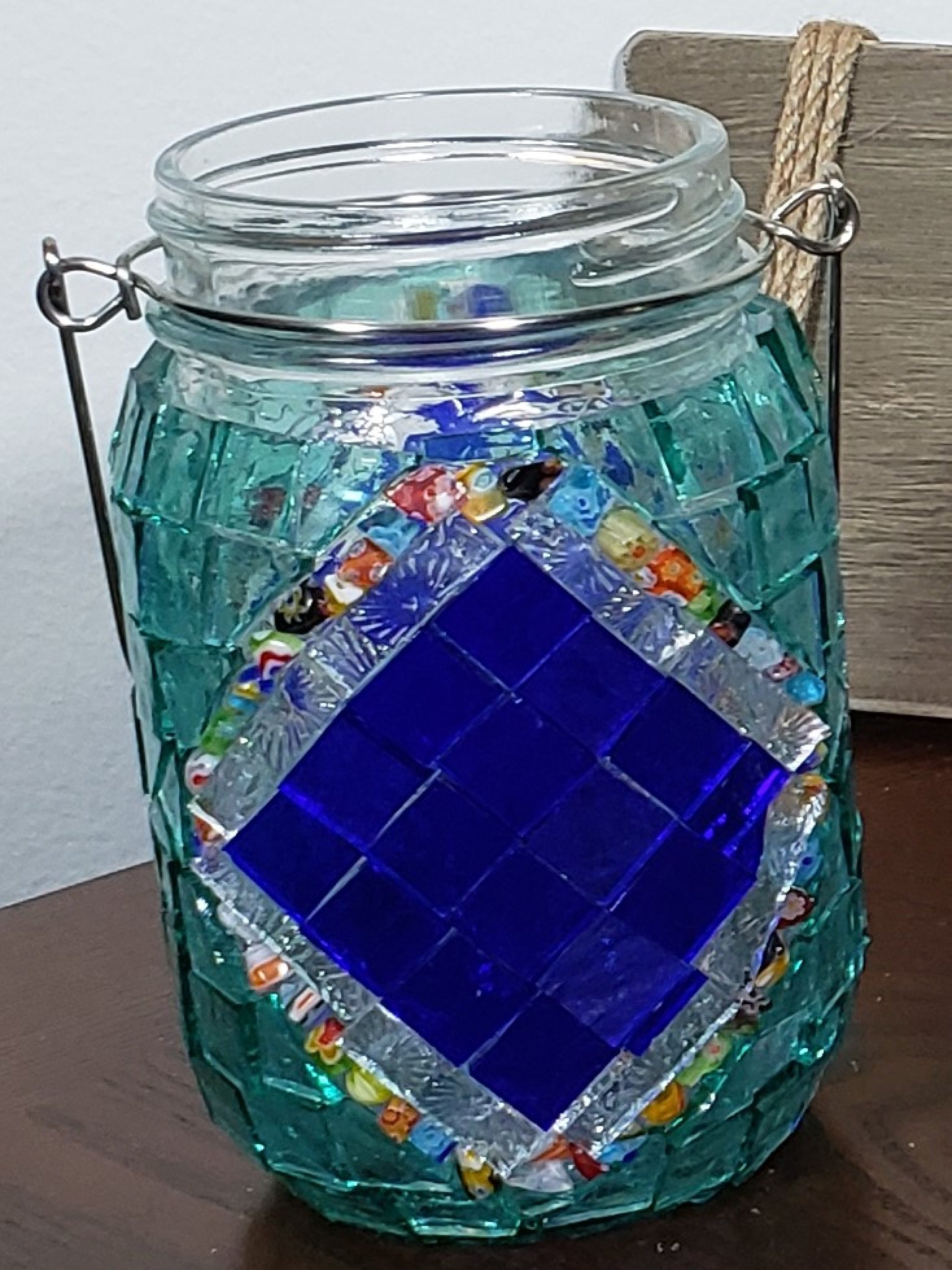 - Blue Diamond Lantern: Featuring a striking diamond pattern of rich blue glass tiles, this lantern stands out with its geometric design. The surrounding light blue translucent glass pieces form a woven-like texture, and tiny multicolored glass beads add an extra layer of vibrancy. The result is a visually dynamic piece that blends bold structure with intricate details.