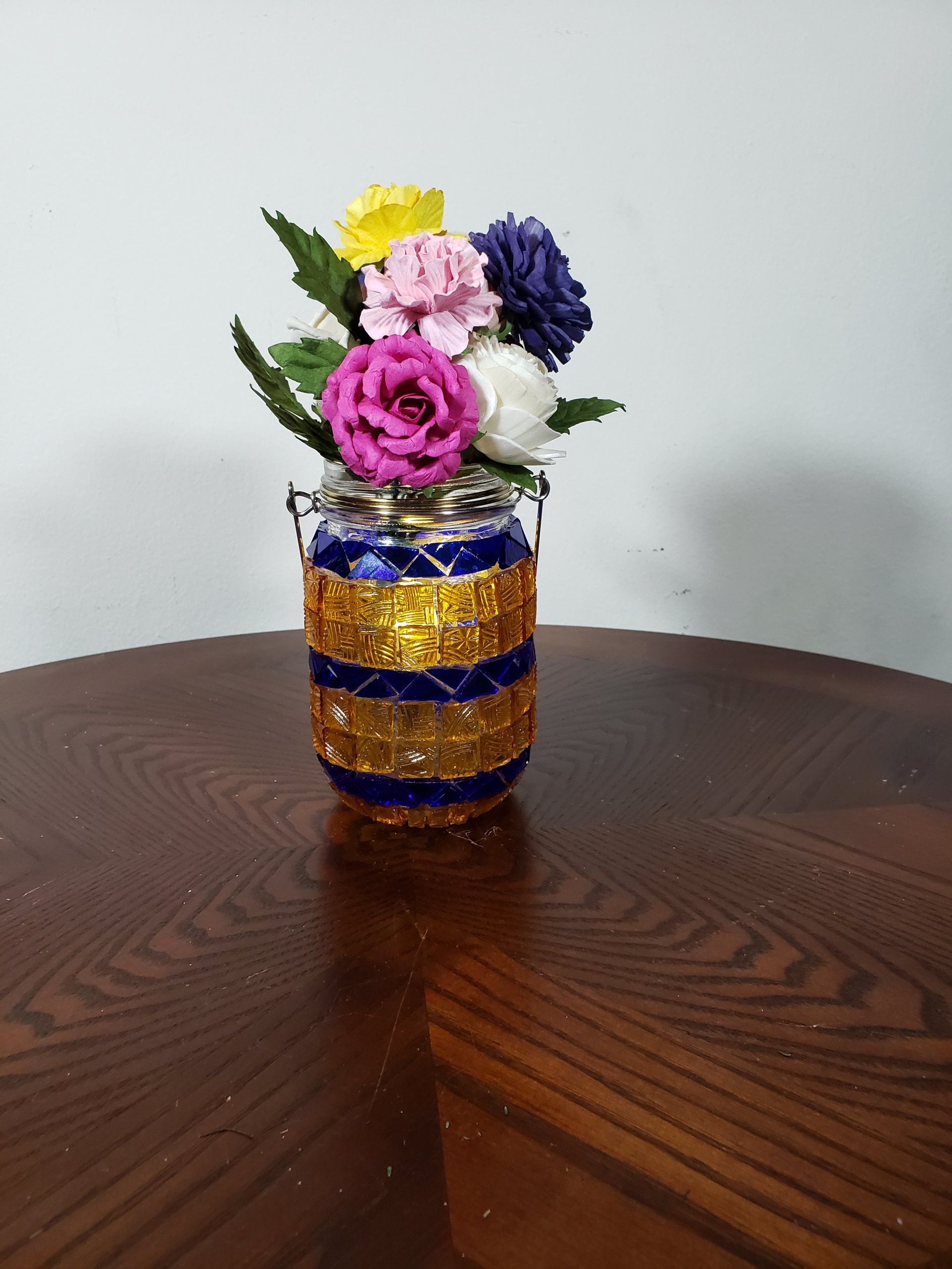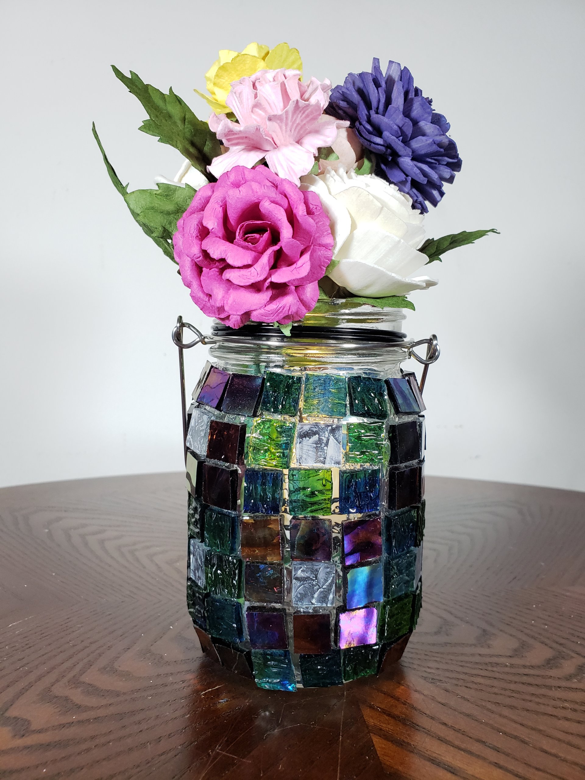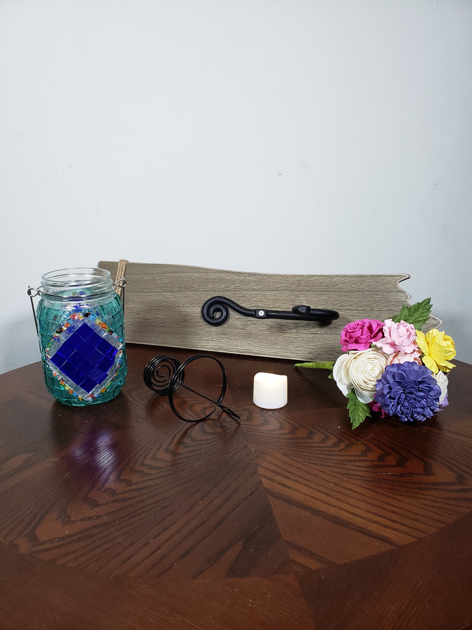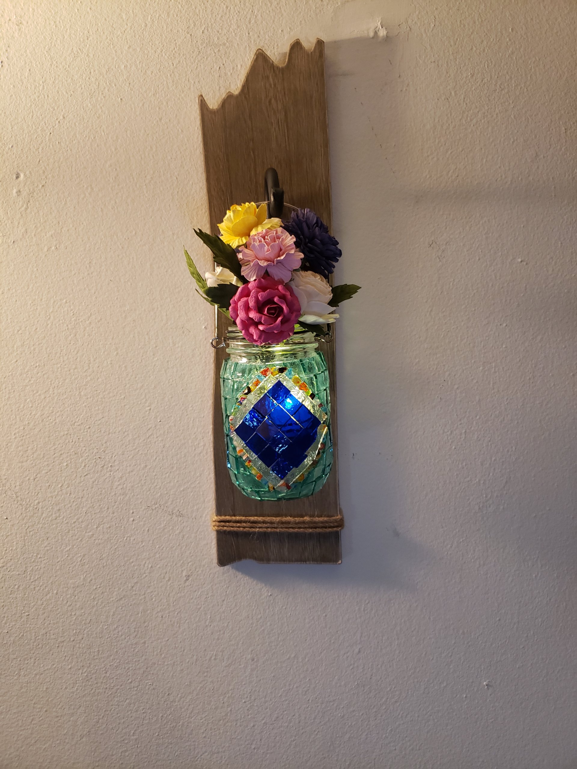 Enhance your home décor with this beautifully handcrafted Mason Jar Mosaic Sconce Lantern. Each lantern features a unique mosaic design, available in five different styles, adding a warm and inviting glow to any space.
