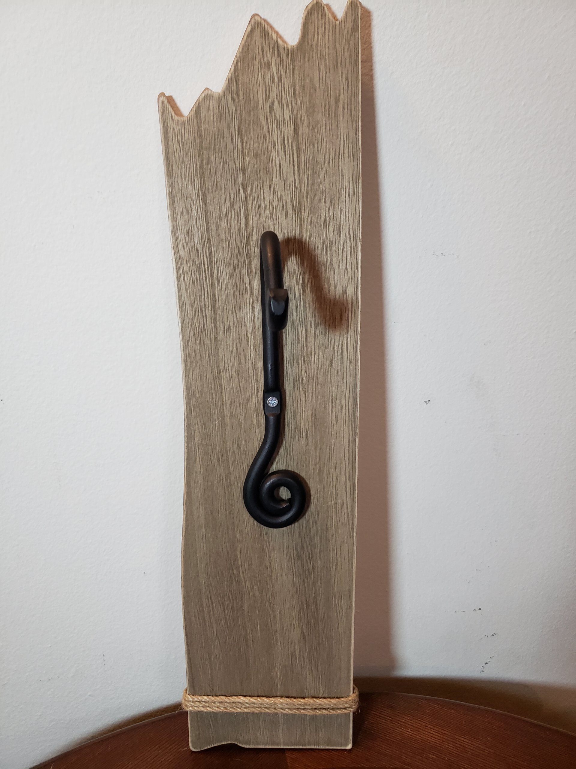 - Wall-mounted wooden sconce board with a decorative metal hook for secure hanging.