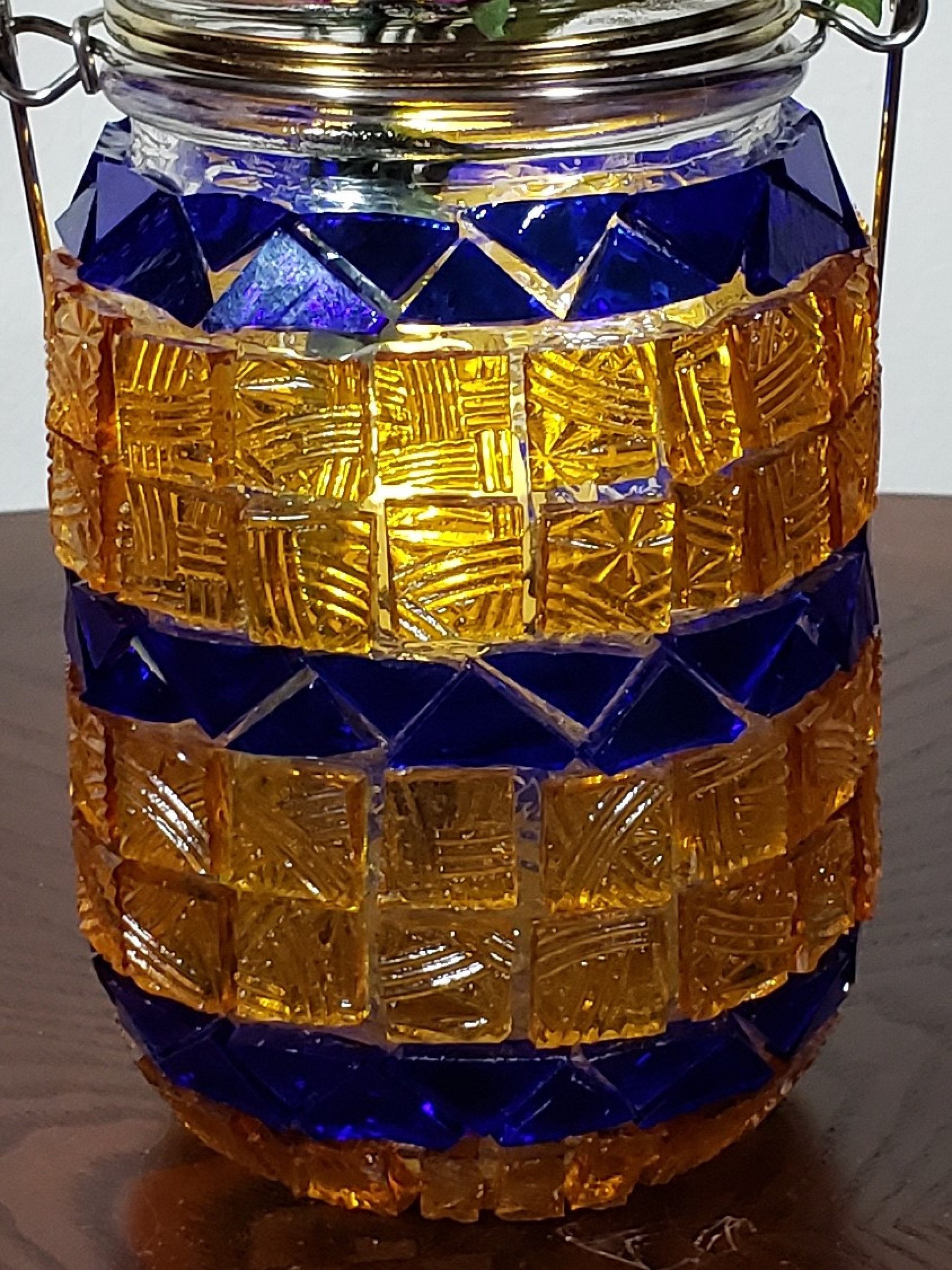- Gold and Blue Lantern: A regal combination of deep blue and amber glass tiles creates a bold striped pattern on this lantern. The textured golden tiles catch the light beautifully, giving it a warm, inviting glow. This piece exudes sophistication and vintage charm.