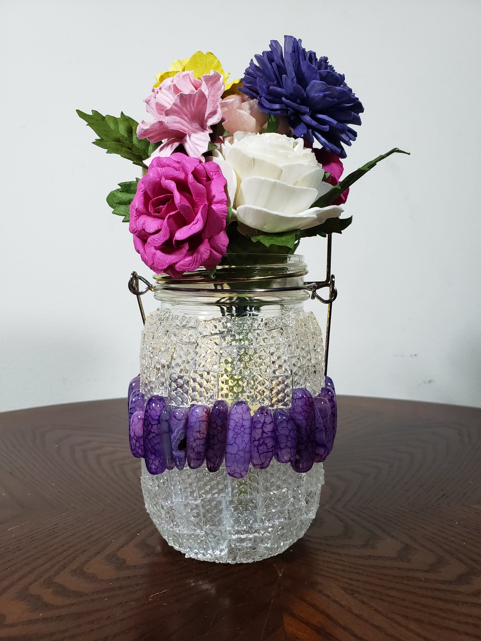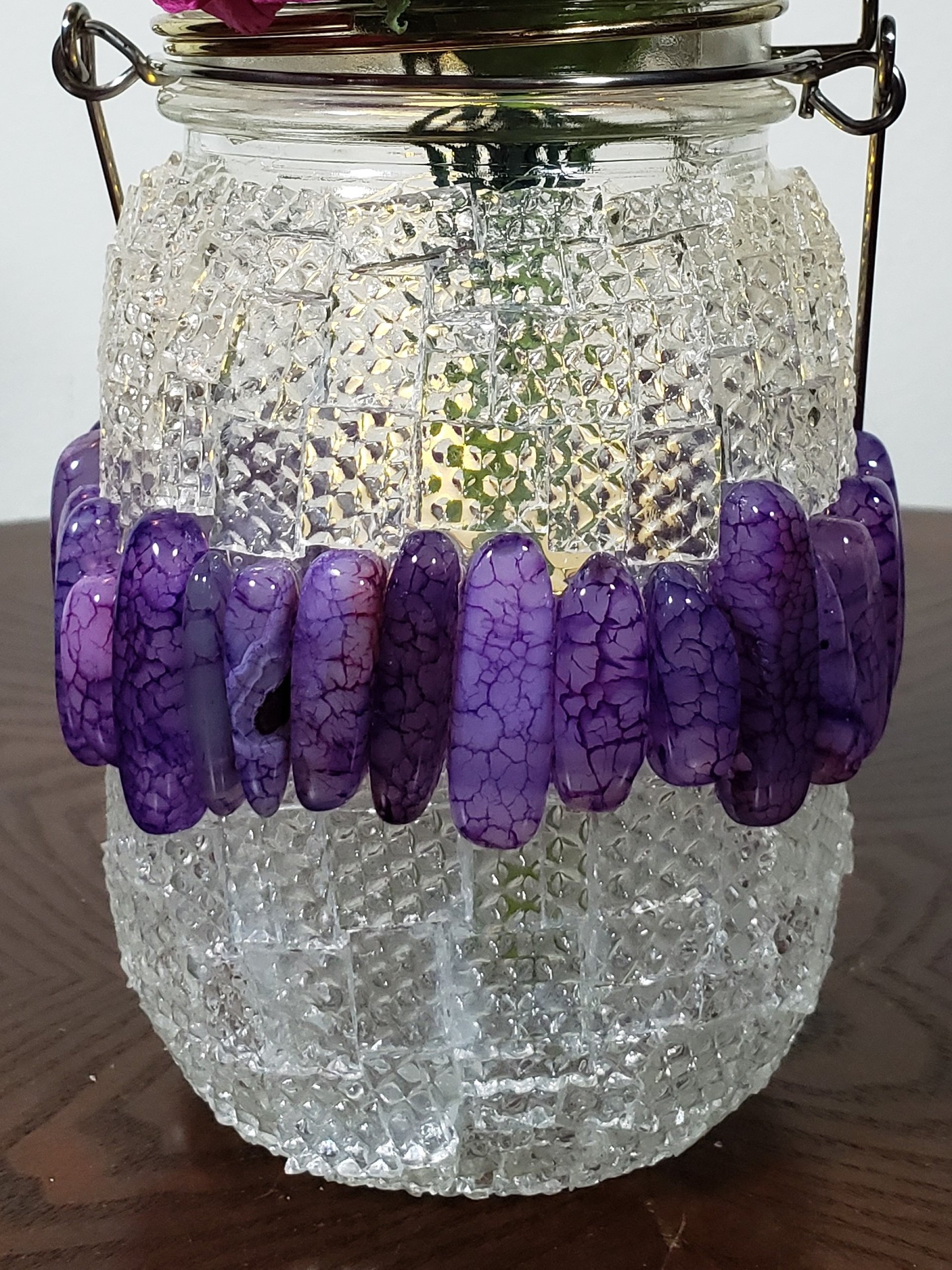 - Clear and Purple Agate Lantern: The textured clear glass surface of this lantern shimmers with a delicate, frosted appearance. Around its midsection, a bold band of purple agate stones adds a natural, organic contrast, making this piece a fusion of elegance and rustic charm.