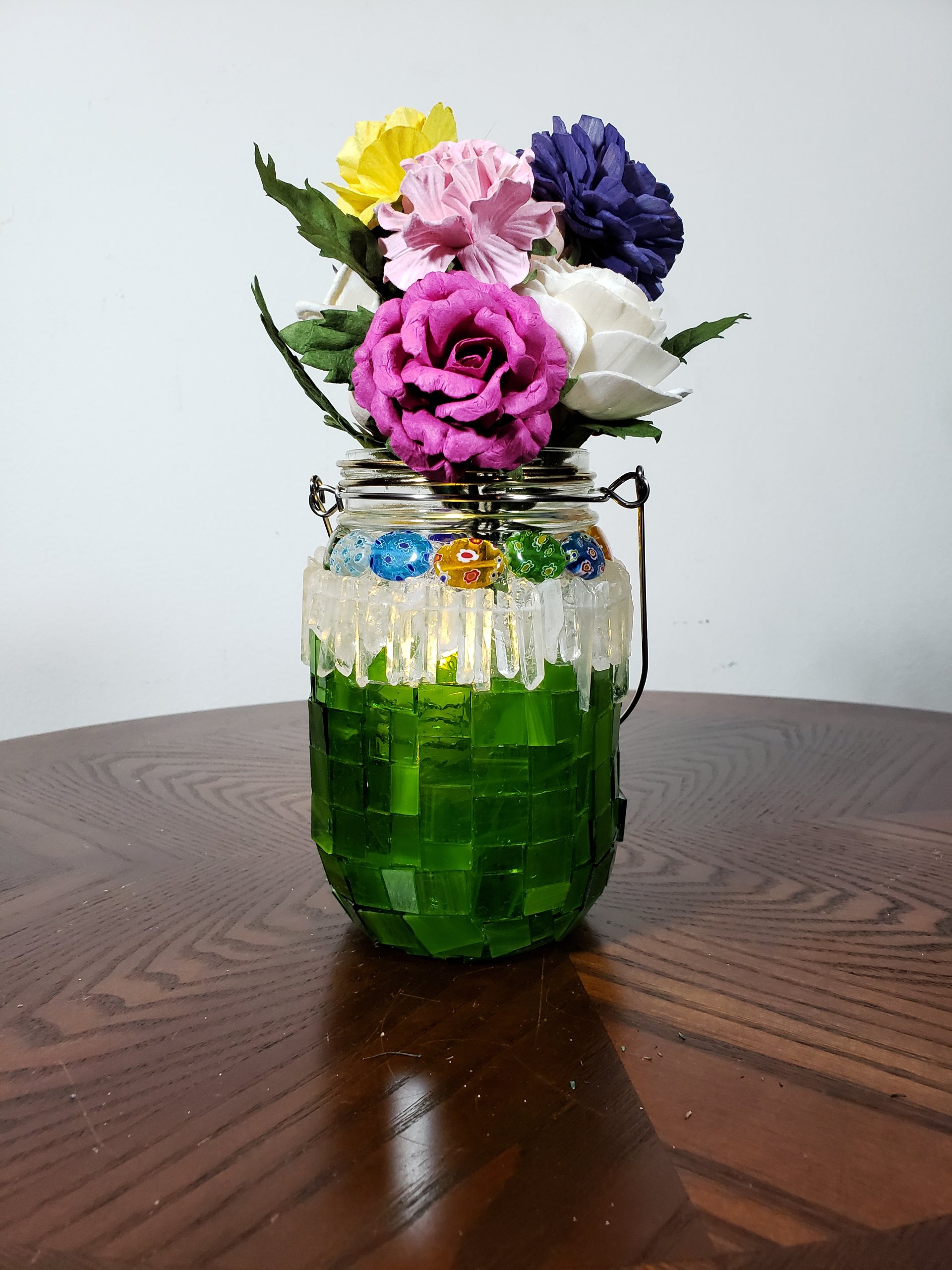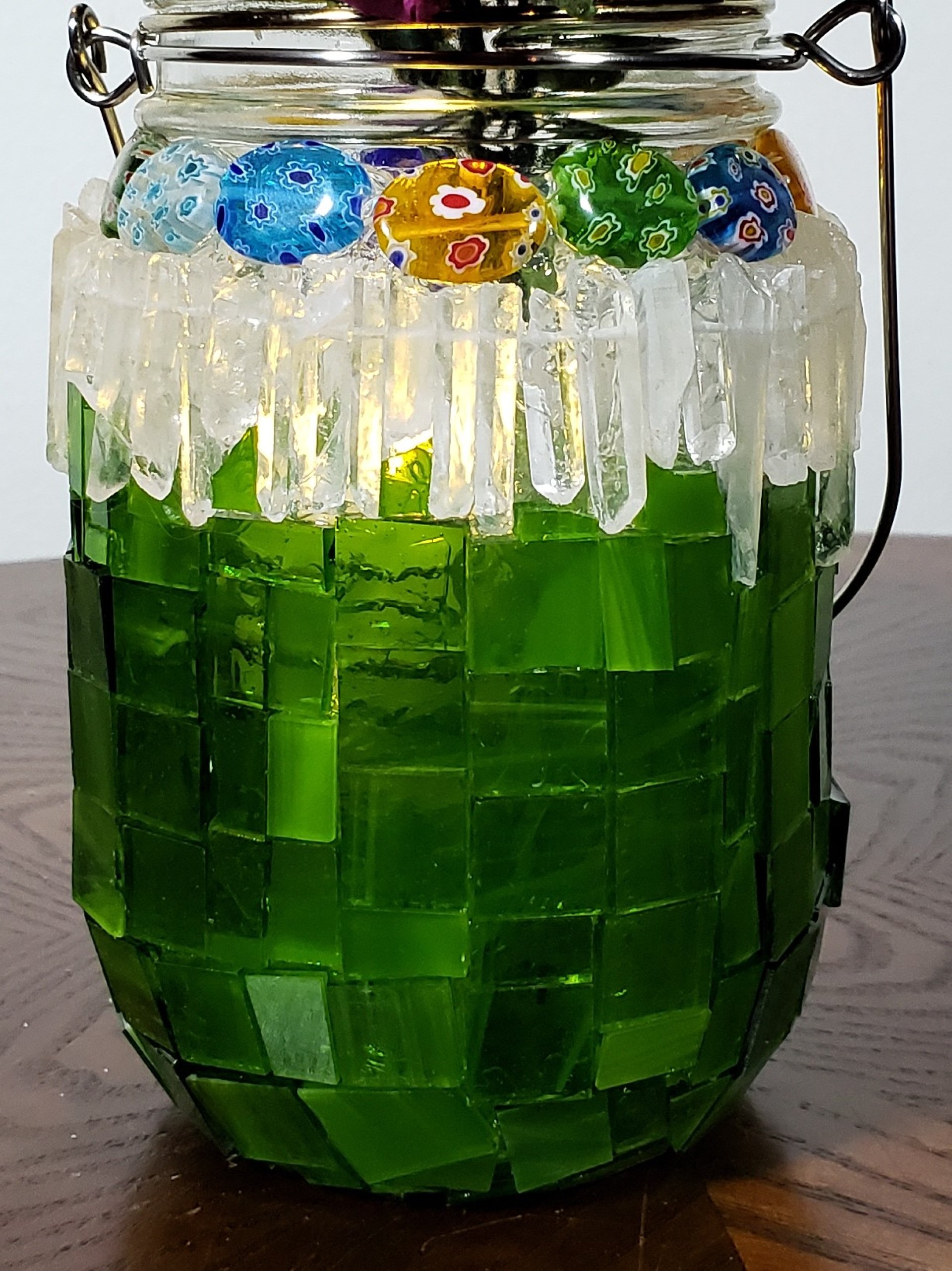 - Green and Millefiori Lantern: A rich green glass mosaic covers the base of this lantern, creating an earthy, calming aesthetic. The upper section features cascading clear glass tiles that resemble melting wax, while a row of colorful millefiori glass beads adds a whimsical, artistic touch.