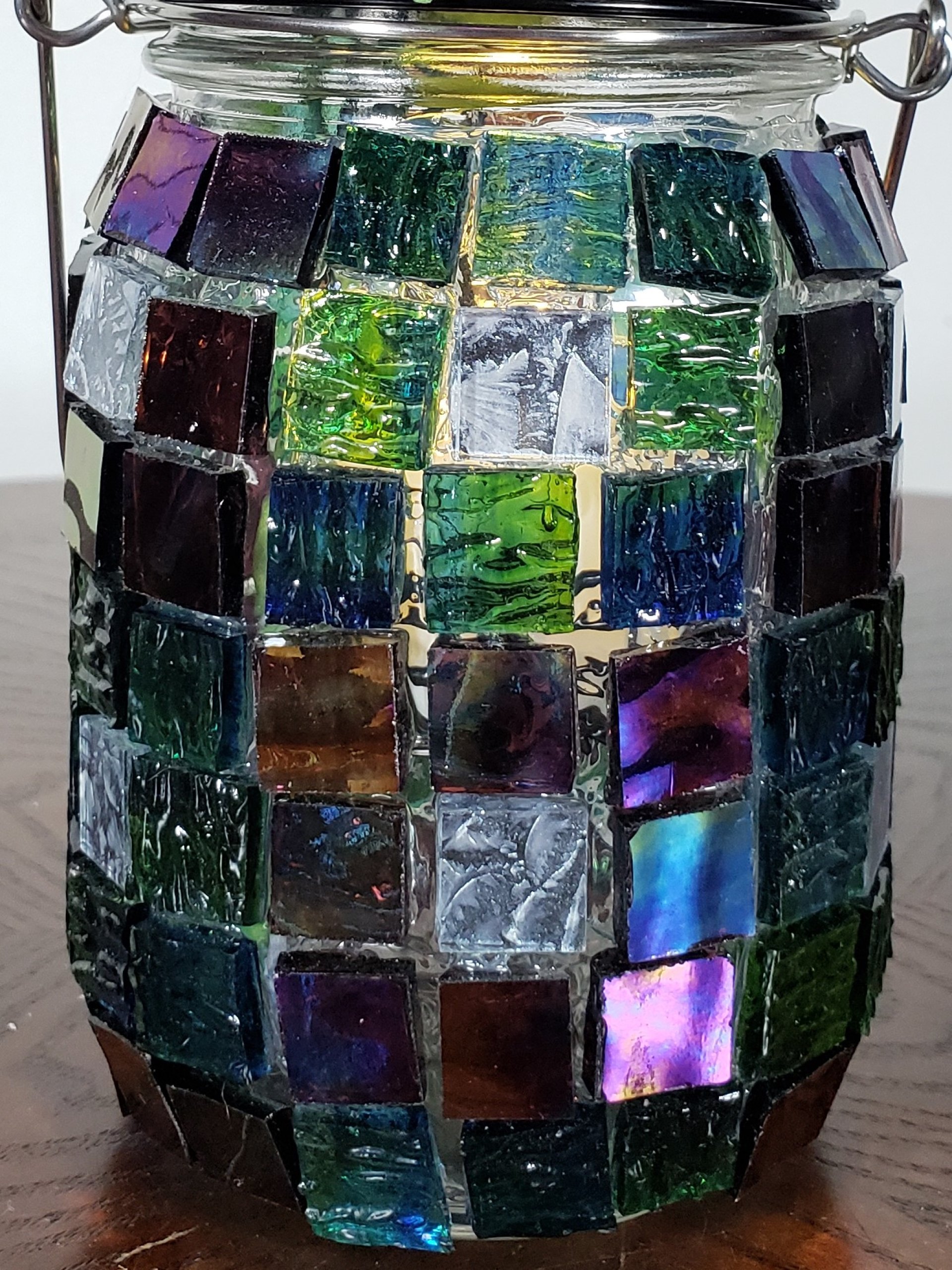 - Multicolor Iridescent Lantern: This lantern showcases a dazzling mix of deep greens, blues, and hints of purples in a patchwork mosaic design. The stained glass tiles reflect light beautifully, creating a dynamic interplay of colors. The textured surface enhances its artistic appeal, making it a striking accent piece.