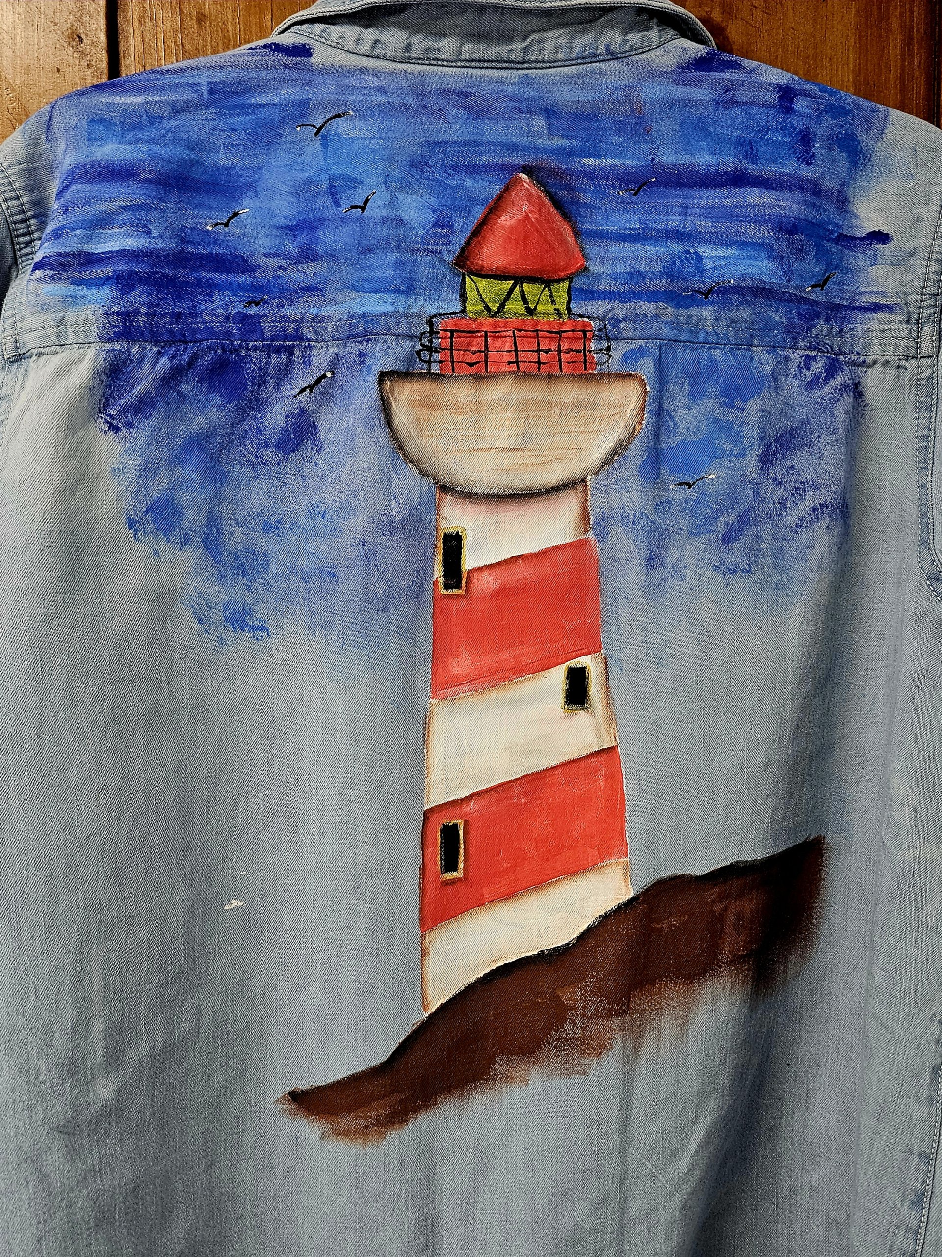 This unique shacket features a beautiful lighthouse hand-painted directly onto the denim using high-quality fabric paints. The design has a traditional east coast style!