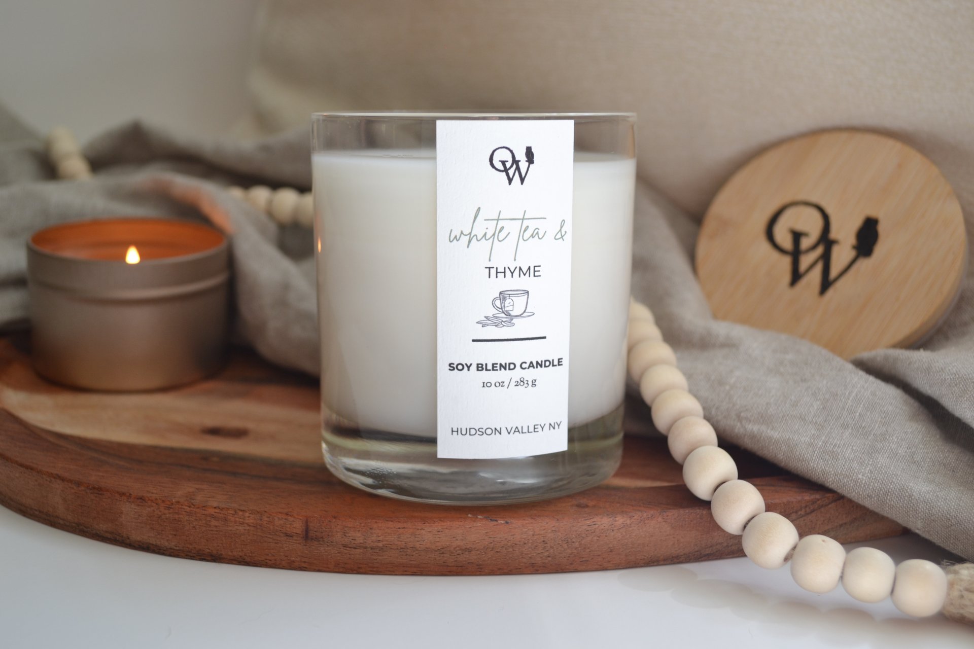 White Tea & Thyme captures the experience of sipping herbal tea in a French potager garden. It's a clean, spa-like fragrance and perfect for all seasons. Infused with thyme, coriander, cucumber, violet, jasmine, rose & musk. This is one of our strongest fragrances and a year-round top seller. You can expect a 35-40 hour burn time with proper wick trimming.