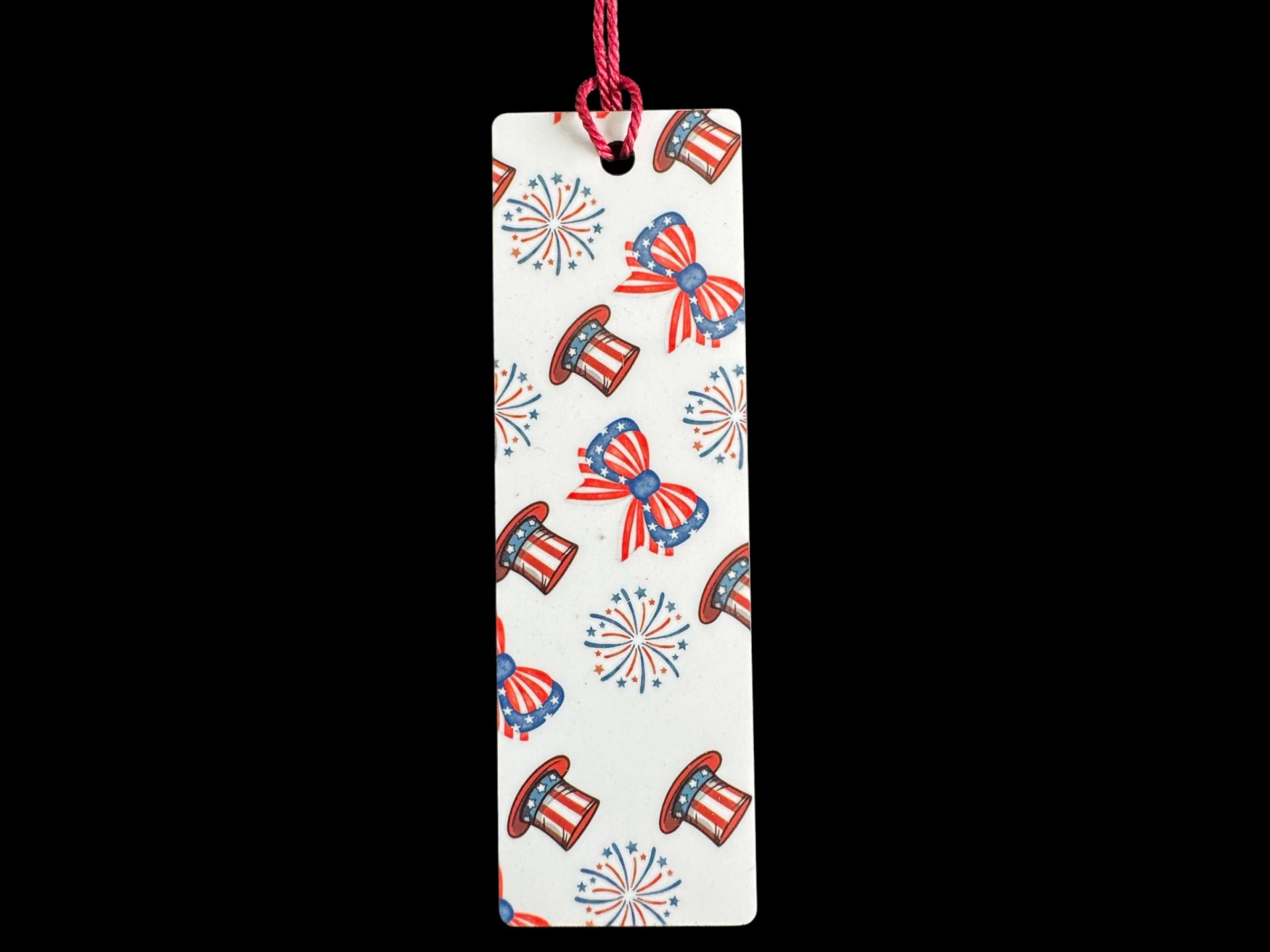 Short bookmarks in our Patriotic Fun print. Tassel colors may vary.