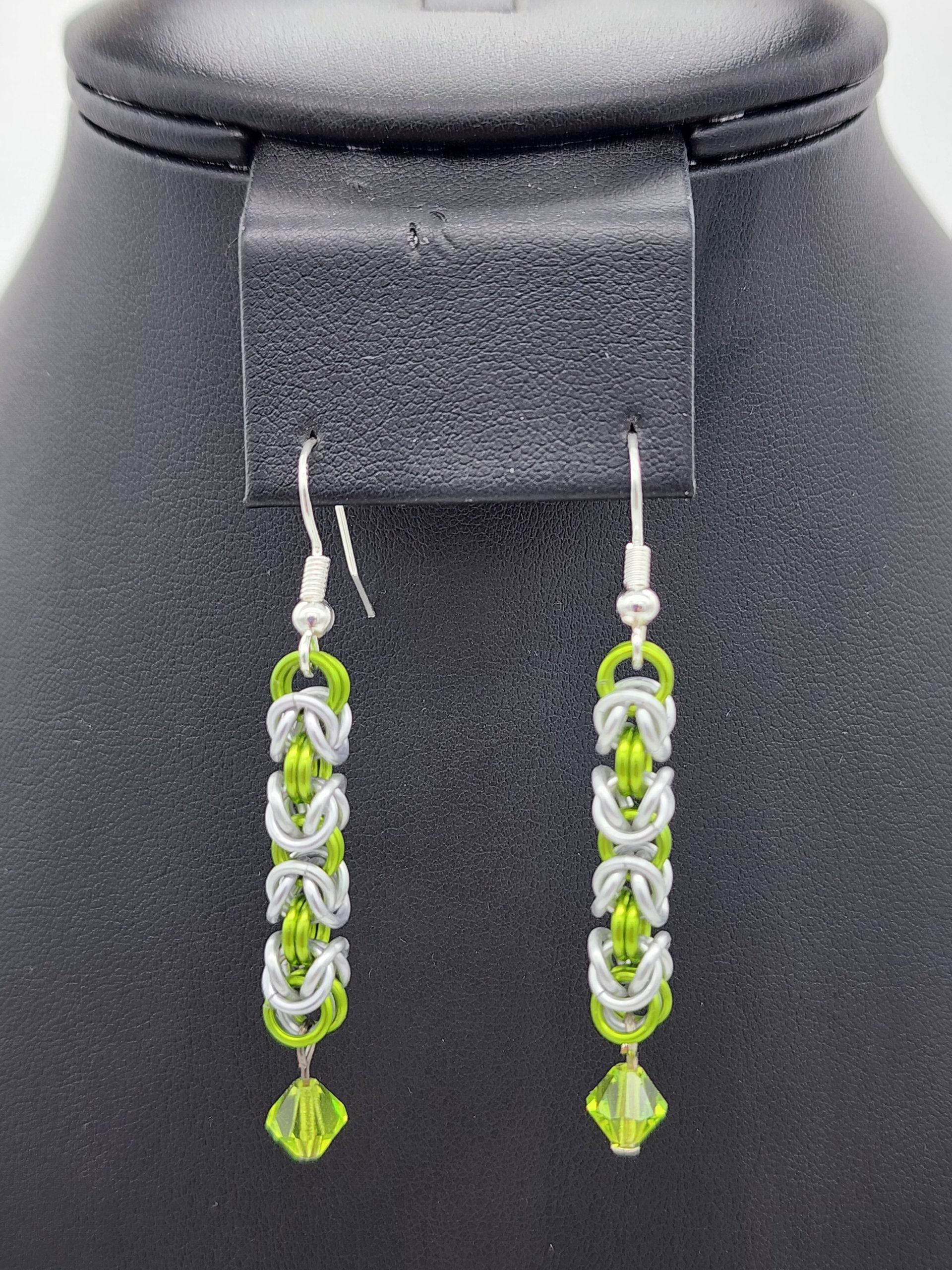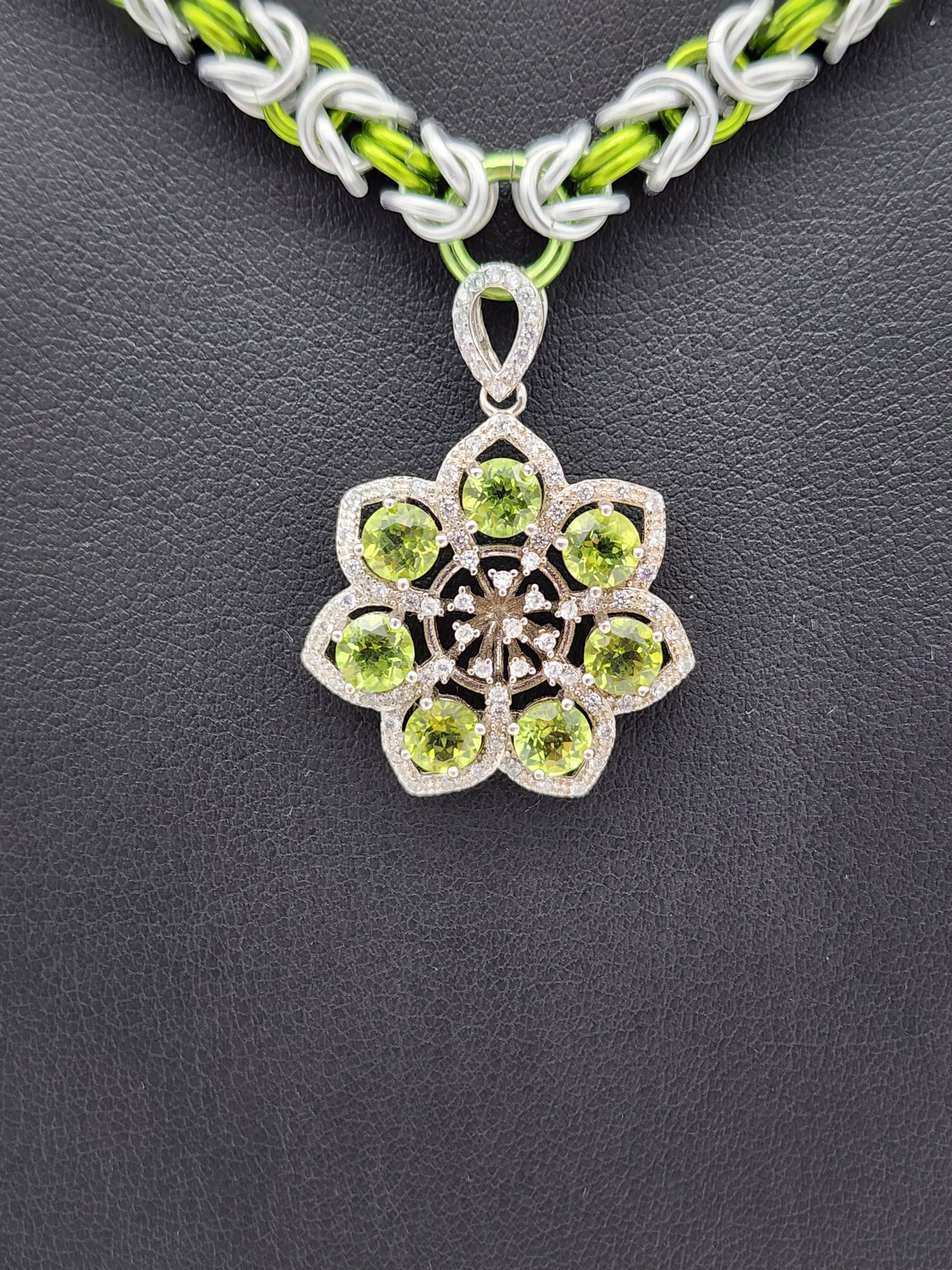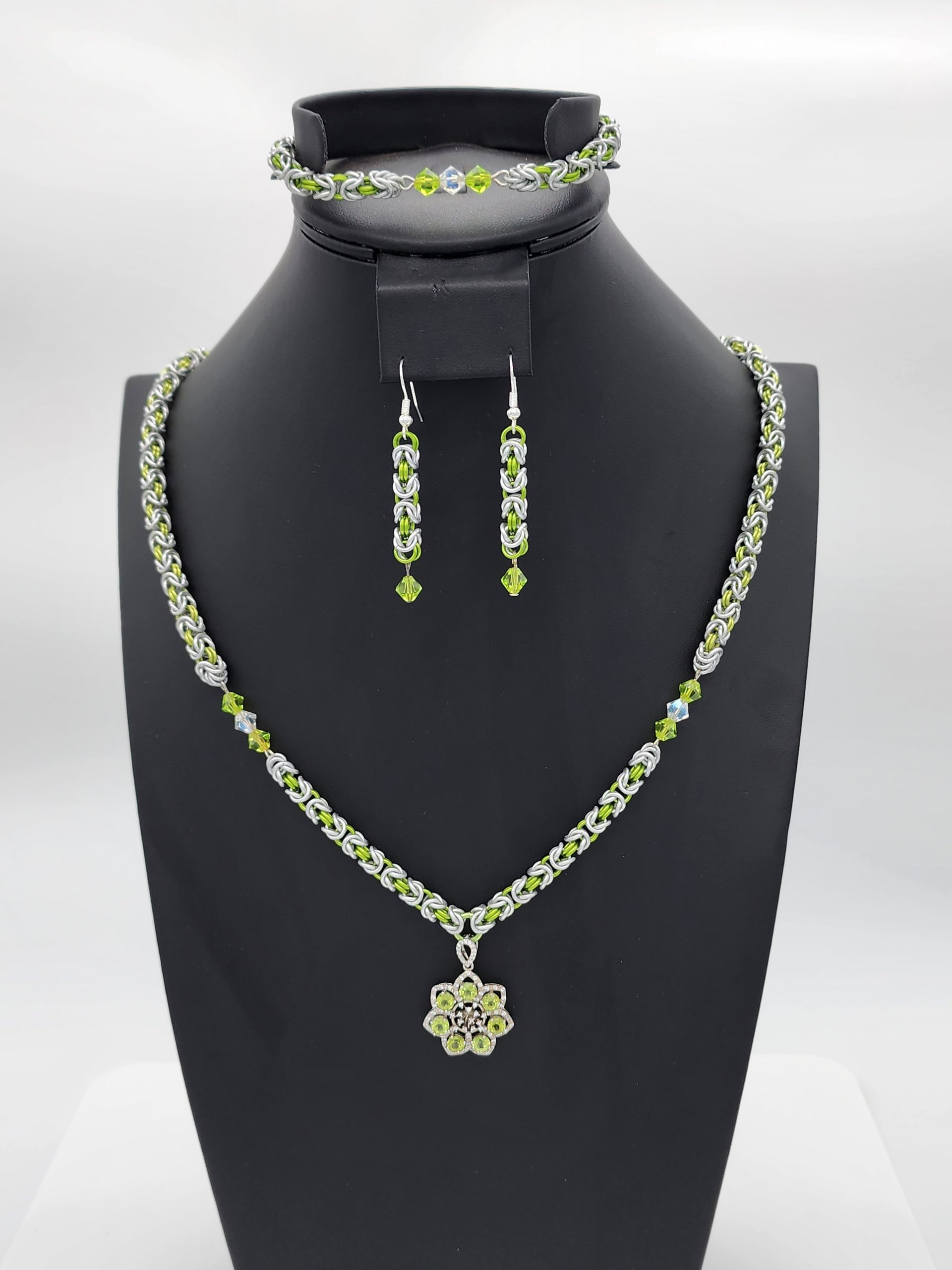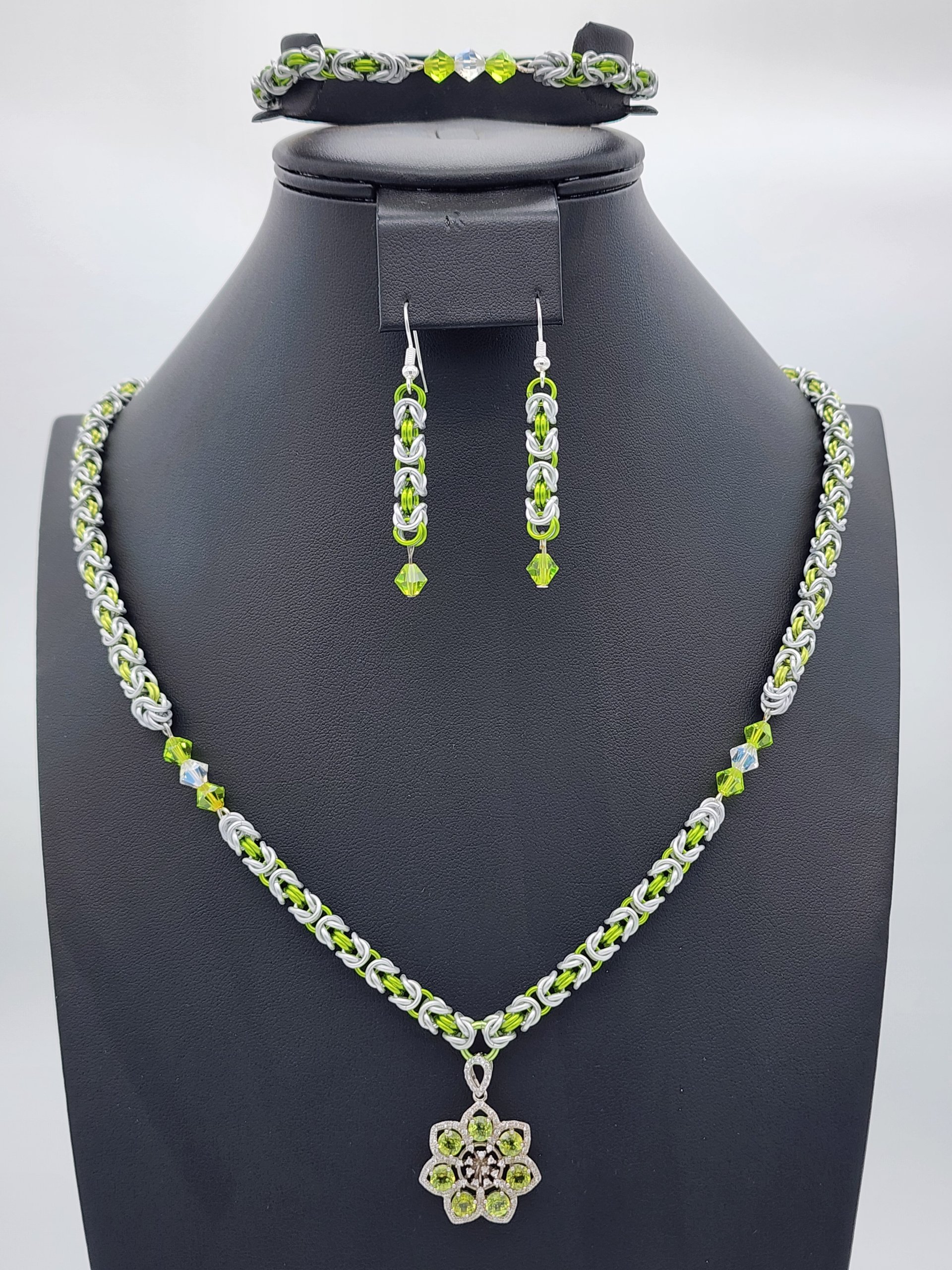 Adorn yourself with this exquisite Byzantine anodized aluminum chainmaille jewelry set, meticulously handcrafted for the discerning jewelry lover. The set includes a stunning necklace showcasing a genuine peridot and cubic zirconia pendant, perfectly complemented by a matching bracelet and earrings featuring shimmering crystal bicone beads.