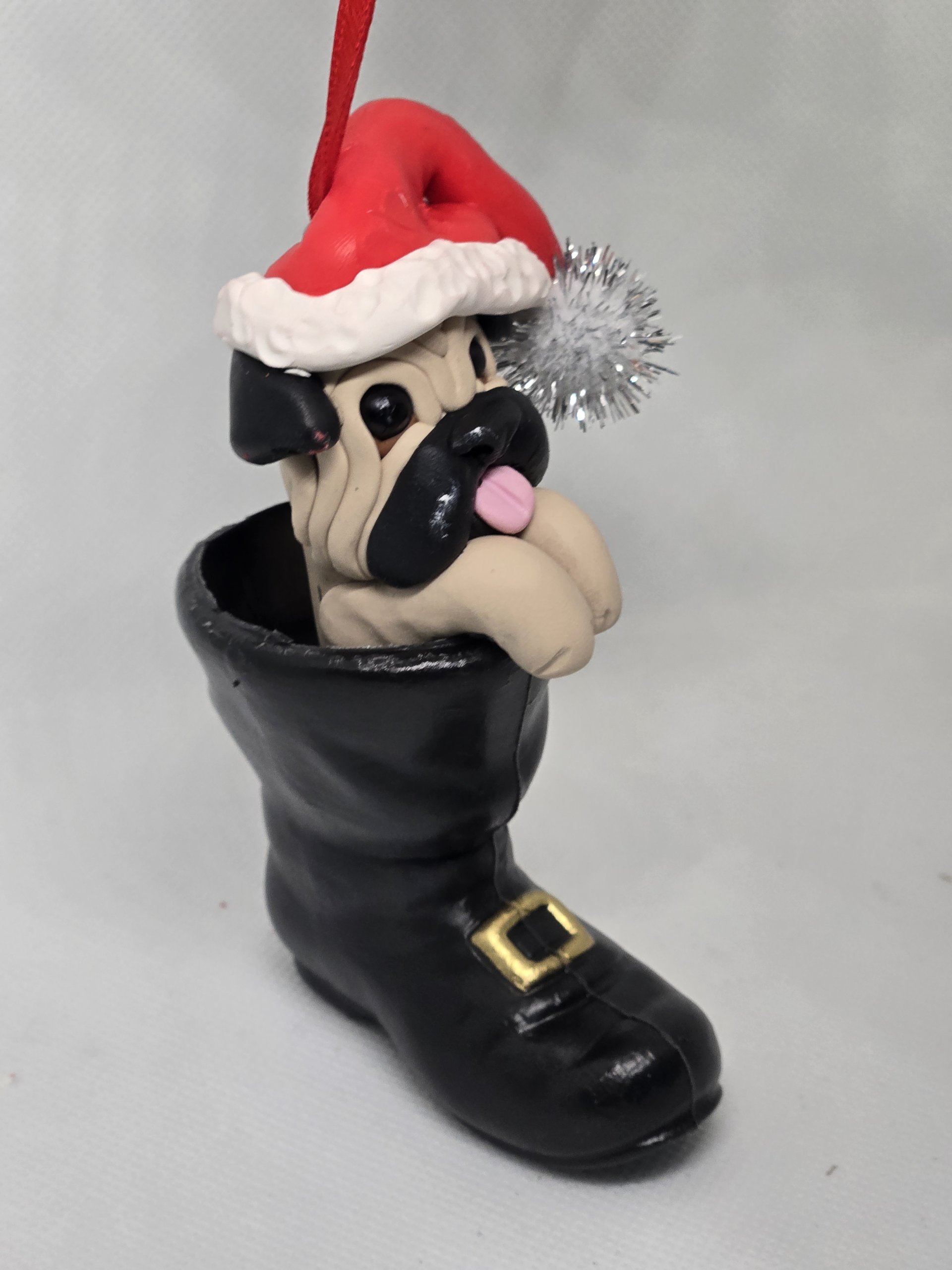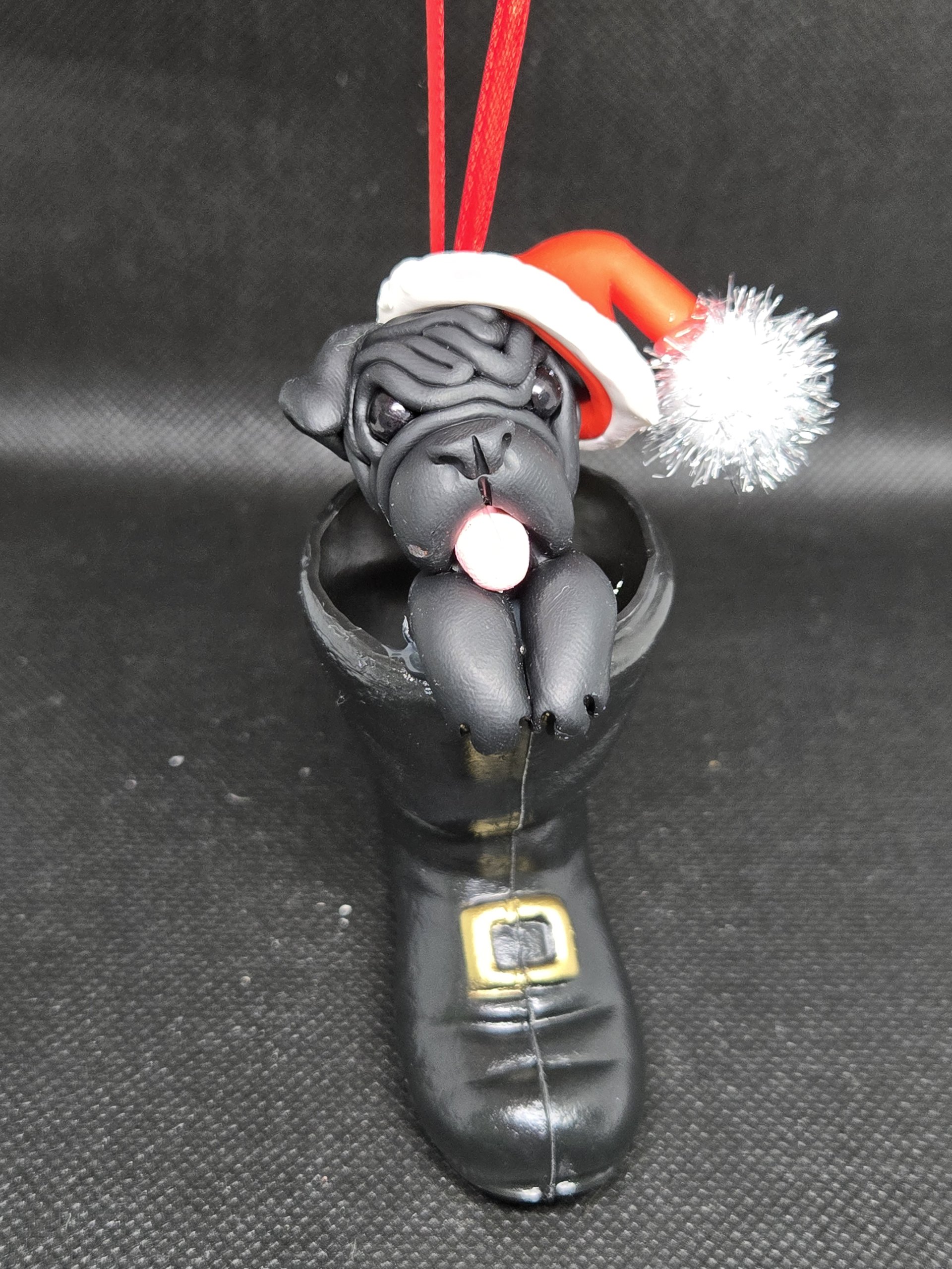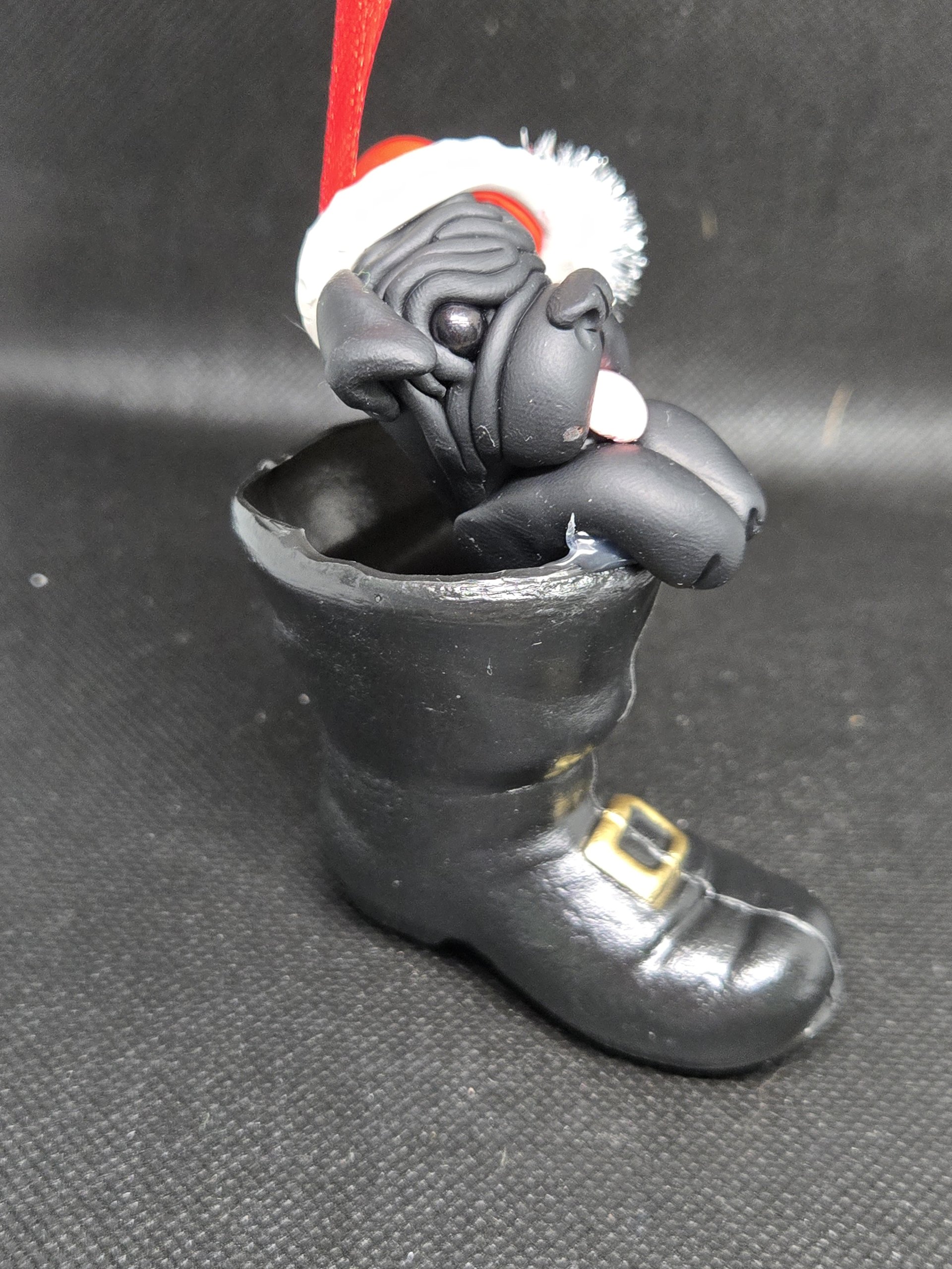 I have crafted a unique dog figurine from colored polymer clay, which is attached to a plastic boot that can be personalized with your pet's name. The name will be elegantly inscribed in silver across the front of the boot. Each piece may vary slightly from the one shown in the picture, as they are all one-of-a-kind creations.