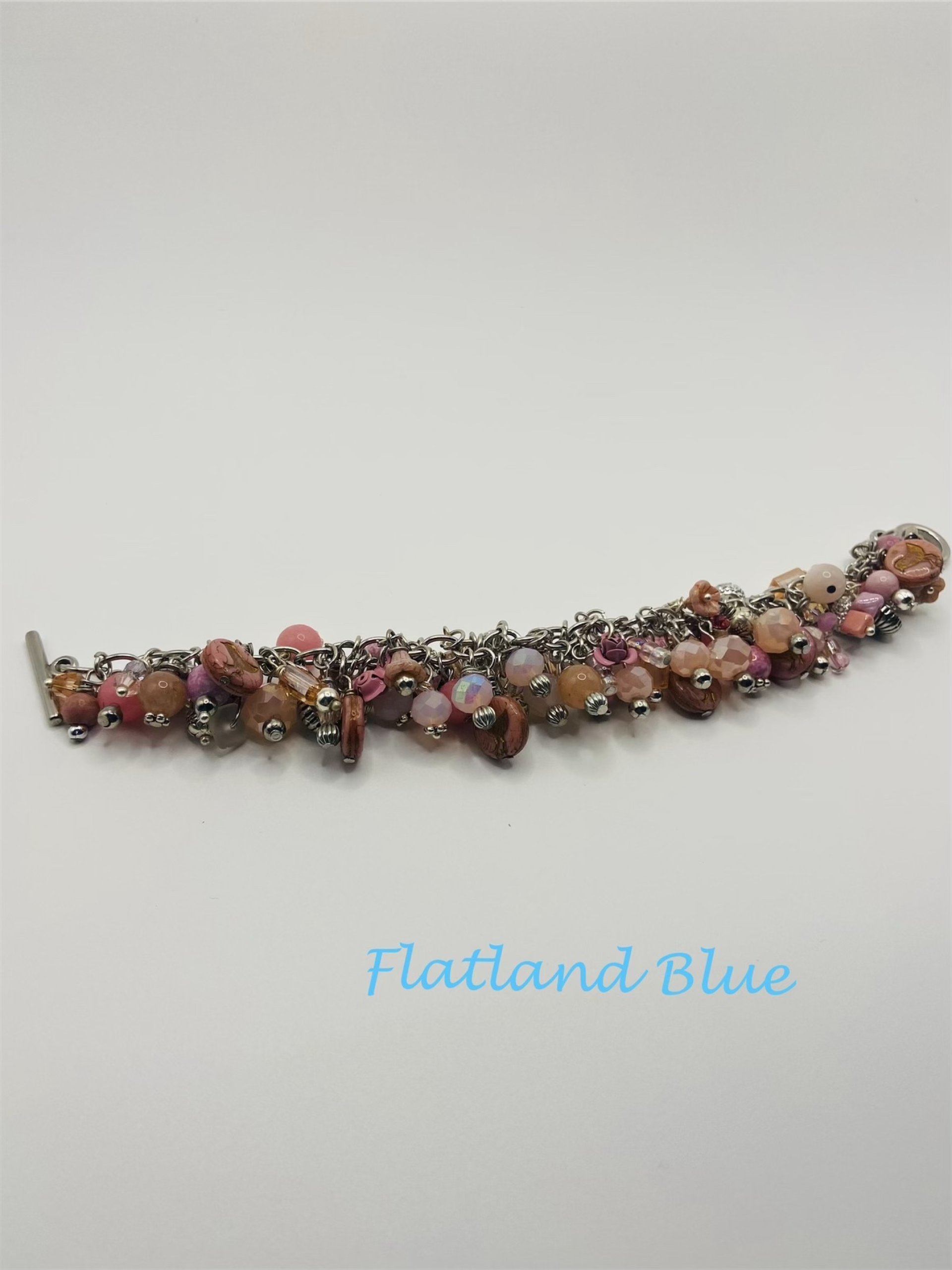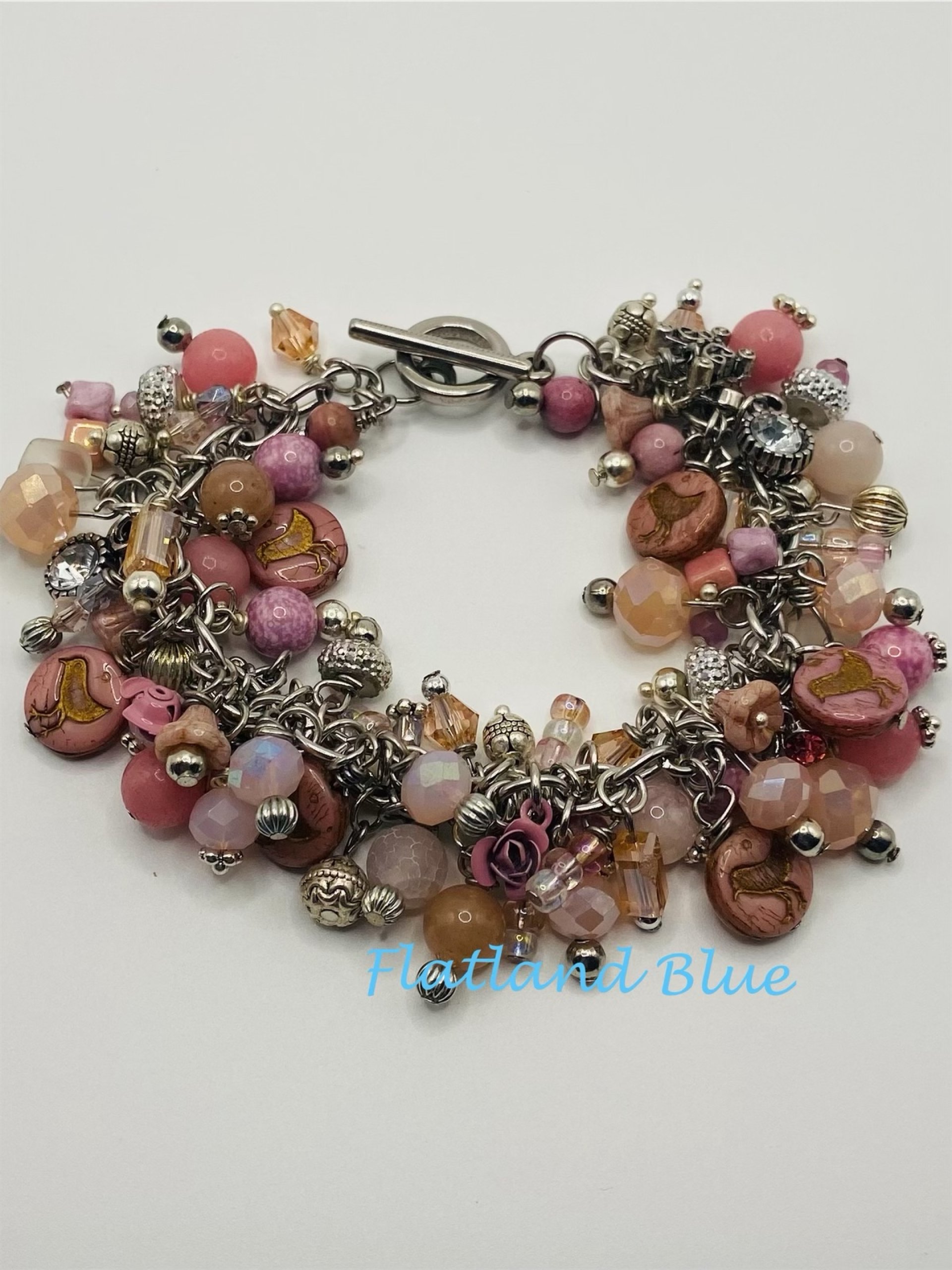 This cha cha bracelet is a vibrant and stylish piece of jewelry that showcases an assortment of materials, primarily in shades of pink. Each bead is individually hand-wired, which not only enhances the artistic quality but also ensures that each piece is unique. This technique allows for flexibility in movement, giving the bracelet a lively feel when worn. The cha cha bracelet measures approximately 7.5 inches in length. This size makes it suitable for most wrist sizes while allowing for comfortable wear throughout the day.