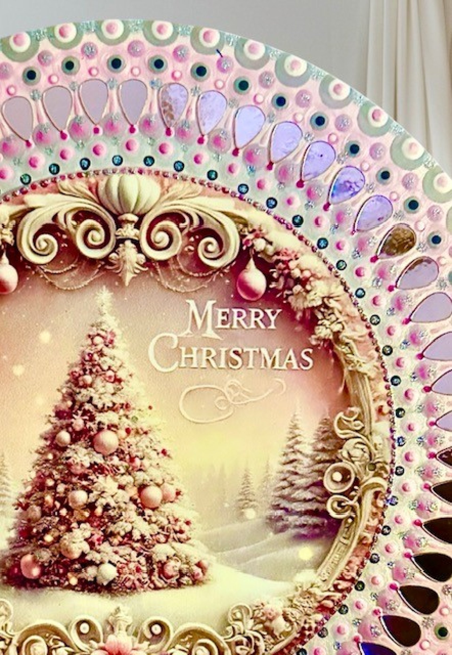 I love anything Christmas, and this 10" wooden circular is no exception! The 8" insert is framed with shades of pink and mirrored teardrops. The lightweight base is perfect for hanging or displaying on a table. This piece is sure to add Christmas charm to your collection.