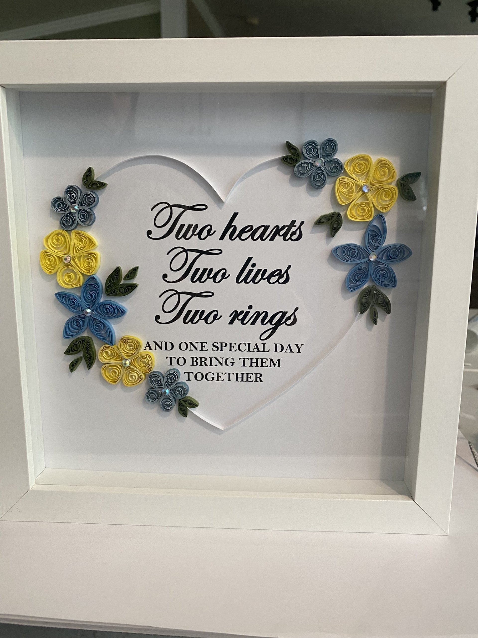 This is a handcrafted, framed piece of quilled art. The design features a central heart shape, around which are arranged several quilled floral elements. The entire piece is set against a white background and framed in a simple white frame, giving it a clean and elegant look. This unique artwork would make a perfect gift or keepsake.