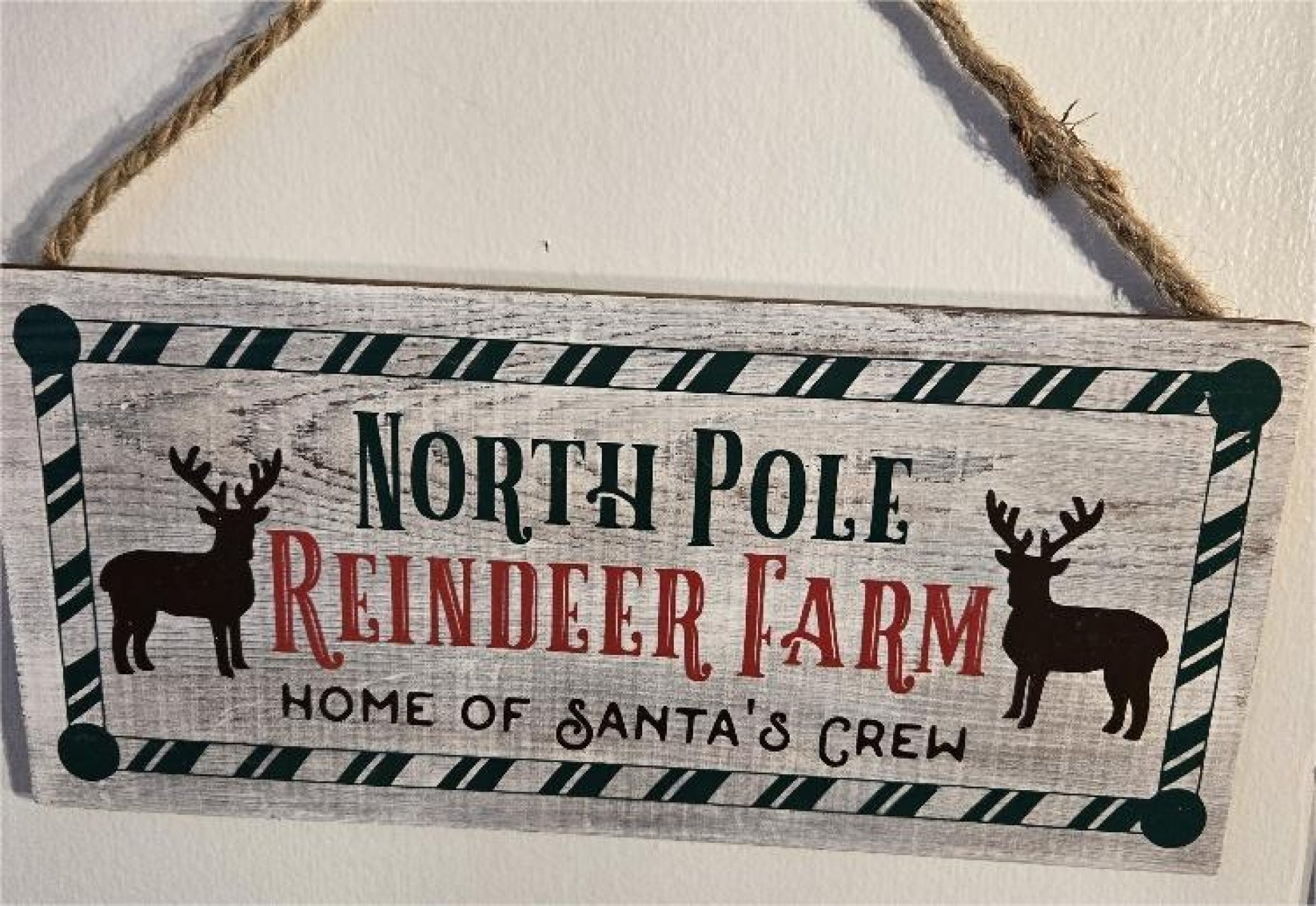 A charming holiday accent Festive design: The sign features a delightful design with reindeer silhouettes and the phrase "North Pole Reindeer Farm, Home of Santa's Crew."