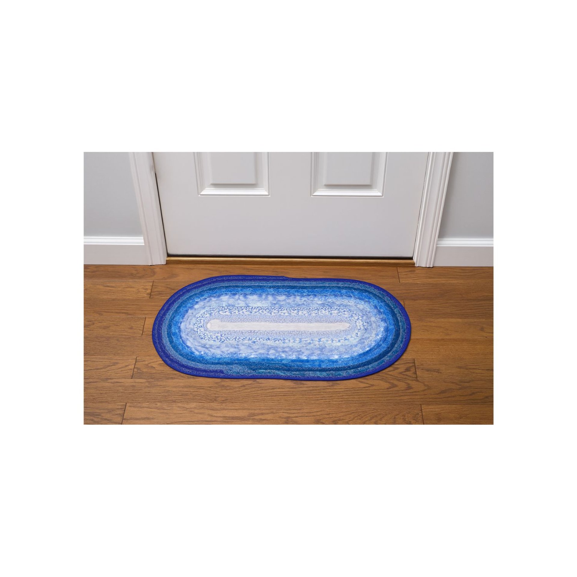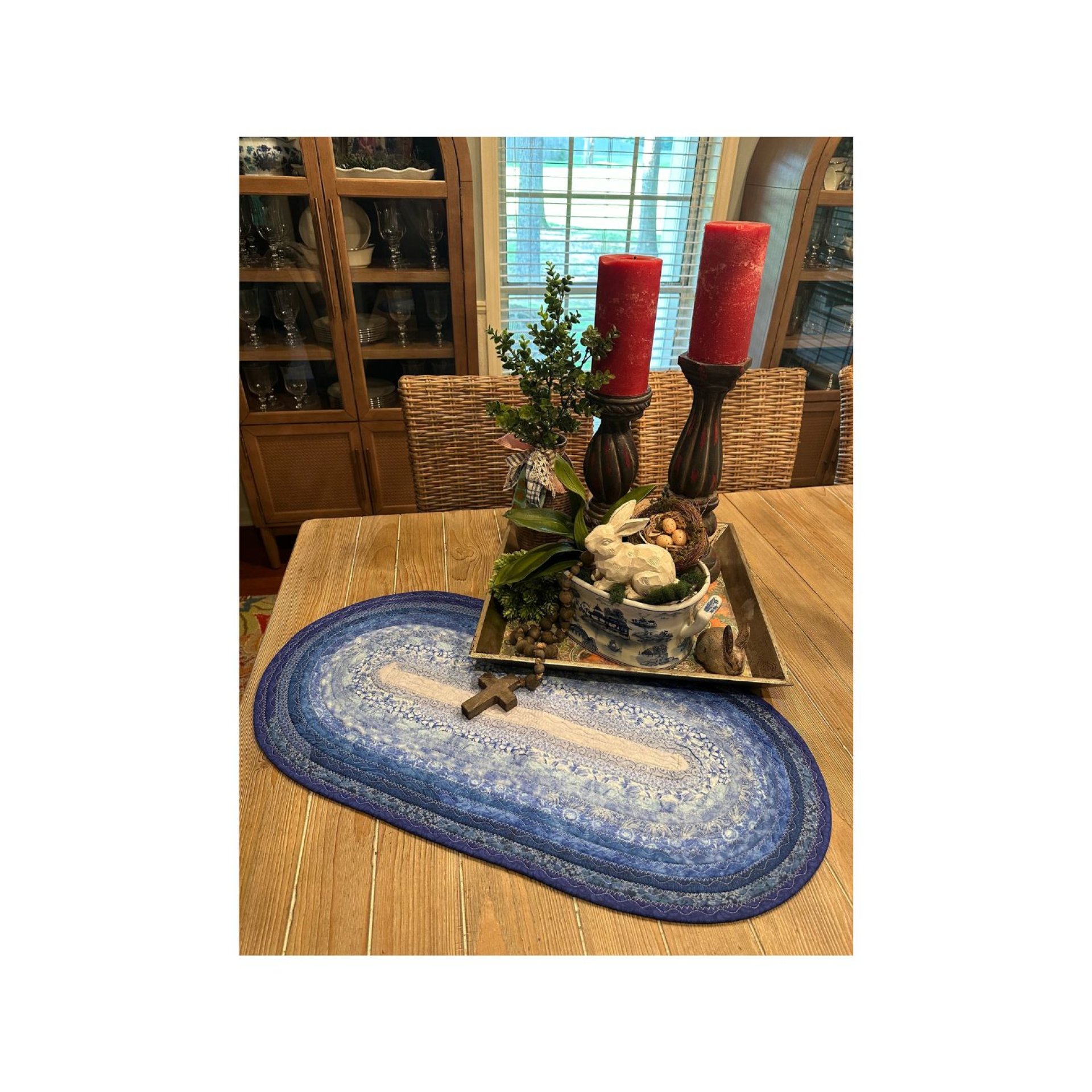 Measuring 35" x 17", Rhapsody in Blue is a versatile handmade piece that can be enjoyed as either a small rug or a table runner. Its oval design features layered shades of sapphire, sky, and cloud white, creating a soothing flow of color reminiscent of the sea. As a rug, it adds comfort and charm to entryways, kitchens, or bedside spaces, offering both softness and durability. As a table runner, it brings a striking focal point to dining, buffet, or console tables, blending function with artistry. Whether underfoot or on display, this cotton creation enhances your home with timeless, handcrafted beauty.