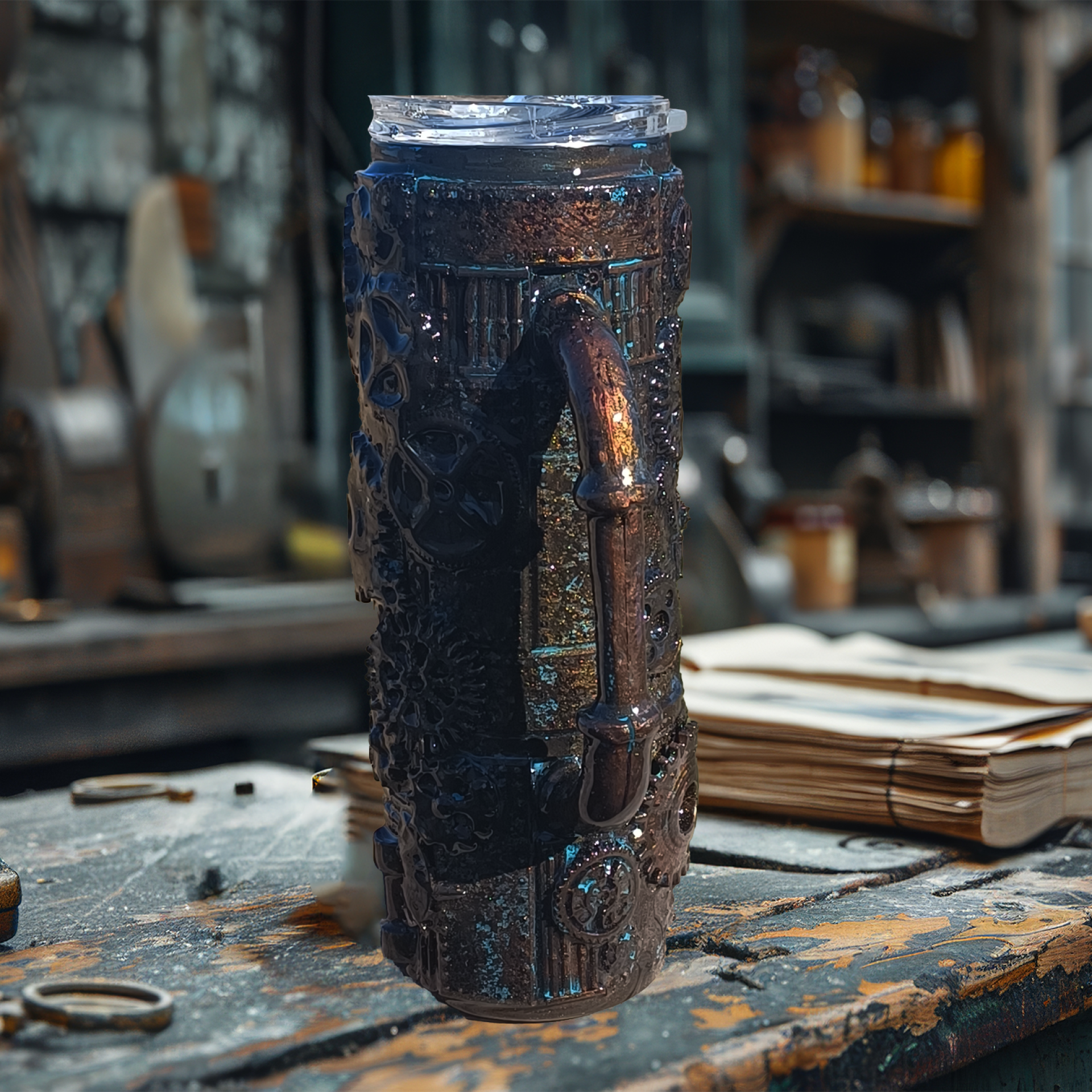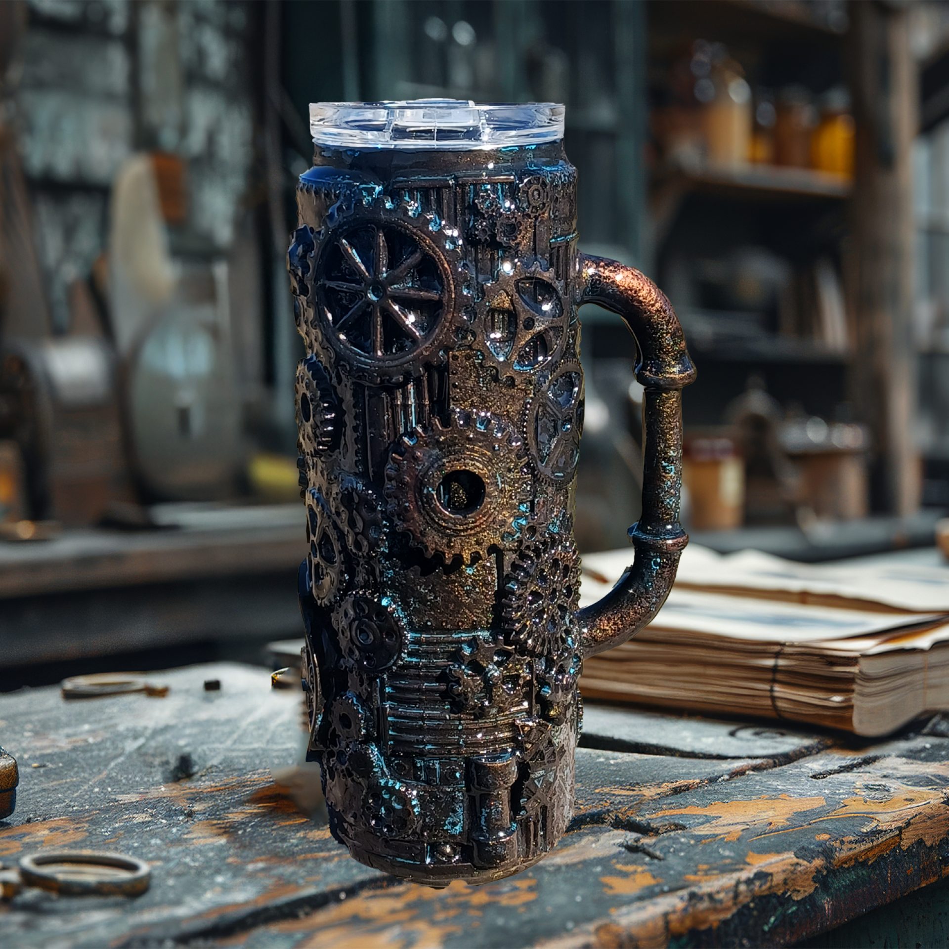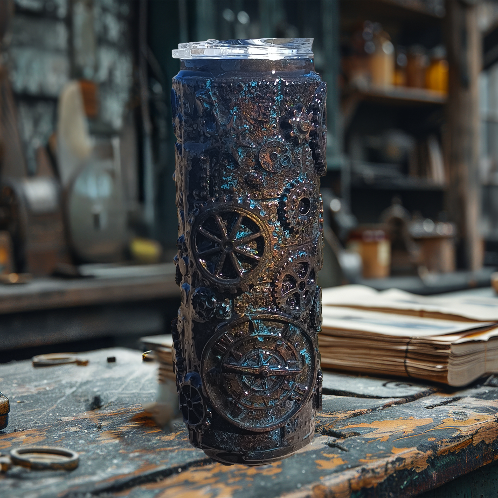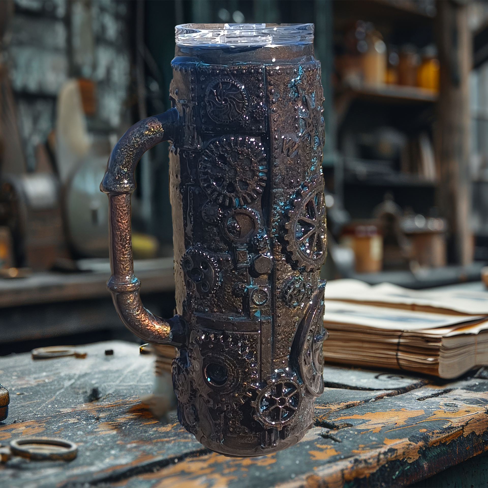 Bring the spirit of industrial rebellion to your everyday routine with the Rust & Revolution tumbler. This one-of-a-kind handcrafted piece showcases a dramatic 3D steampunk design, covered in intricately layered gears, pipes, rivets, and textured panels that look forged from a bygone era of steam and steel.