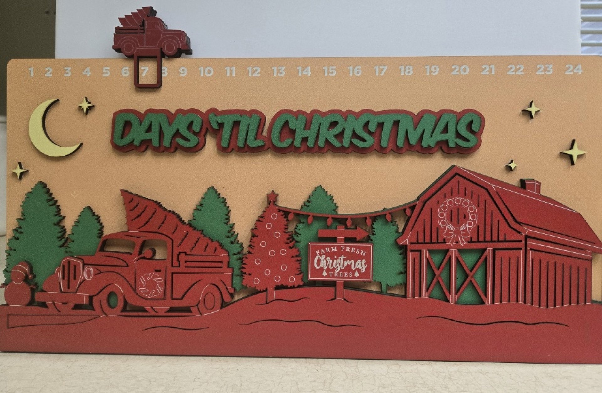 Design: A layered wooden scene with a vintage truck, pine trees, and a barn. The numbers 1-24 are featured on a track at the top.