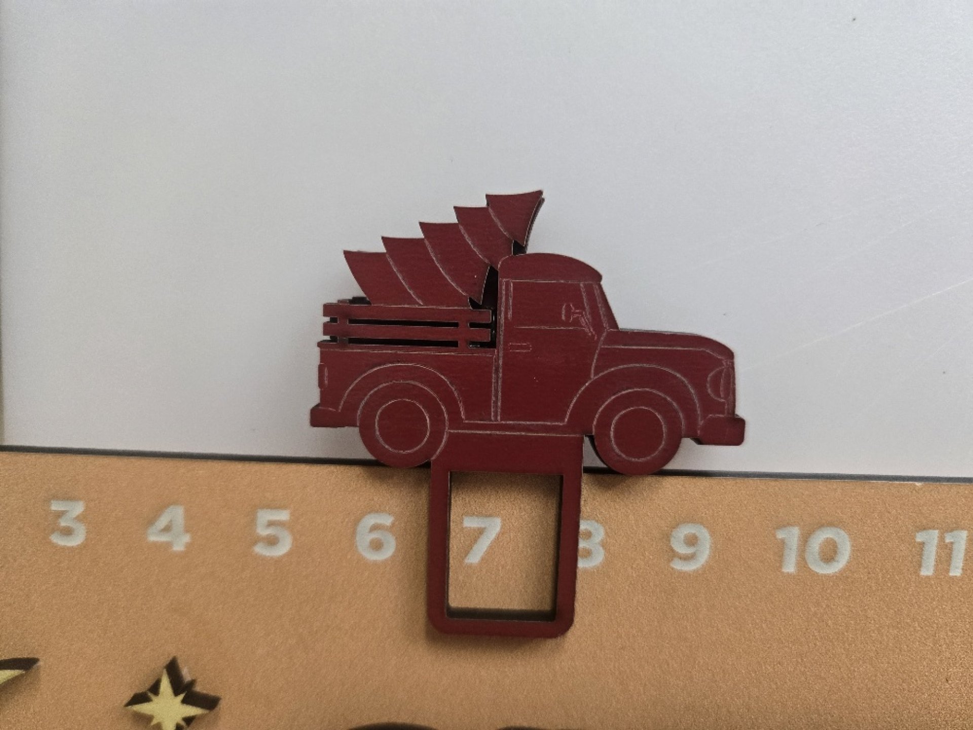 Function: An included wooden truck token is moved daily to count down the days until Christmas.
