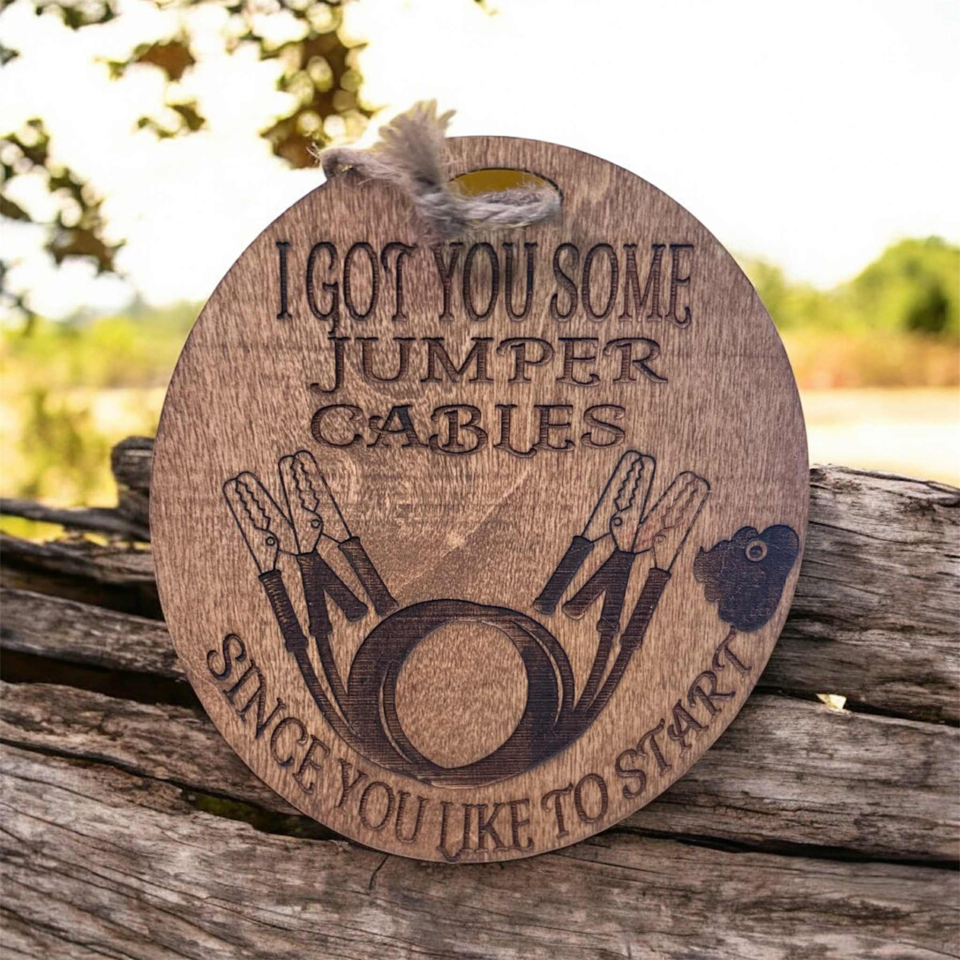 Engraved jumper cable graphic with rustic charm Solid wood plaque, perfect for garages, man caves, or front porches
