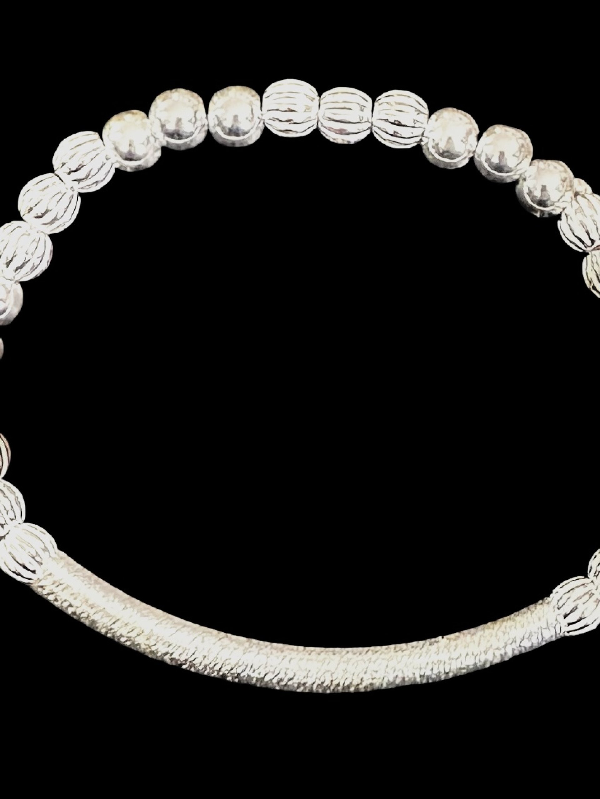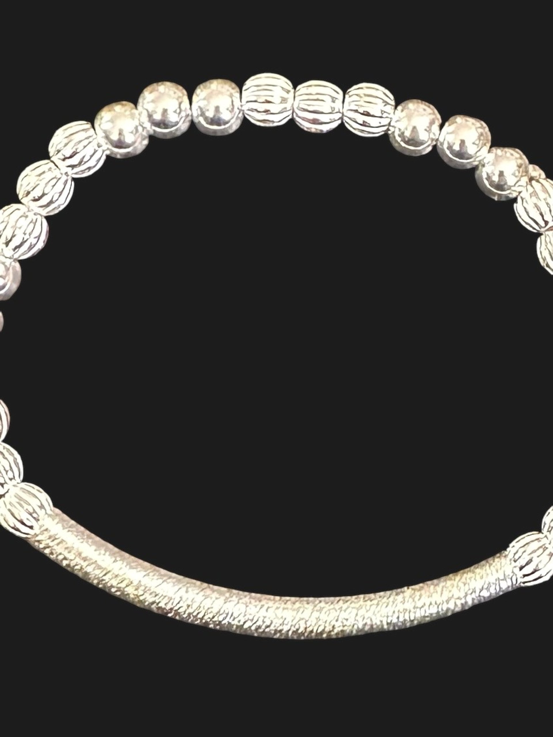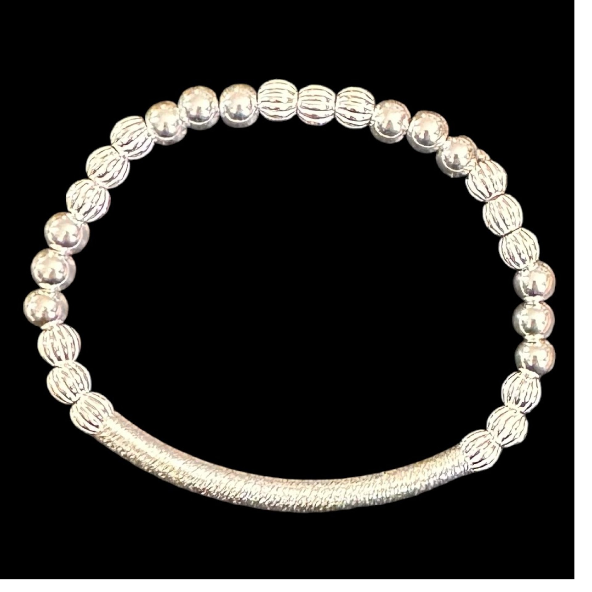 .925 Sterling Silver high-quality 5mm round smooth spacer ball beads are added with corrugated ball beads (NOT PLATED, WILL NOT TARNISH if cared for). This beaded patterned cut bar bracelet is made with a high-quality curbed patterned tube bar that is lightweight, easy to wear, and so comfortable that you can wear it anywhere. The bracelet has a stretch fit for easy roll-on/roll-off. It is made with a professional-strength elastic cord.