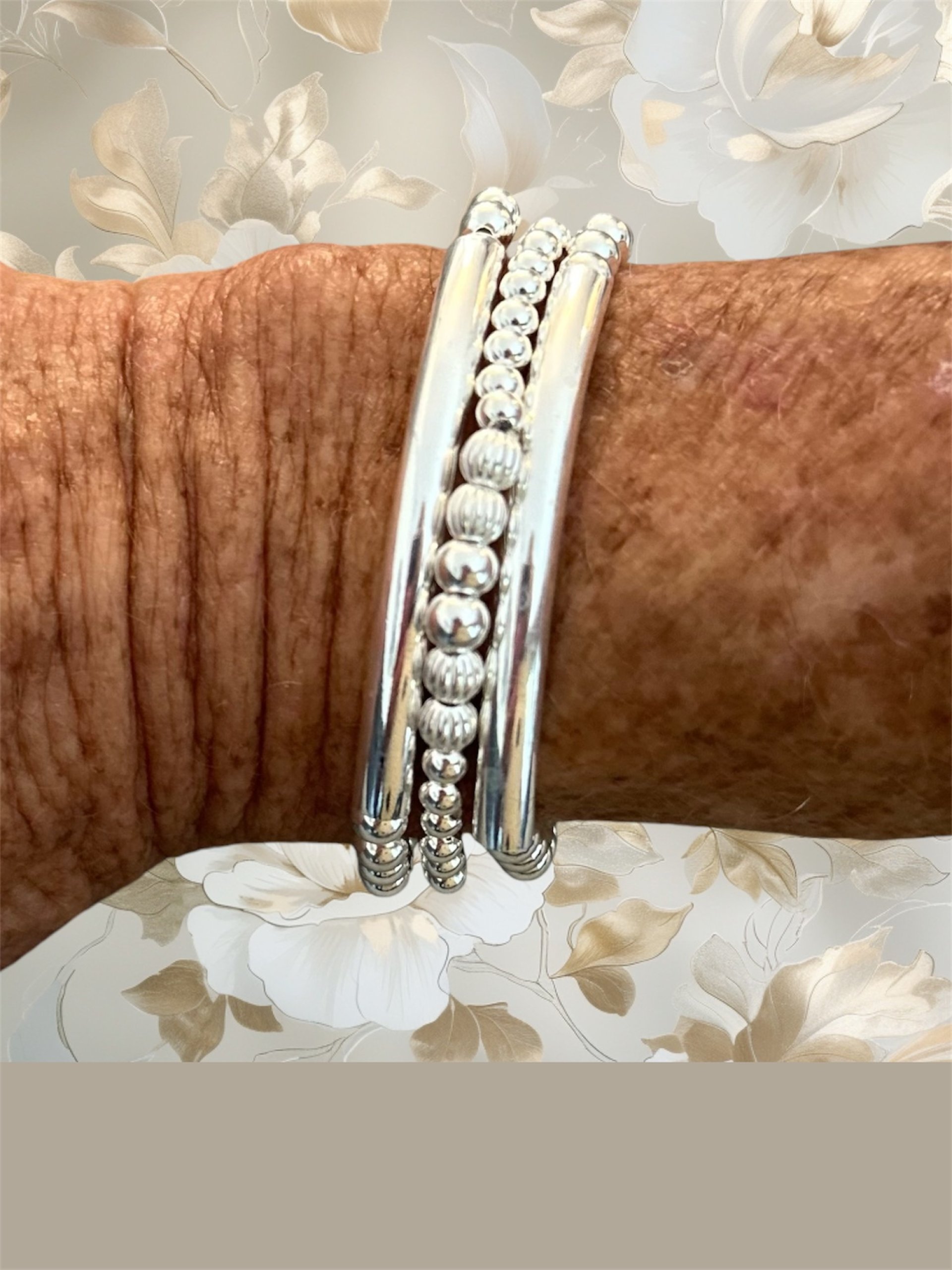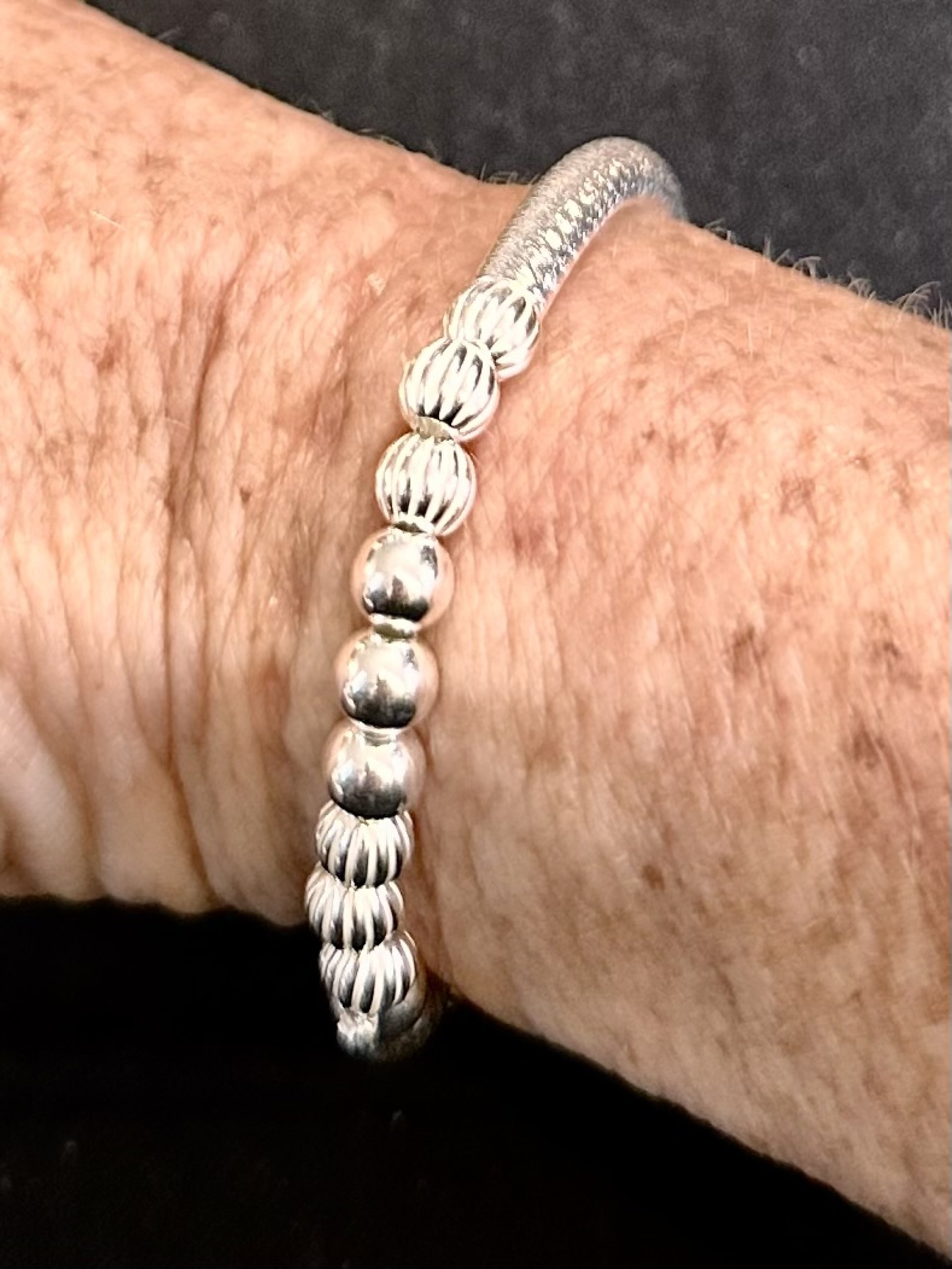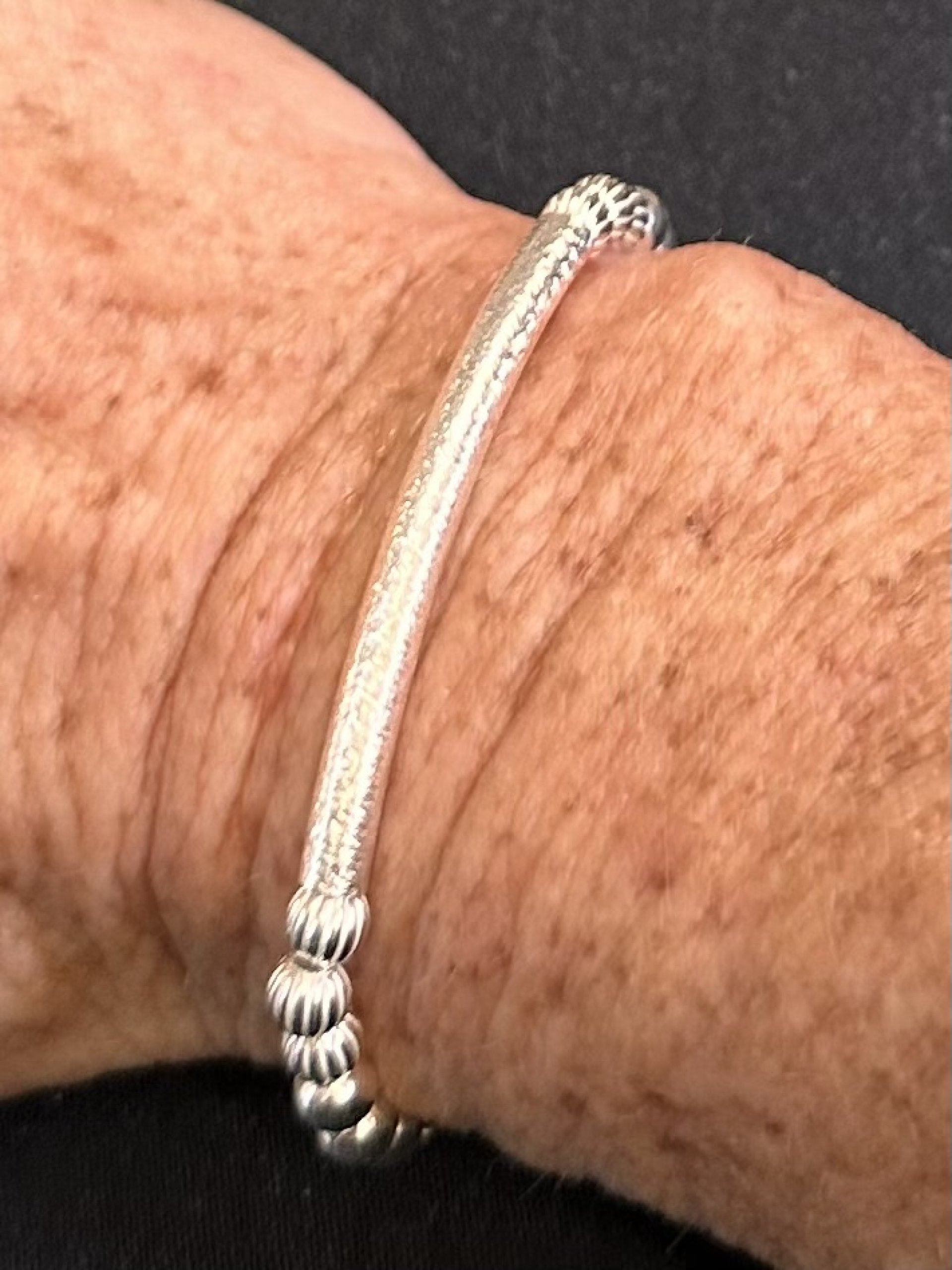 .925 Sterling Silver high-quality 5mm round smooth spacer ball beads are added with corrugated ball beads (NOT PLATED, WILL NOT TARNISH if cared for). This beaded patterned cut bar bracelet is made with a high-quality curbed patterned tube bar that is lightweight, easy to wear, and so comfortable that you can wear it anywhere. The bracelet has a stretch fit for easy roll-on/roll-off. It is made with a professional-strength elastic cord.