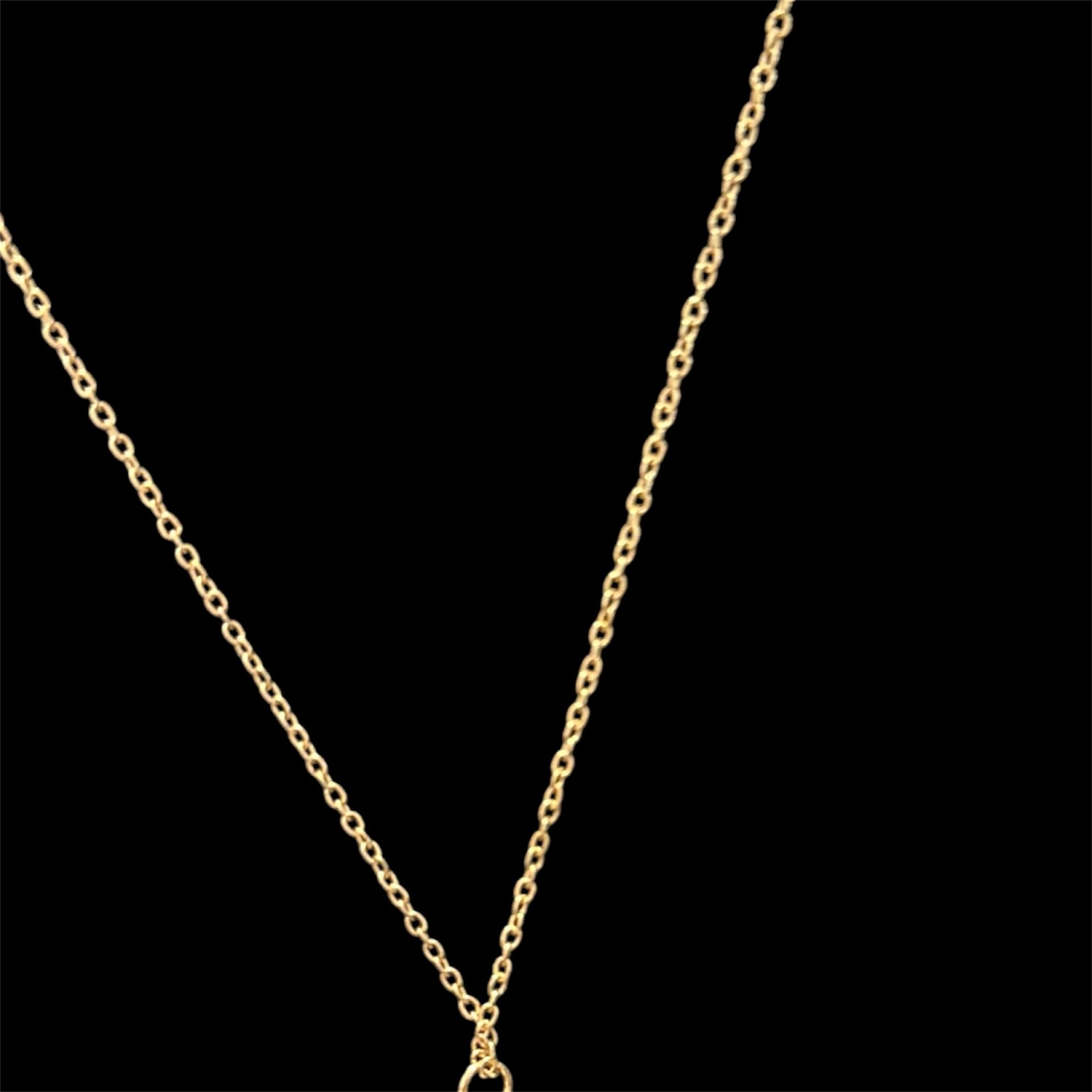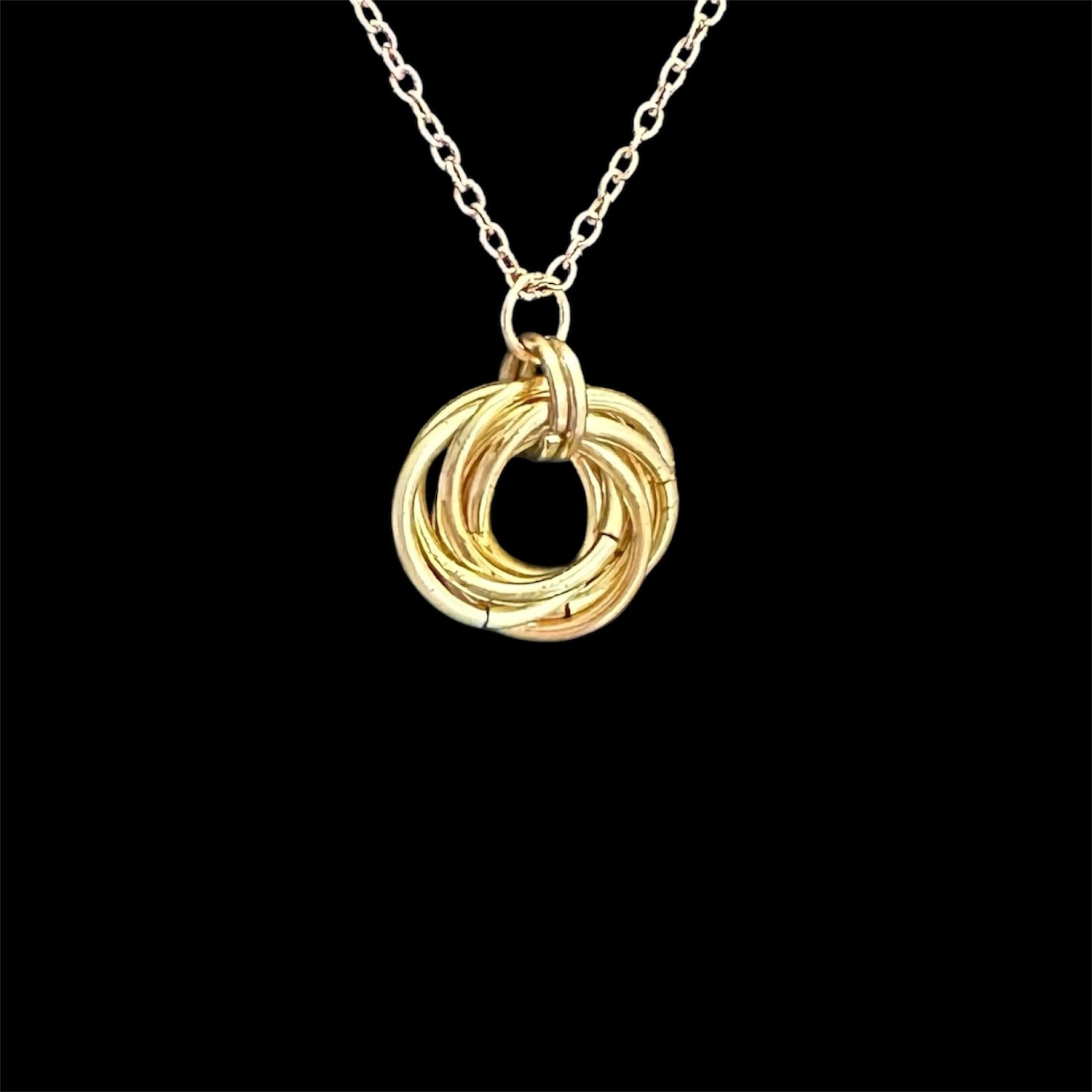 This beautiful, handcrafted small love knot necklace features six anodized aluminum gold jump rings intertwined and an 18" gold stainless steel chain with a sturdy lobster clasp.