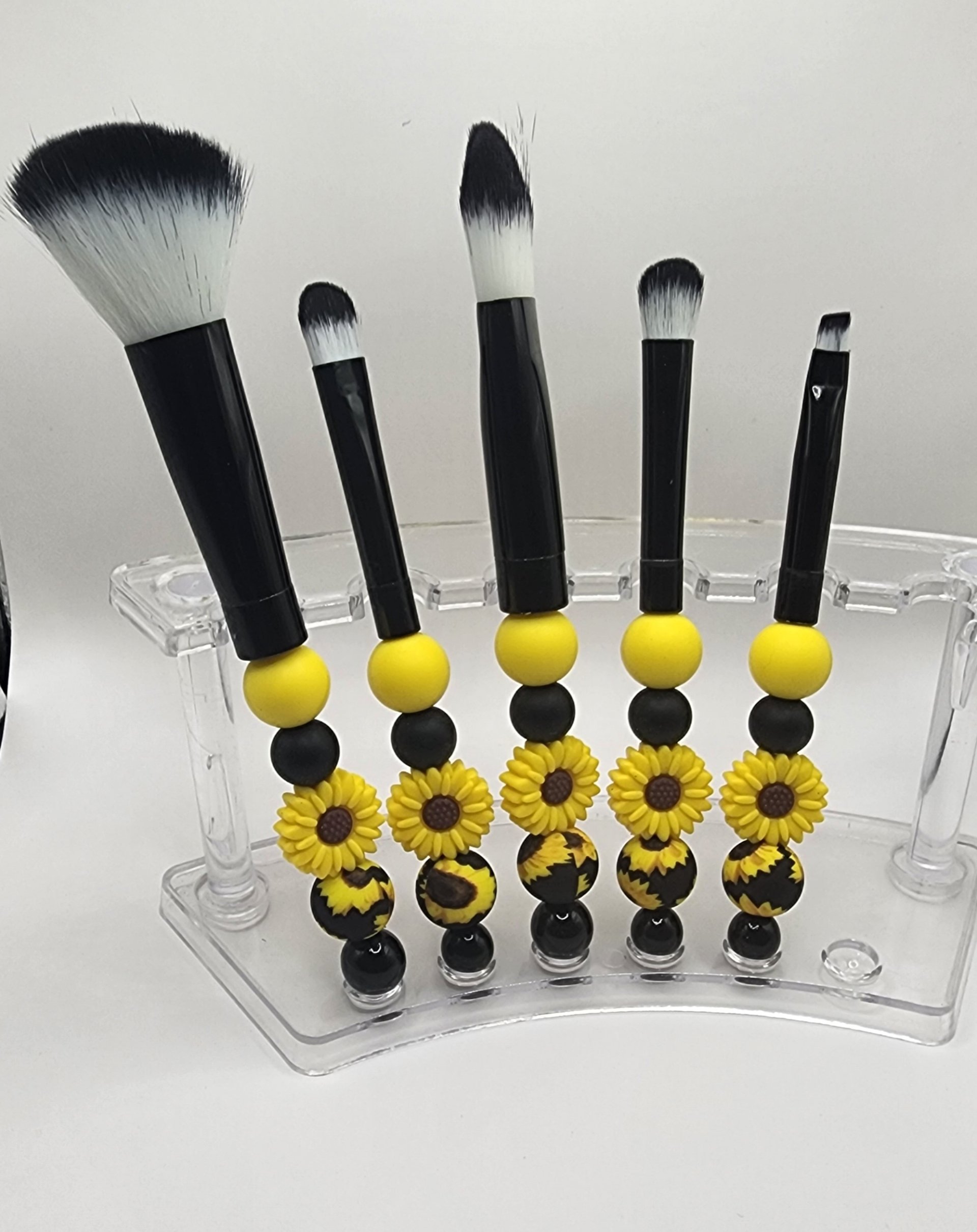 This makeup brush set features black hardware with black/white brush tips. There are five individual pieces designed with sunflower themed beads, as pictured.