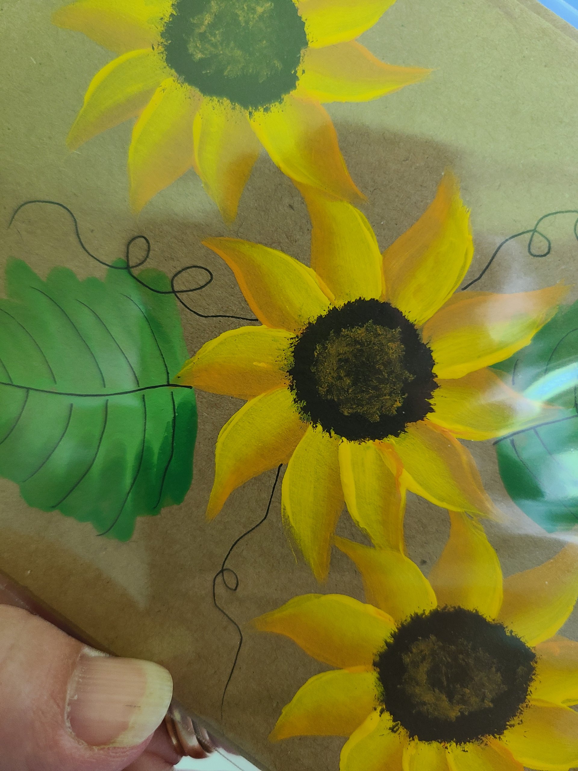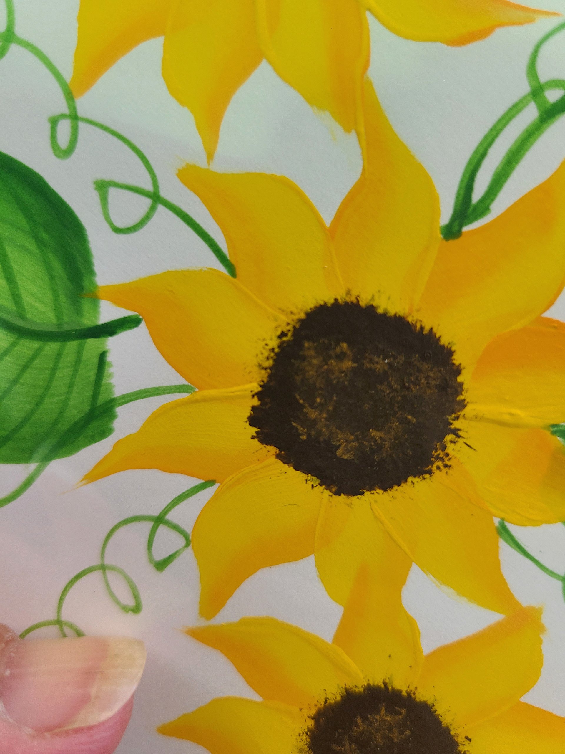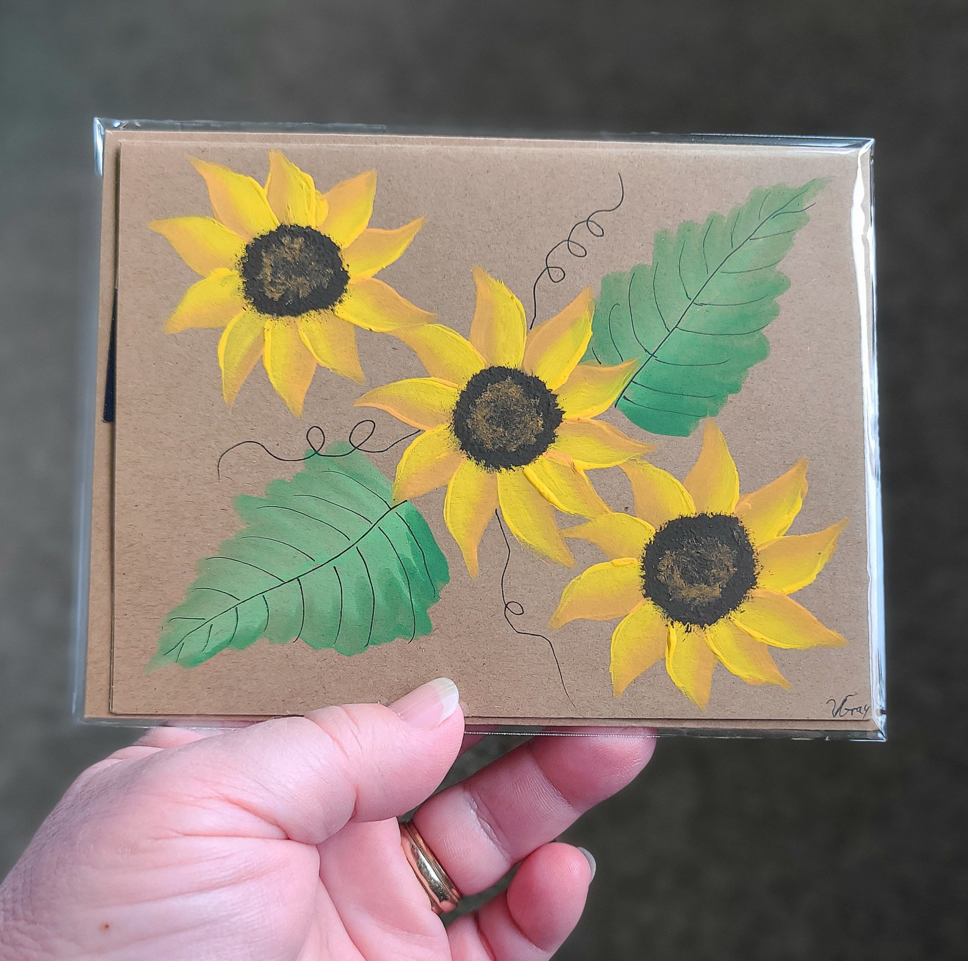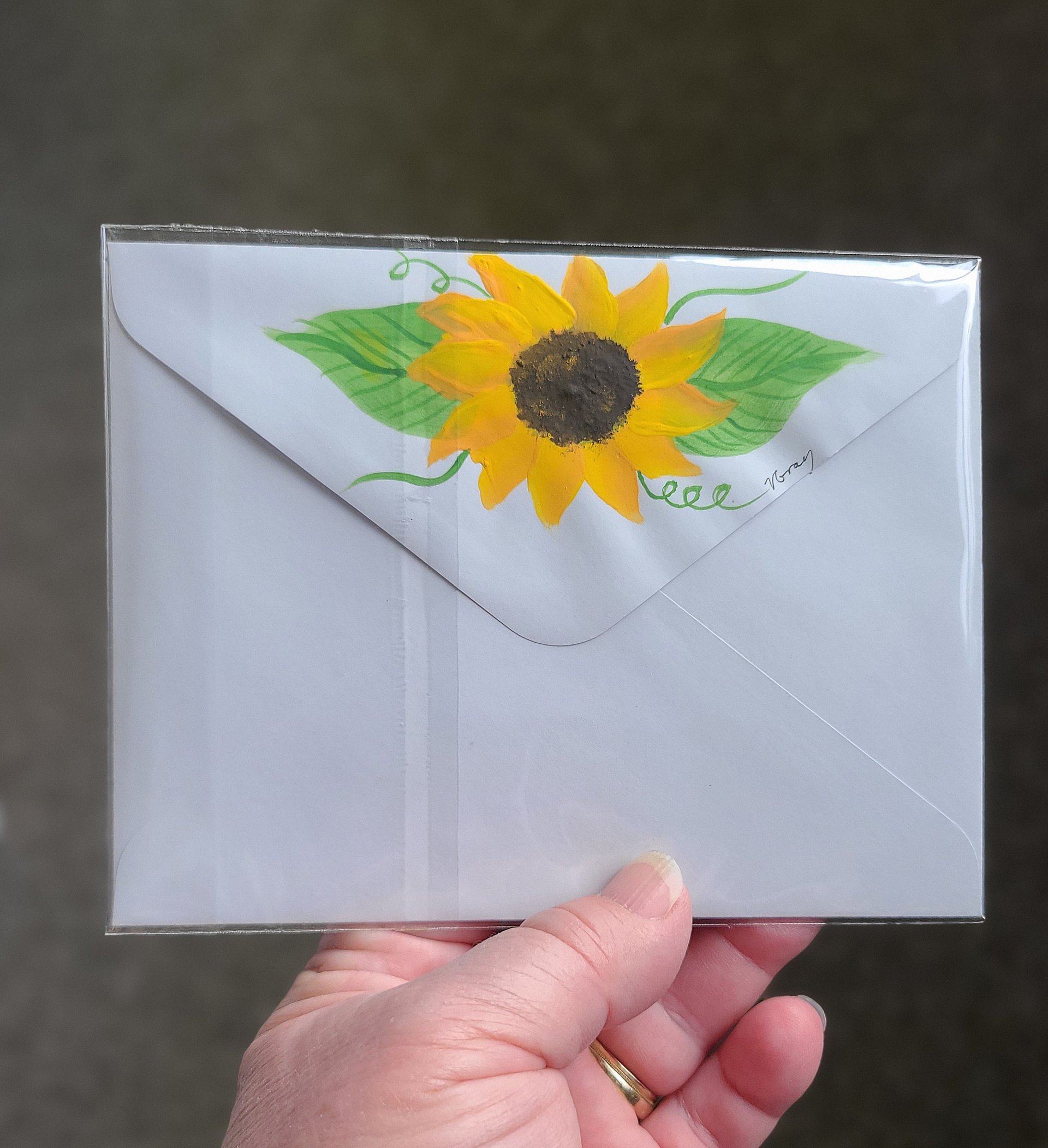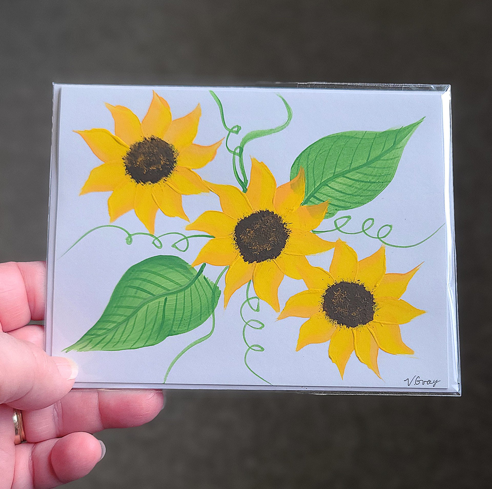 4 1/4" X 5 1/2" is the card size. Hand painted sunflowers make each card unique. All cards come with an envelope and unless otherwise noted and shown are blank inside.