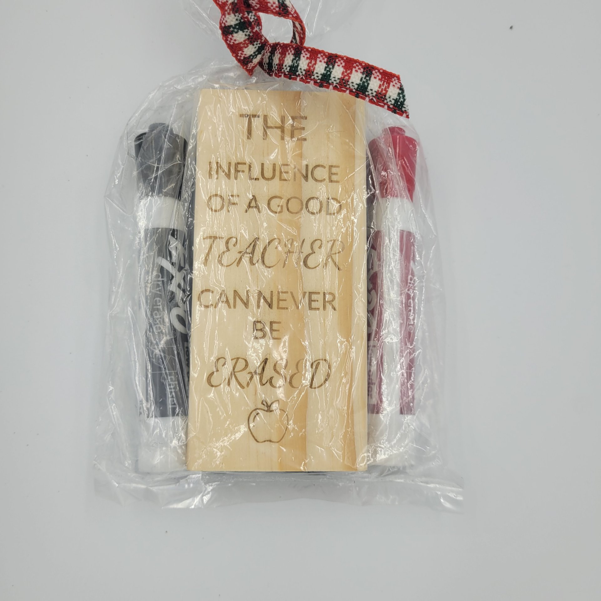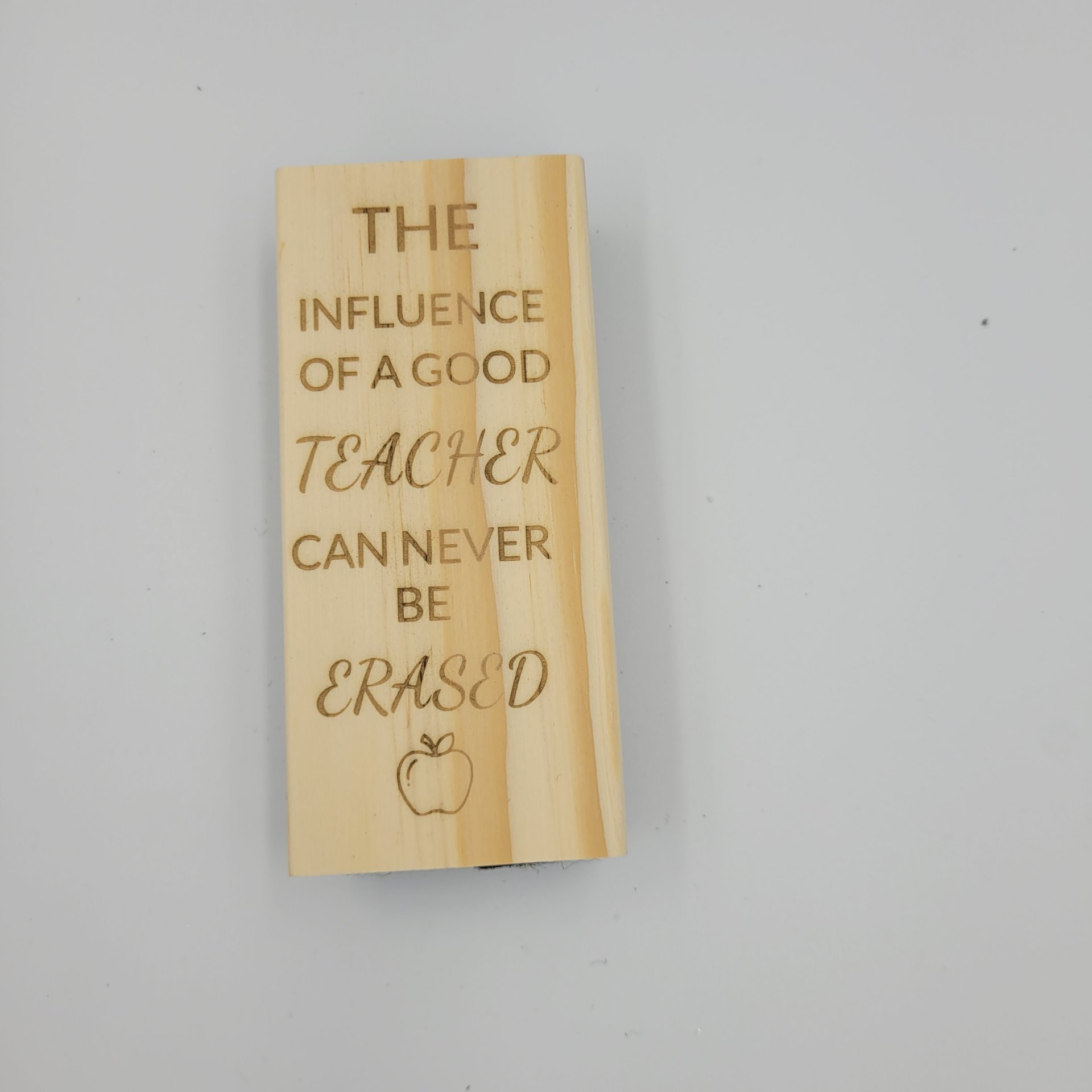 You can choose from two options: personalized erasers featuring your teacher's name or those adorned with the phrase "The influence of a good Teacher can NEVER be erased."