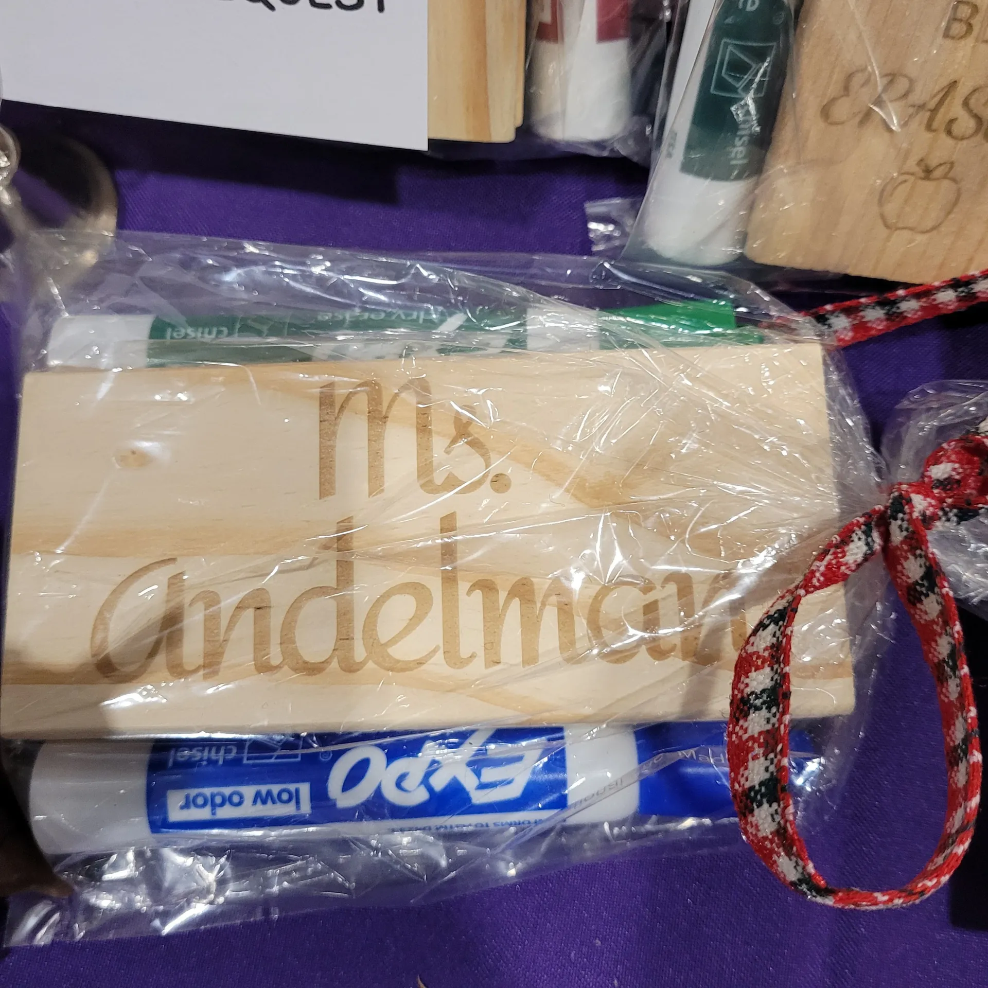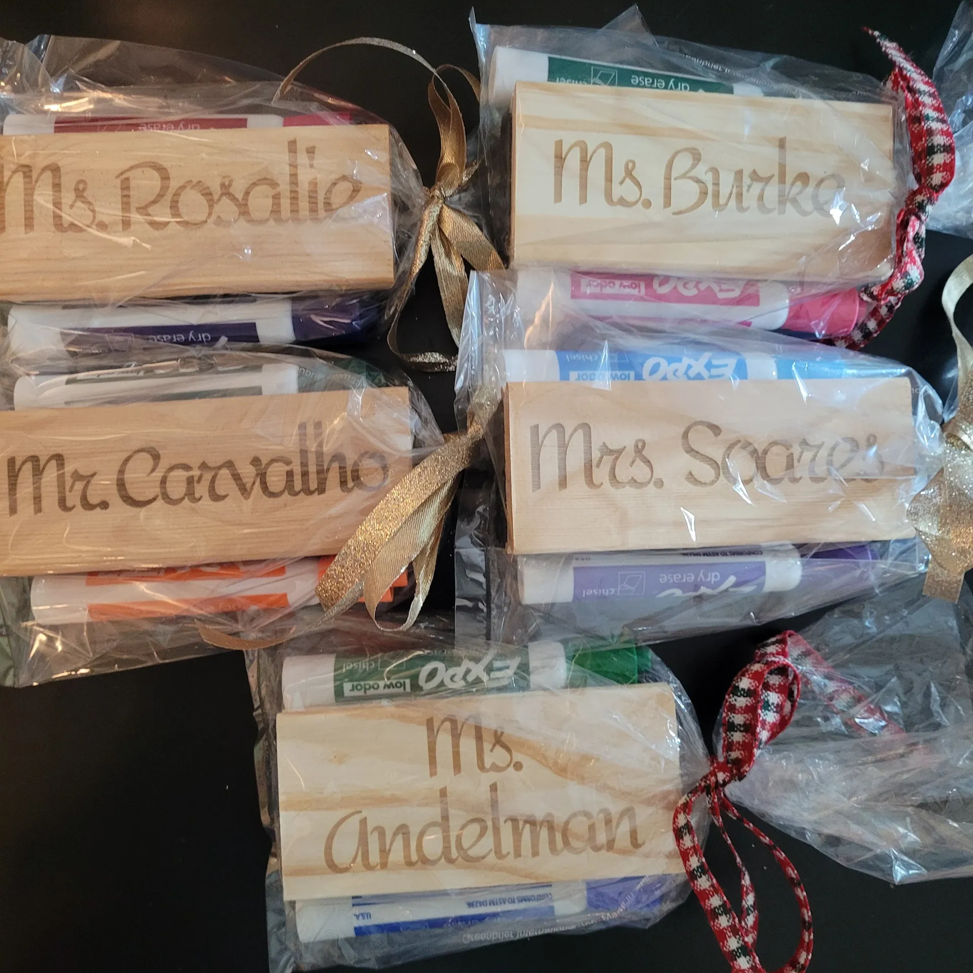These erasers are perfect gifts for teachers, friends, and colleagues. Each eraser is packaged in a clear plastic bag, accompanied by two different colored Expo markers, all tied together with a ribbon.