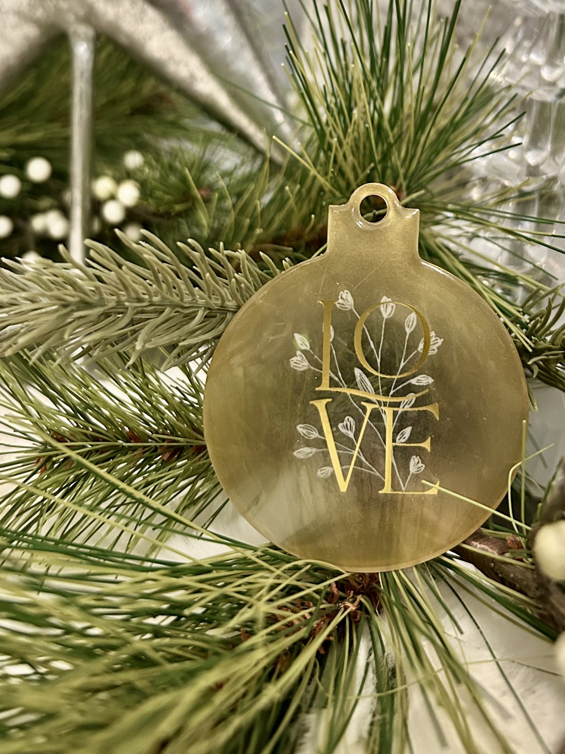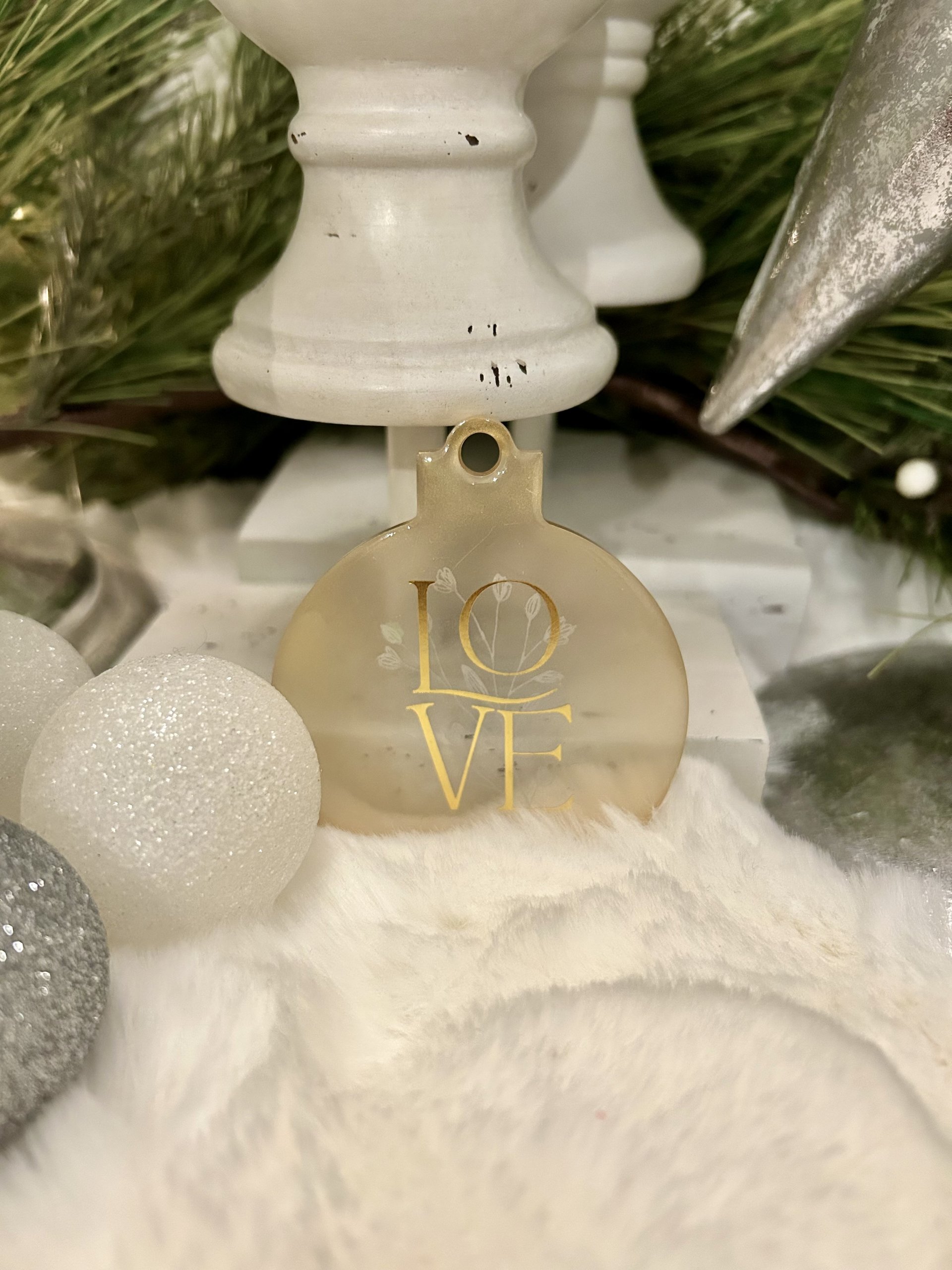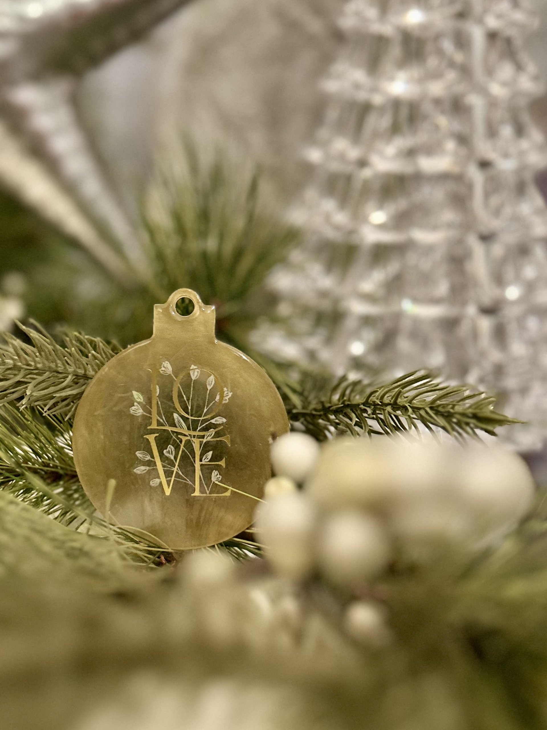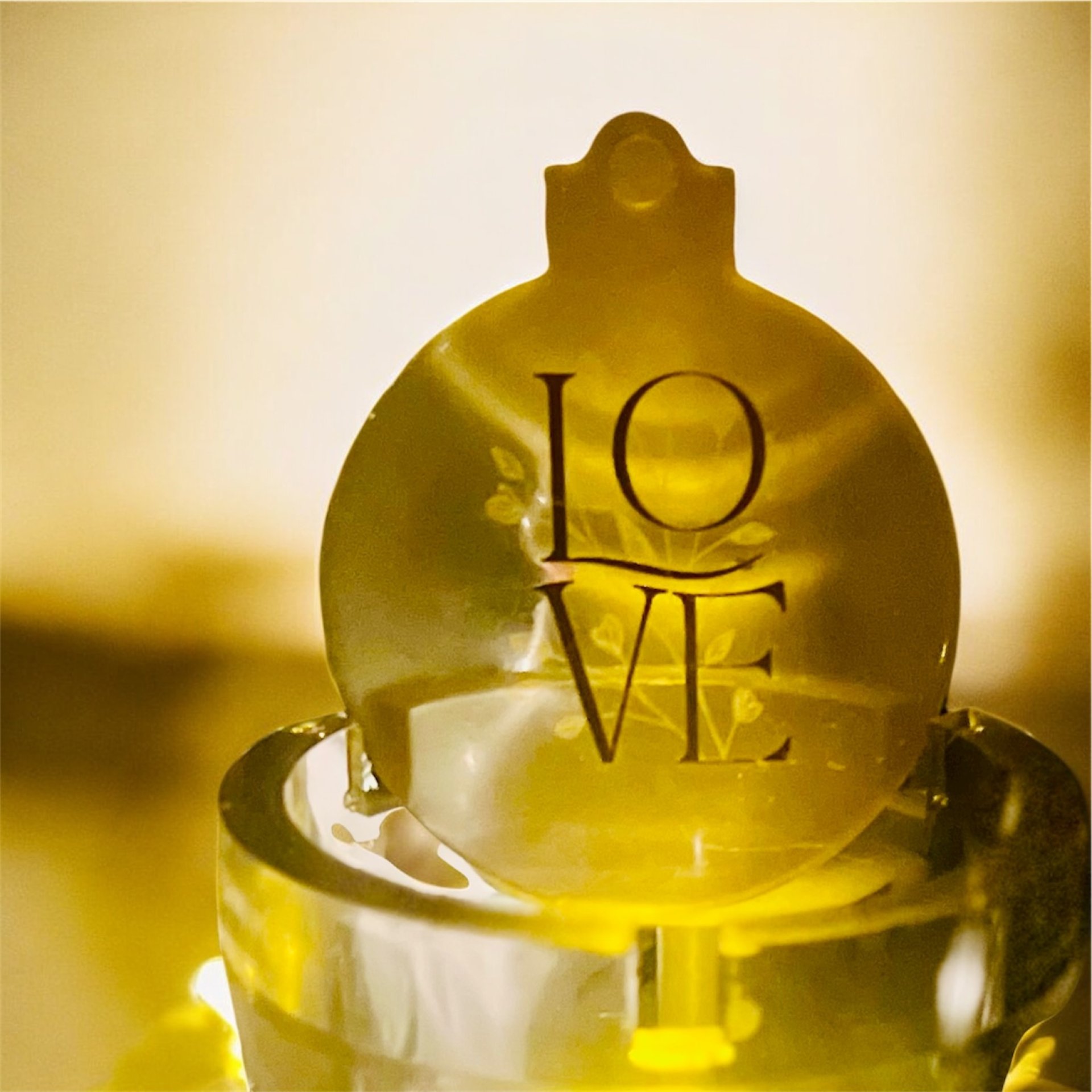 The Lightkeeper LOVE Ornament was created as a quiet reminder that light and love always belong together. Each ornament was hand poured in translucent resin, decorated with a delicate botanical LOVE motif, and enhanced with a dusting of gold mica powder that glows softly when illuminated.