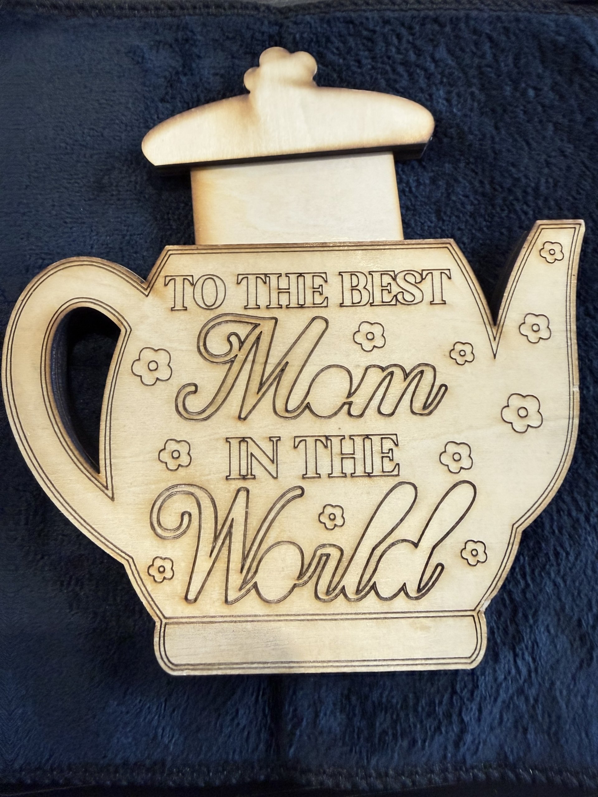 Show your appreciation with this beautifully handcrafted teapot-shaped wooden gift card holder, engraved with the heartfelt message: “To the Best Mom in the World.”
