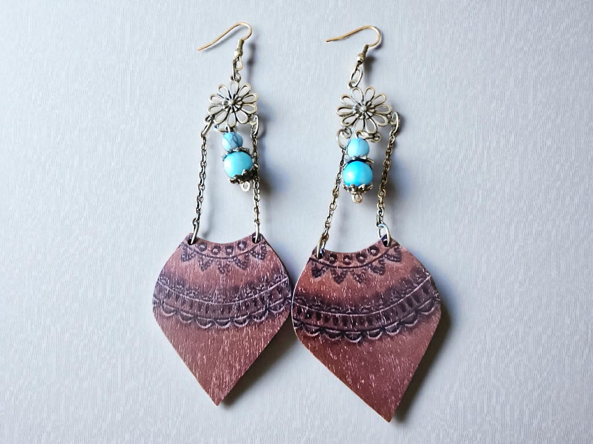 These stunning bohemian turquoise wood earrings showcase a unique tribal jewelry design featuring a charming bronze daisy and delicate dangle style, perfect for festival fashion. Crafted with exquisite attention to detail, these women's boho-style earrings are handmade from high-quality materials, making them an ideal accessory for any free-spirited fashion lover. Handmade Tribal Dangle Earrings: A Touch of Southwestern Style Handcrafted with antique bronze metal components and genuine turquoise beads for lasting quality Features delicate daisy charms and stamped leaf shapes that add a touch of natural beauty 2-inch length and 3/4-inch width create a perfect dangle design Bohemian style earrings perfect for festivals, concerts, or everyday wear Each pair handmade with care, ensuring a unique and special accessory