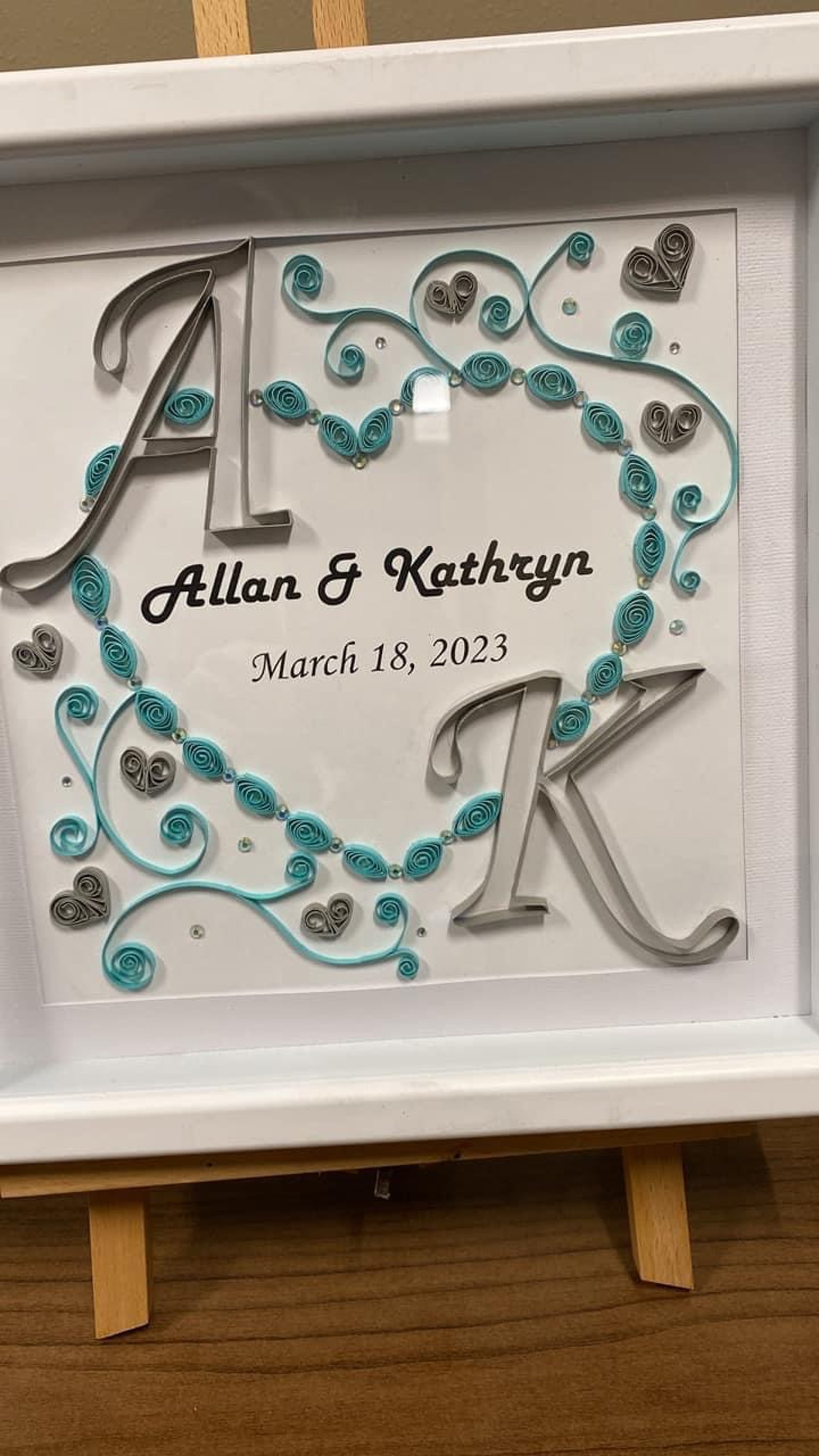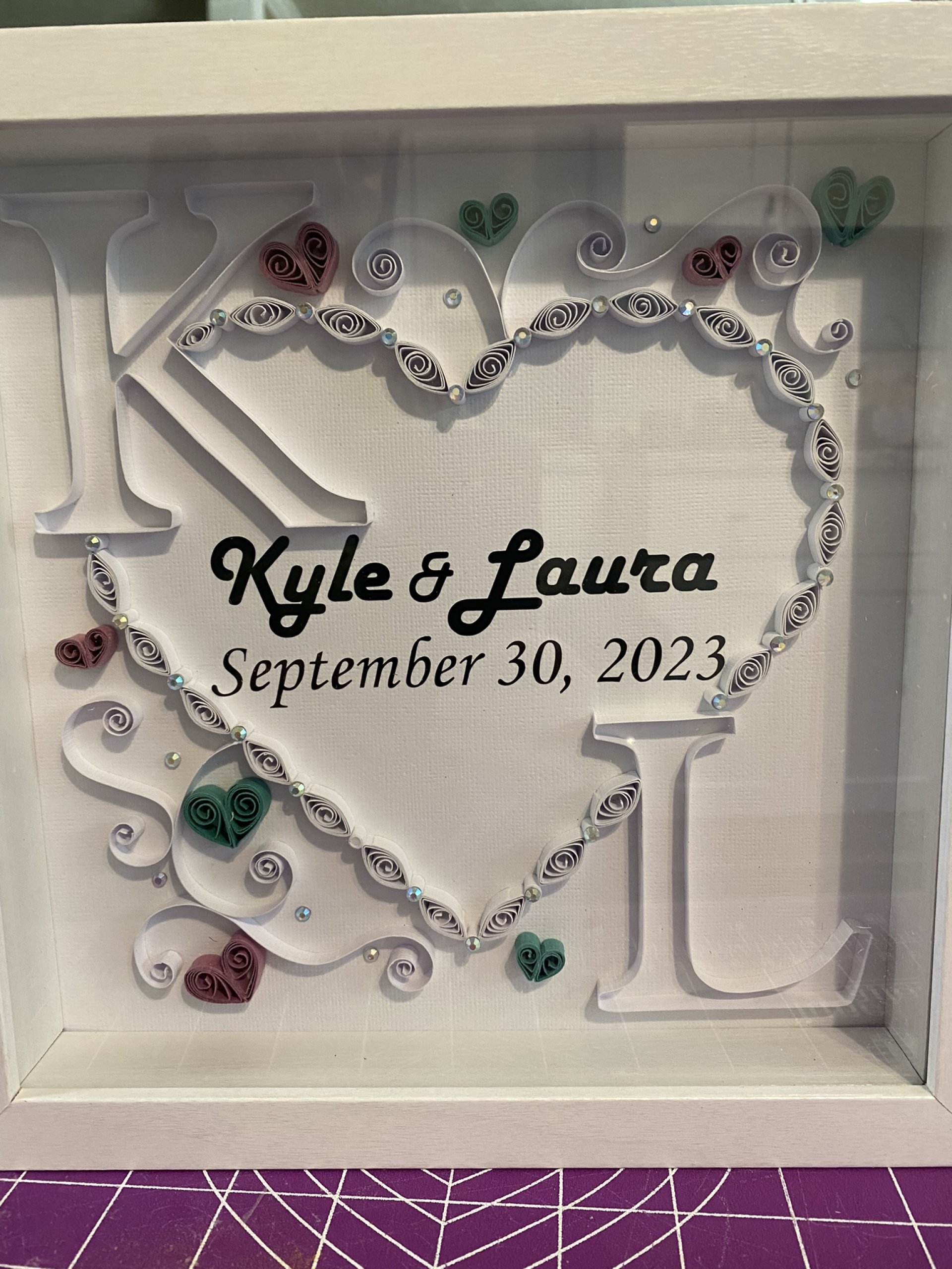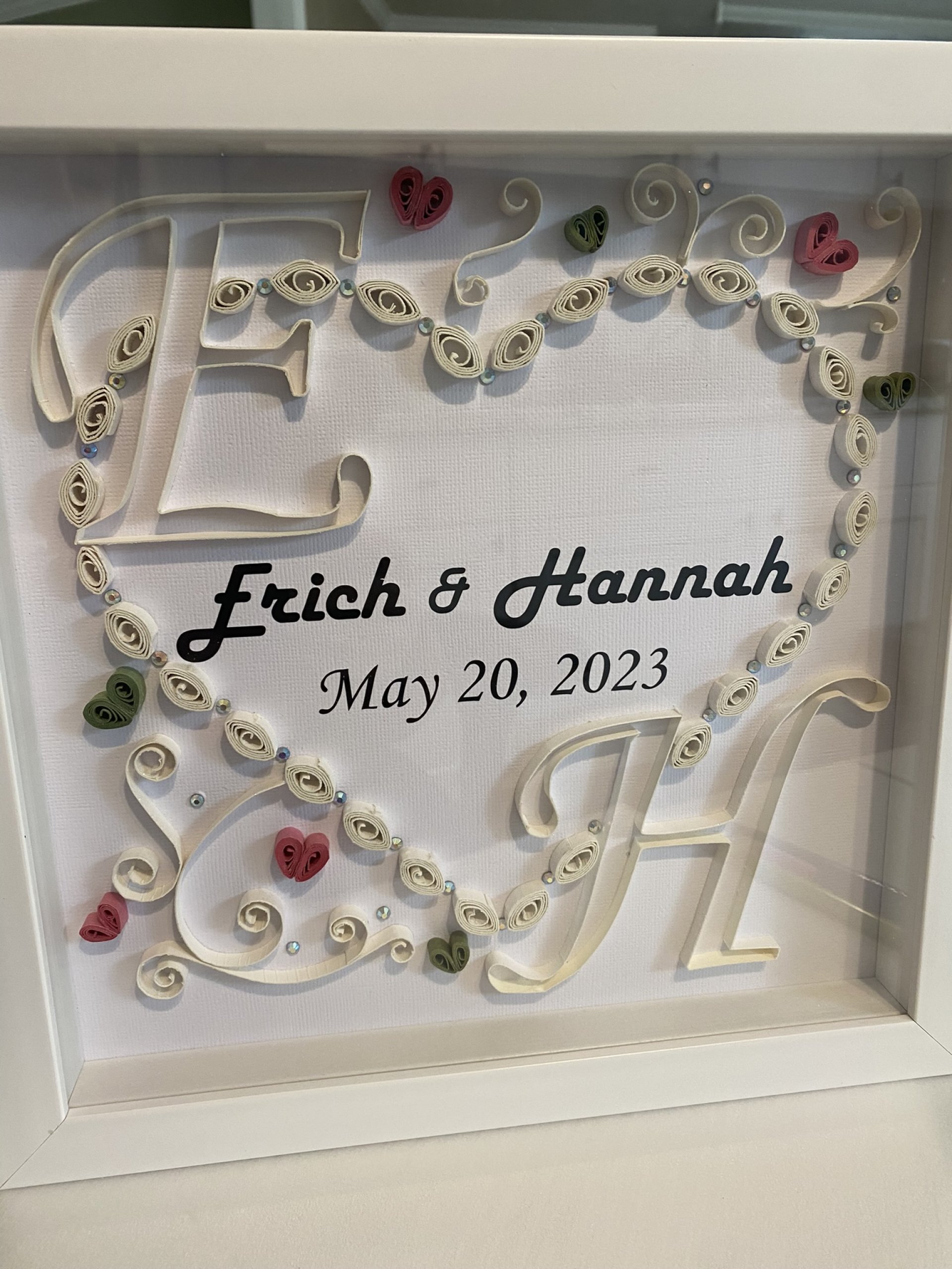 This is a handcrafted, framed piece of quilled art commemorating a special occasion. The artwork features two prominent initials rendered in quilling. These initials are beautifully intertwined with delicate swirls and flourishes of quilling. The design also incorporates small quilled hearts, adding a romantic touch. The entire piece is set against a white background and framed in a simple white frame, giving it a clean and elegant look. This unique and personalized artwork would make a perfect gift or keepsake.