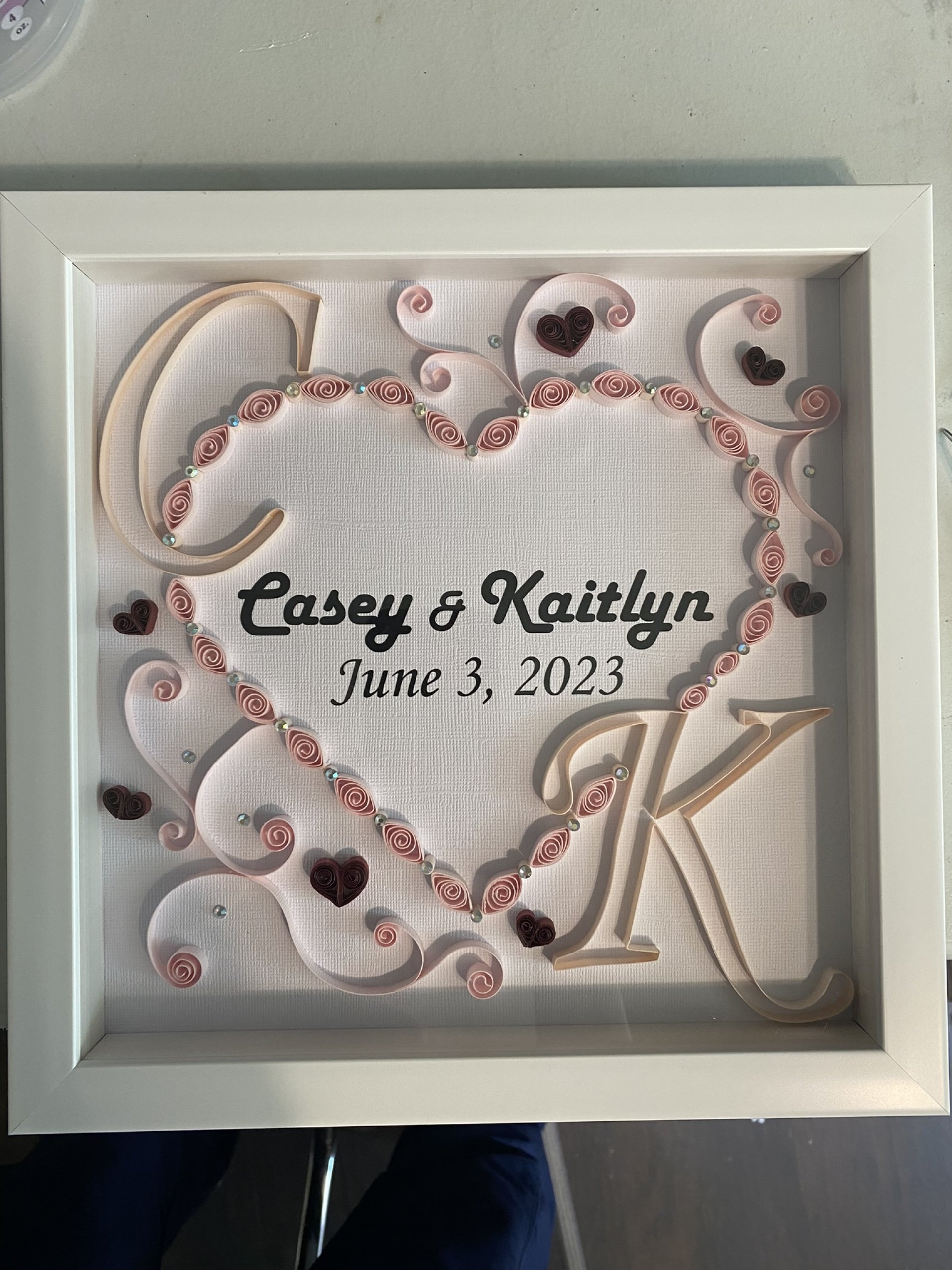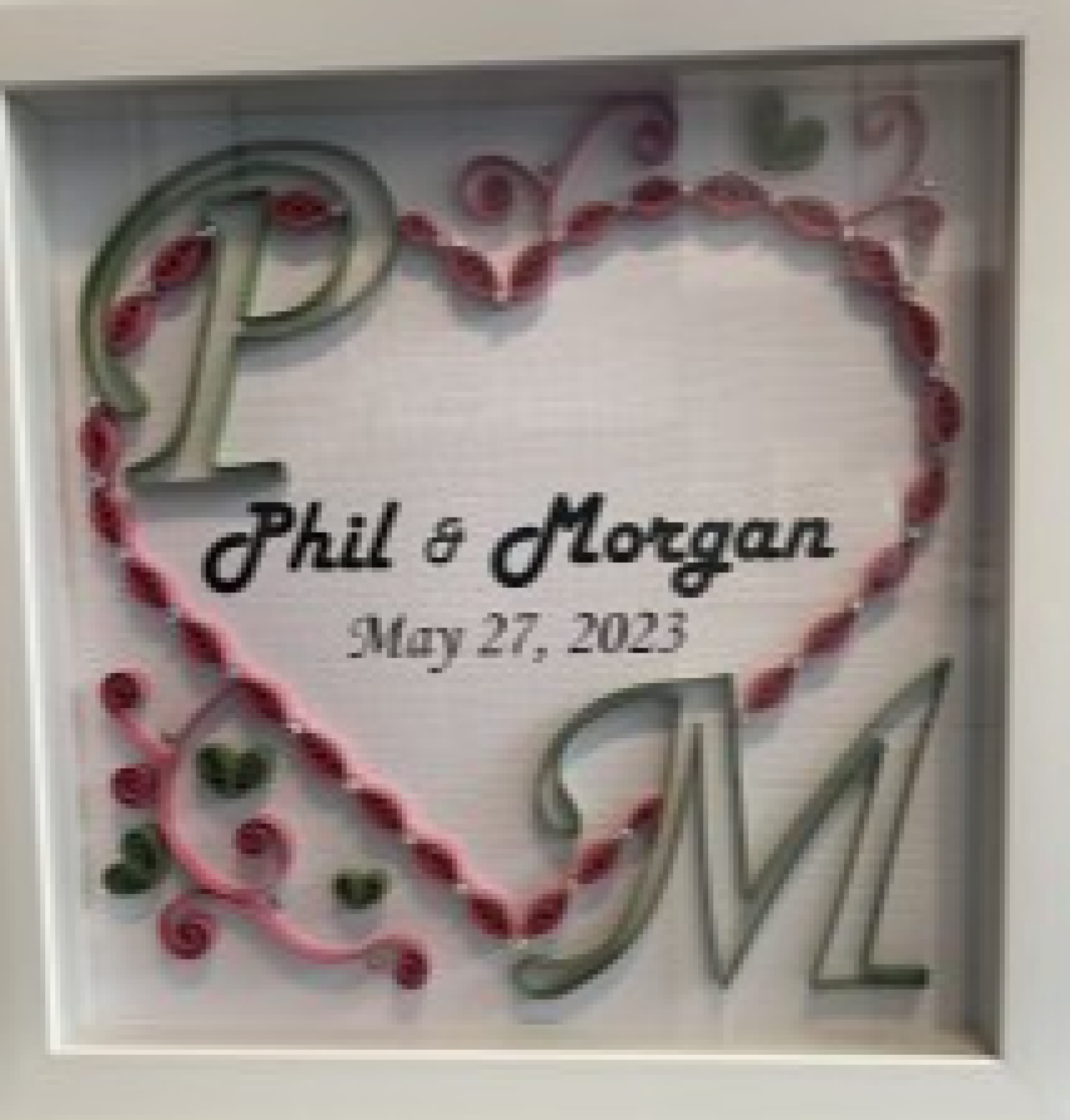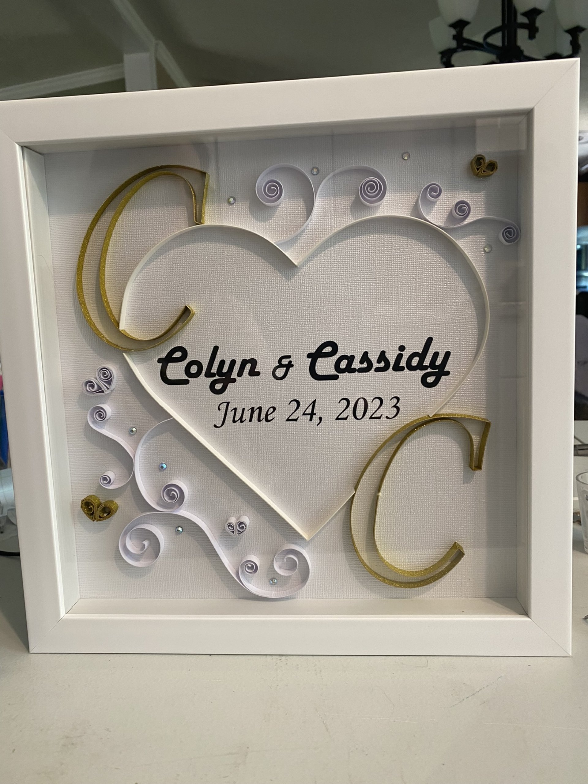 This is a handcrafted, framed piece of quilled art commemorating a special occasion. The artwork features two prominent initials rendered in quilling. These initials are beautifully intertwined with delicate swirls and flourishes of quilling. The design also incorporates small quilled hearts, adding a romantic touch. The entire piece is set against a white background and framed in a simple white frame, giving it a clean and elegant look. This unique and personalized artwork would make a perfect gift or keepsake.